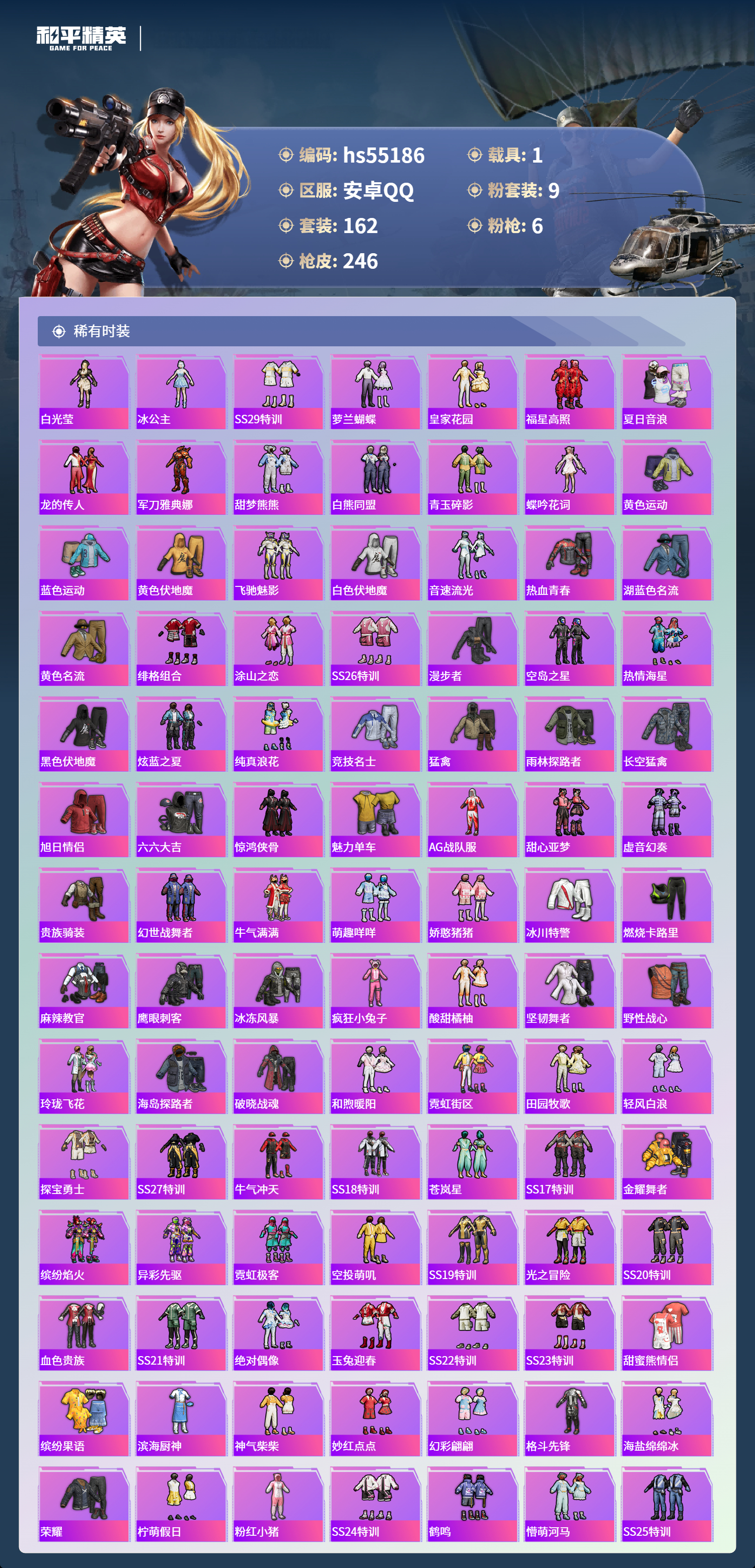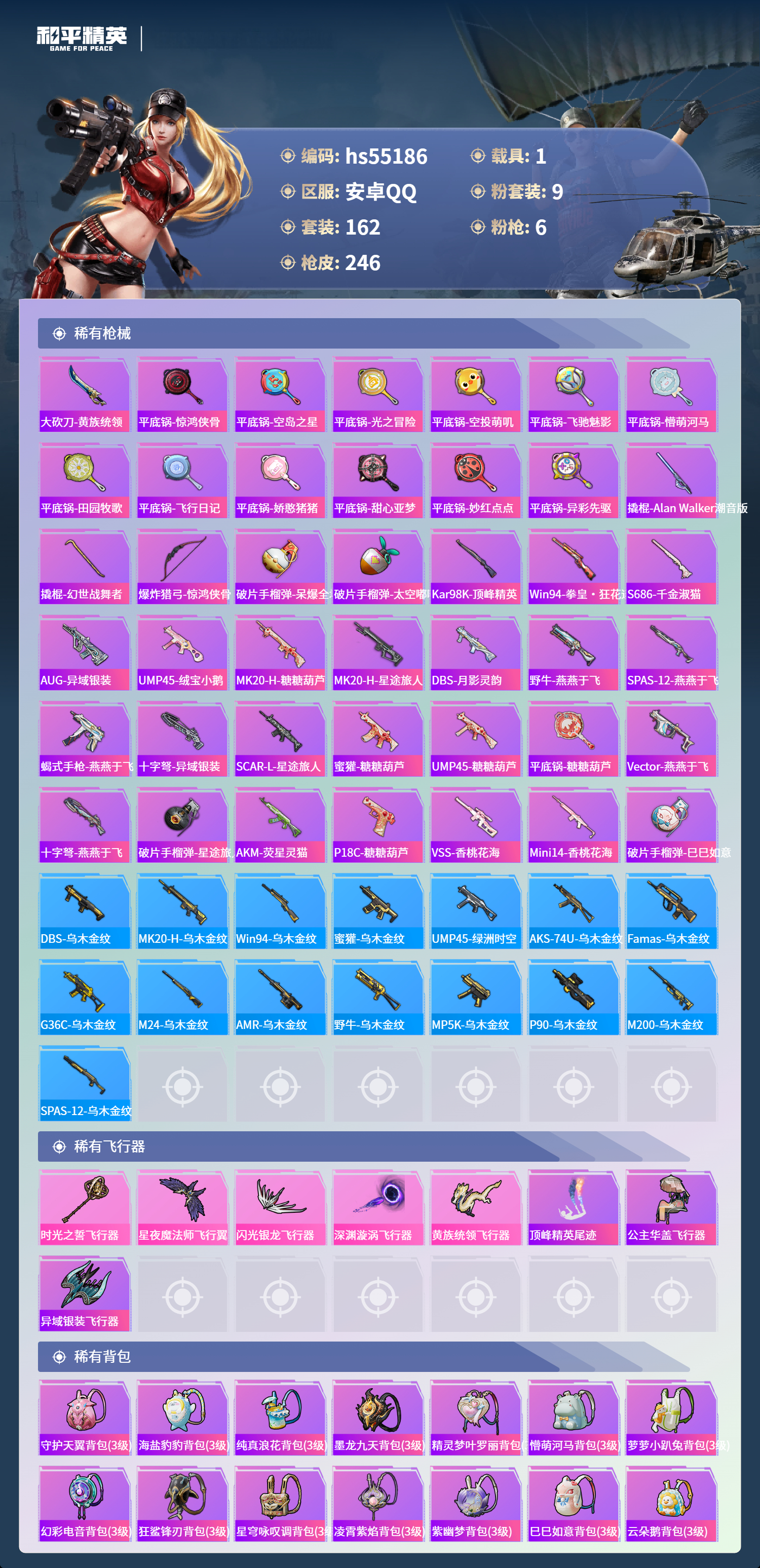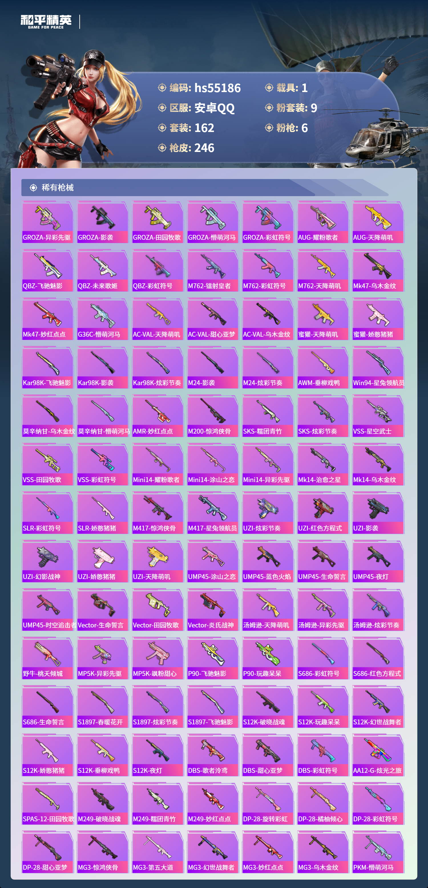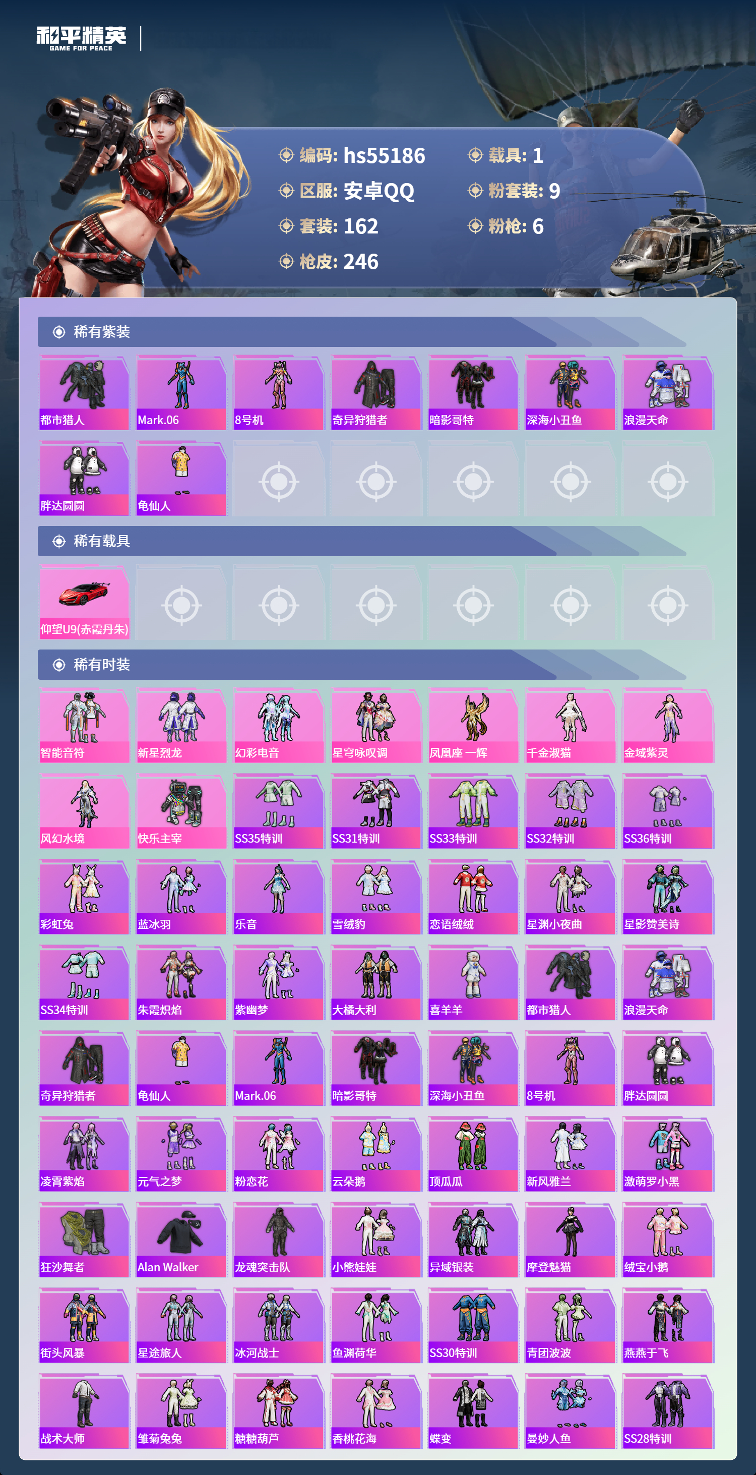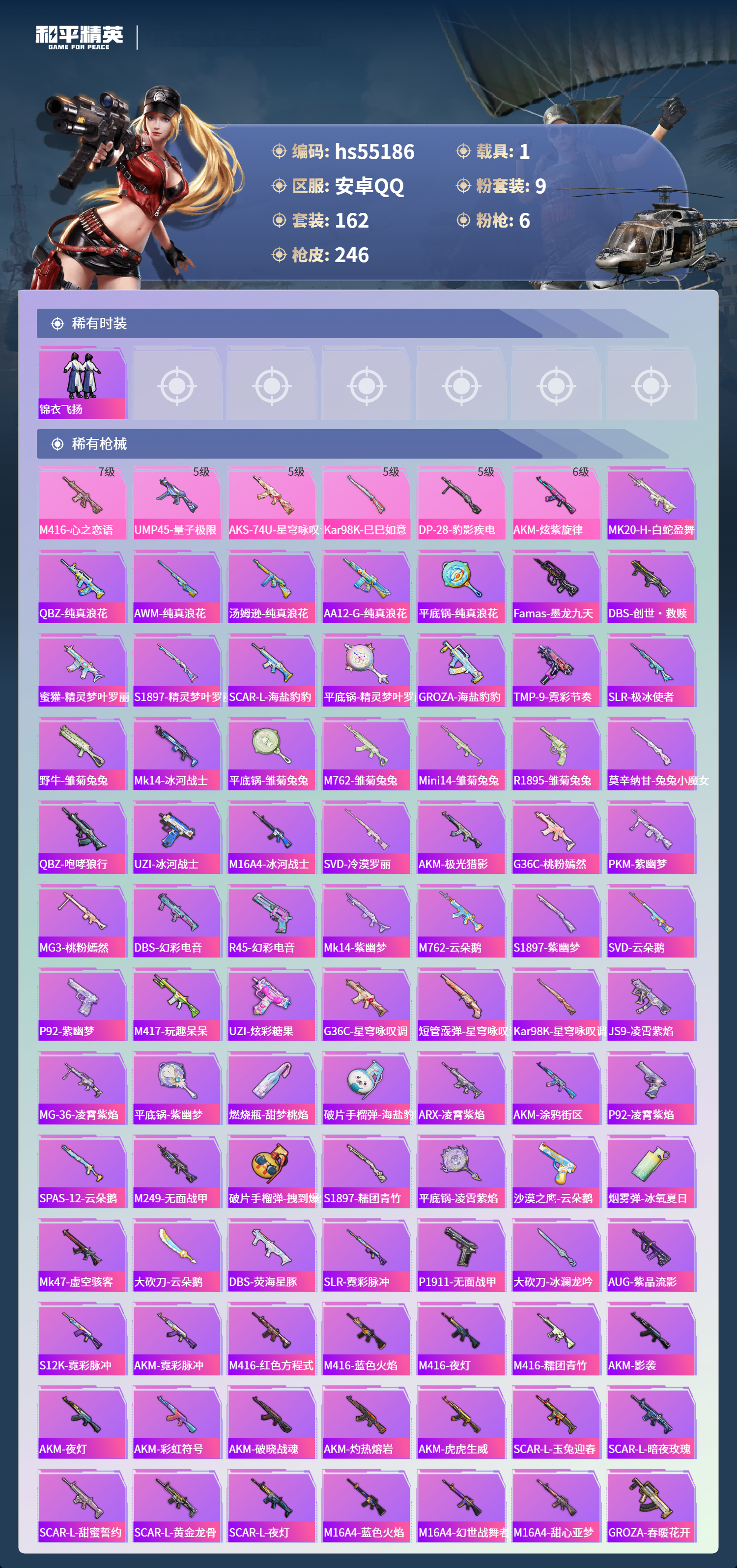 hs55186 安卓手q-13王牌印记-9粉装-6特效呛-1载具-76391热力值-162套装-246呛皮-4卓越印记【9粉装】套装-新星烈龙套装-快乐主宰套装-智能音符套装-幻彩电音套装-星穹咏叹调角色-千金淑猫角色-风幻水境角色-金域紫灵角色-凤凰座 一辉【6特效呛】akm-炫紫旋律/6级kar98k-巳巳如意/5级m416-心之恋语/7级aks-74u-星穹咏叹调/