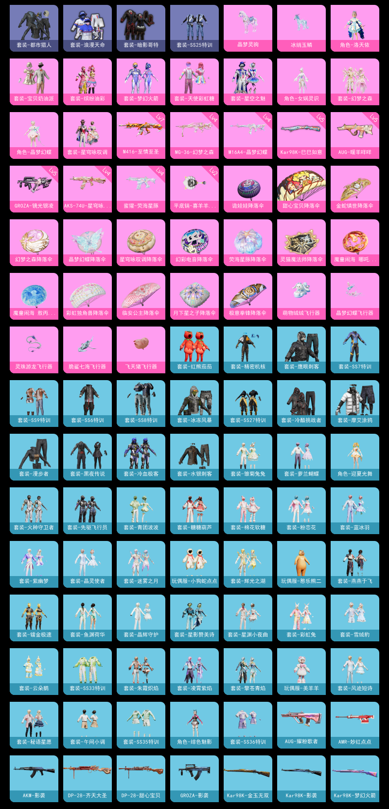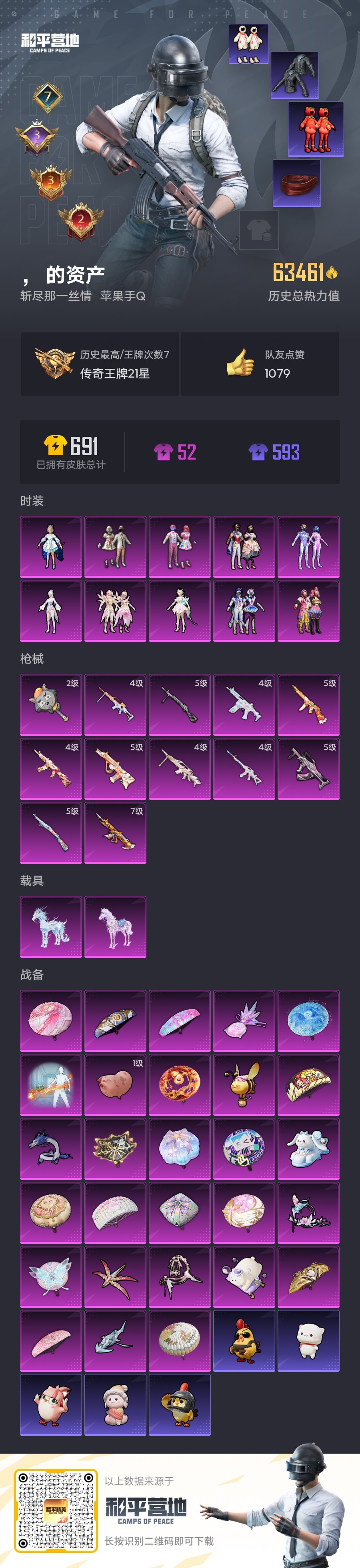 【和平精英】【txhp5429】10粉装,12特效呛,2载具,历史最高段位:传奇王牌21星 王牌印记7次 热力值:63461,132套装,199呛械,223装备,112战备;套装:套装-宝贝奶油派,套装-天使彩虹糖,套装-梦幻火箭,套装-缤纷油彩,套装-星空之魅,角色-洛天依,角色-女娲灵识,套装-幻梦之森,角色-晶梦幻蝶,套装-星穹咏叹调,套装-青年教官,套装-蓝色运动,套装-白色伏地魔,套装-黑色伏地魔,套装-竞技名士,套装-湖蓝色名流,套装-长空猛禽,套装-漫步者,套装-竞技勇士朋克,套装-旭日情侣,套装-都市猎人,套装-水银刺客,套装-浪漫天命,套装-特战装甲,套装-战地菁英,套装-战地督导,套装-特殊使命,套装-甜蜜告白,套装-春日漫步,套装-鹰眼刺客,套装-冰冻风暴,套装-冷酷挑战者,套装-街头潮人,套装-蓝彩潮人,套装-魅力单车,套装-雪山征服者,套装-坚韧舞者,套装-夜莺强袭者,套装-野性战魂,套装-雪山精英,套装-传奇侦探,套装-摩艾涂鸦,套装-暗影哥特,套装-精密机核,套装-缤纷果语,套装-特种空勤,套装-冷血极客,套装-ss3特训,套装-梦魇先生,套装-黑夜传说,套装-破蛋小黄鸡,套装-疯狂小兔子,套装-阳光火鸡,套装-ss5特训,套装-圣诞大吉,套装-冰原使者,套装-凛冬战士,套装-金鼠迎春,套装-北国孤狼,套装-ss6特训,套装-ss7特训,套装-ss8特训,套装-夏日音浪,套装-ss9特训,套装-牛气满满,套装-战术大师,套装-红熊茄茄,套装-绯格组合,套装-王牌教练,套装-青玉碎影,套装-龟仙人,套装-ss25特训,套装-香桃花海,套装-龙的传人,套装-漫游都市,套装-ss27特训,套装-恋语绒绒,角色-迎夏光舞,套装-雏菊兔兔,套装-萝兰蝴蝶,角色-绯色魅影,套装-先驱飞行员,套装-火种守卫者,套装-异域银装,套装-星途旅人,套装-ss30特训,套装-青团波波,套装-棉花软糖,套装-糖糖葫芦,玩偶服-憨乐熊二,套装-镭金极速,套装-绒兔团圆,套装-绒宝小鹅,套装-ss31特训,套装-鱼渊荷华,套装-燕燕于飞,套装-智谋强哥,角色-风玲,套装-晶灵使者,套装-辉光之湖,套装-紫幽梦,套装-迷雾之月,套装-粉恋花,套装-晶辉守护,套装-ss33特训,套装-云朵鹅,玩偶服-小狗蛇点点,套装-巳巳如意,套装-ss32特训,套装-彩虹兔,套装-蓝冰羽,套装-顶瓜瓜,套装-雪绒豹,套装-大橘大利,套装-星渊小夜曲,套装-炫彩糖果,套装-星影赞美诗,玩偶服-美羊羊,套装-元气之梦,套装-ss34特训,套装-擎苍青焰,套装-朱霞炽焰,套装-游乐,套装-凌霄紫焰,套装-薄荷星砂,套装-ss35特训,套装-午间小调,套装-秘语星愿,套装-风迹短诗,套装-ss36特训,套装-雪国风尚,套装-萌鸡速递;呛皮:scar-l-炫彩节奏,scar-l-彩虹符号,scar-l-星途旅人,scar-l-小狗蛇点点,scar-l-乌木金纹,akm-影袭,akm-涂鸦街区,akm-龙的传人,akm-玄冥寒域,akm-霓彩脉冲,akm-乌木金纹,m762-诡娃娃,m762-甜心宝贝,m762-牛气冲天,m762-天降萌叽,m762-雏菊兔兔,m762-云朵鹅,m762-乌木金纹,7级m416-至情至圣,m416-蓝色火焰,m416-红色方程式,m416-乌木金纹,5级groza-镜光银凌,groza-影袭,groza-晶梦幻蝶,groza-荧海星豚,groza-乌木金纹,4级蜜獾-荧海星豚,蜜獾-糖糖葫芦,蜜獾-绯穹魔姬,蜜獾-幻梦之森,蜜獾-风迹短诗,蜜獾-冰澜龙吟,蜜獾-乌木金纹,5级aug-暖羊咩咩,aug-甜蜜菠萝,aug-耀粉歌者,aug-异域银装,aug-金蛇镇世,aug-绝对恒星,aug-冰晶雪宝,aug-紫晶流影,aug-乌木金纹,ac-val-乌木金纹,famas-霓彩脉冲,famas-乌木金纹,mk47-风迹短诗,4级m16a4-晶梦幻蝶,m16a4-生命誓言,m16a4-红色方程式,m16a4-星际漫游,m16a4-冰河战士,m16a4-乌木金纹,q-诡娃娃,q-绒兔团圆,arx-凌霄紫焰,g36c-星穹咏叹调,5级kar98k-巳巳如意,kar98k-红色方程式,kar98k-王子的夏天,kar98k-影袭,kar98k-金玉无双,kar98k-梦幻火箭,kar98k-顶峰精英,kar98k-星穹咏叹调,svd-云朵鹅,m24-影袭,m24-未来战士,m24-冰封烈焰,amr-妙红点点,amr-喜羊羊与灰太狼,win94-晶梦幻蝶,win94-乌木金纹,m200-乌木金纹,莫辛纳甘-风迹短诗,slr-极冰使者,slr-霓彩脉冲,mini14-金鼠迎春,mini14-梦幻火箭,mini14-香桃花海,mini14-雏菊兔兔,mini14-镭金极速,mini14-乌木金纹,mk14-紫幽梦,mk14-薄荷星砂,m417-惊鸿侠骨,vss-荒野猎神,vss-香桃花海,vss-幻梦之森,mk20-h-糖糖葫芦,mk20-h-狂鲨锋刃,mk20-h-乌木金纹,mk12-风迹短诗,mk12-乌木金纹,sks-诡娃娃,sks-乌木金纹,p90-巳巳如意,p90-金蛇镇世,p90-乌木金纹,野牛-雏菊兔兔,野牛-燕燕于飞,ump45-生命誓言,ump45-粉色回忆,ump45-诡娃娃,ump45-海盐豹豹,ump45-糖糖葫芦,ump45-绒宝小鹅,ump45-乌木金纹,5级汤姆逊-热量炸弹,uzi-影袭,uzi-金玉无双,uzi-逆行者qq,uzi-天降萌叽,uzi-啾咪啾咪,uzi-炫彩糖果,uzi-乌木金纹,vect-生命誓言,vect-金玉无双,vect-燕燕于飞,vect-乌木金纹,js9-凌霄紫焰,4级aks-74u-星穹咏叹调,aks-74u-鸡智如我,aks-74u-乌木金纹,s1897-紫幽梦,s1897-糯团青竹,s12k-玩趣呆呆,s12k-蓝晶绮麟,s12k-霓彩脉冲,s12k-乌木金纹,spas-12-燕燕于飞,spas-12-狂鲨锋刃,spas-12-云朵鹅,spas-12-乌木金纹,s686-生命誓言,s686-冰封烈焰,s686-白勺歌姬,s686-巳巳如意,s686-乌木金纹,dbs-月下星之子,dbs-荧海星豚,dbs-风迹短诗,aa12-g-绒兔团圆,mg3-蓝晶绮麟,mg3-霓彩脉冲,m249-破晓战魂,m249-糯团青竹,m249-无面战甲,m249-绯穹魔姬,4级mg-36-幻梦之森,4级mg-36-沧焰双生,mg-36-凌霄紫焰,5级dp-28-豹影疾电,dp-28-甜心宝贝,dp-28-齐天大圣,pkm-紫幽梦,pkm-小狗蛇点点,p92-雷霆特警,p92-紫幽梦,p92-凌霄紫焰,p1911-冰封烈焰,r1895-雏菊兔兔,沙墨之鹦-云朵鹅,短管霰弹-星穹咏叹调,蝎式手呛-燕燕于飞,p18c-糖糖葫芦,r45-幻彩电音,大砍刀-盛世惊鸿,大砍刀-鬼刀,大砍刀-云朵鹅,撬棍-