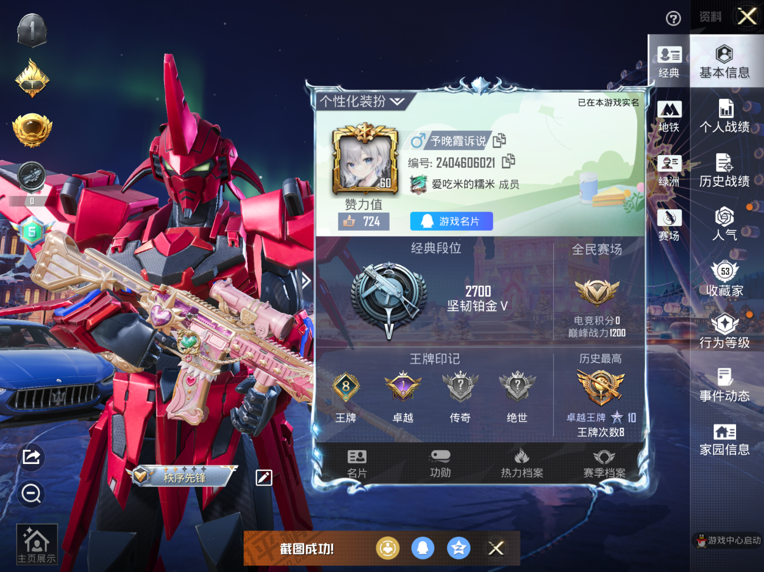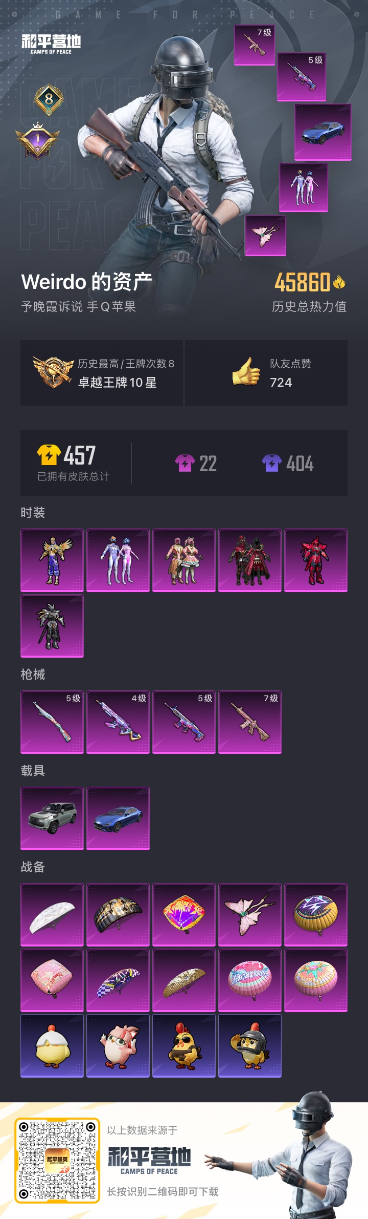 _2333360-2载具-91套装-128呛皮-苹果q-1稀有2载具6粉装4特效呛11热门91套装128呛皮45860热力值8印记历史卓越王牌10星【1稀有】akm-缤纷海域【2载具】仰望u8龙石绿玛莎拉蒂蓝色【6粉装】梦幻火箭光极星草莓生巧炙焰红王炙焰赤龙飓风飞鹰【4特效呛】m416-心之恋语7级kar98k-巳巳如意5级m762-电糖天使4级scar-l-机甲封神5级【11热门】团圆交子瑞龙福将粉红小猪梦之呓语抹茶蜜豆海洋之心英勇保护者m762-奇异狩猎者m762-瑞龙福将kar98k-深海曼妙汤姆逊-林间仙鹿【1飞行器】心之恋语飞行翼【1头盔】马卡龙头盔【3背包】梦幻火箭背包心之恋语背包马卡龙背包营地id: