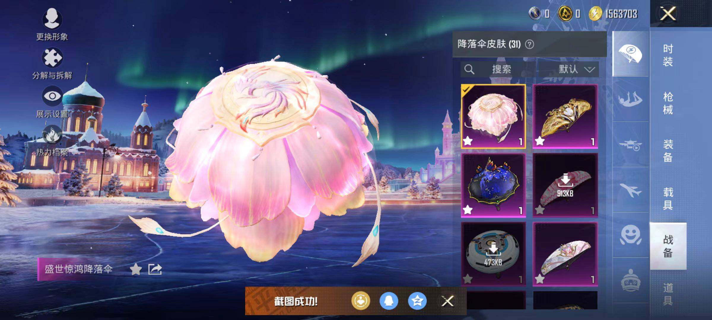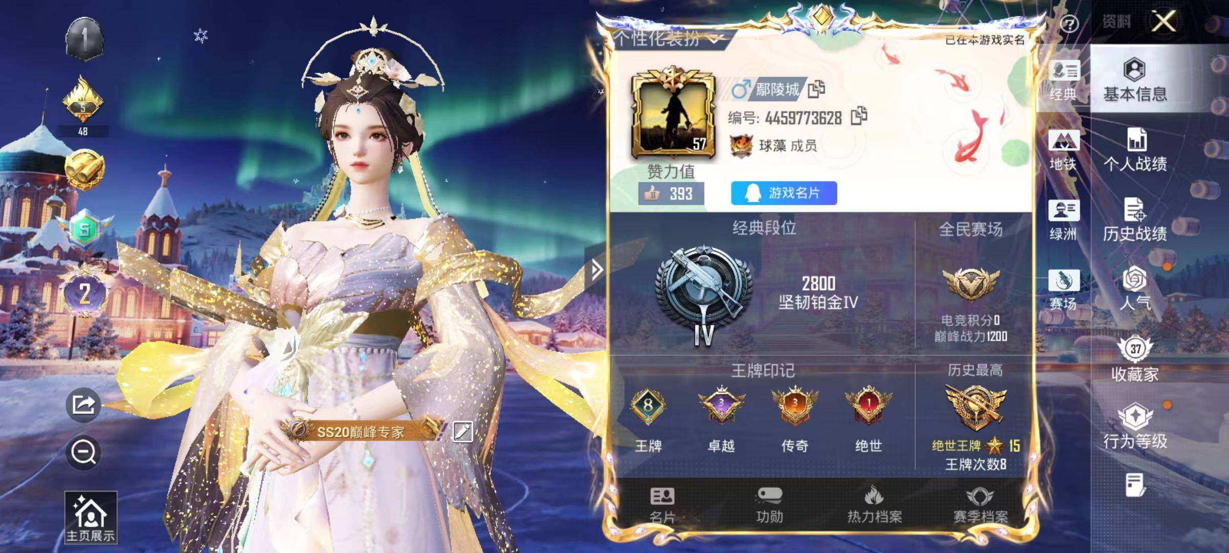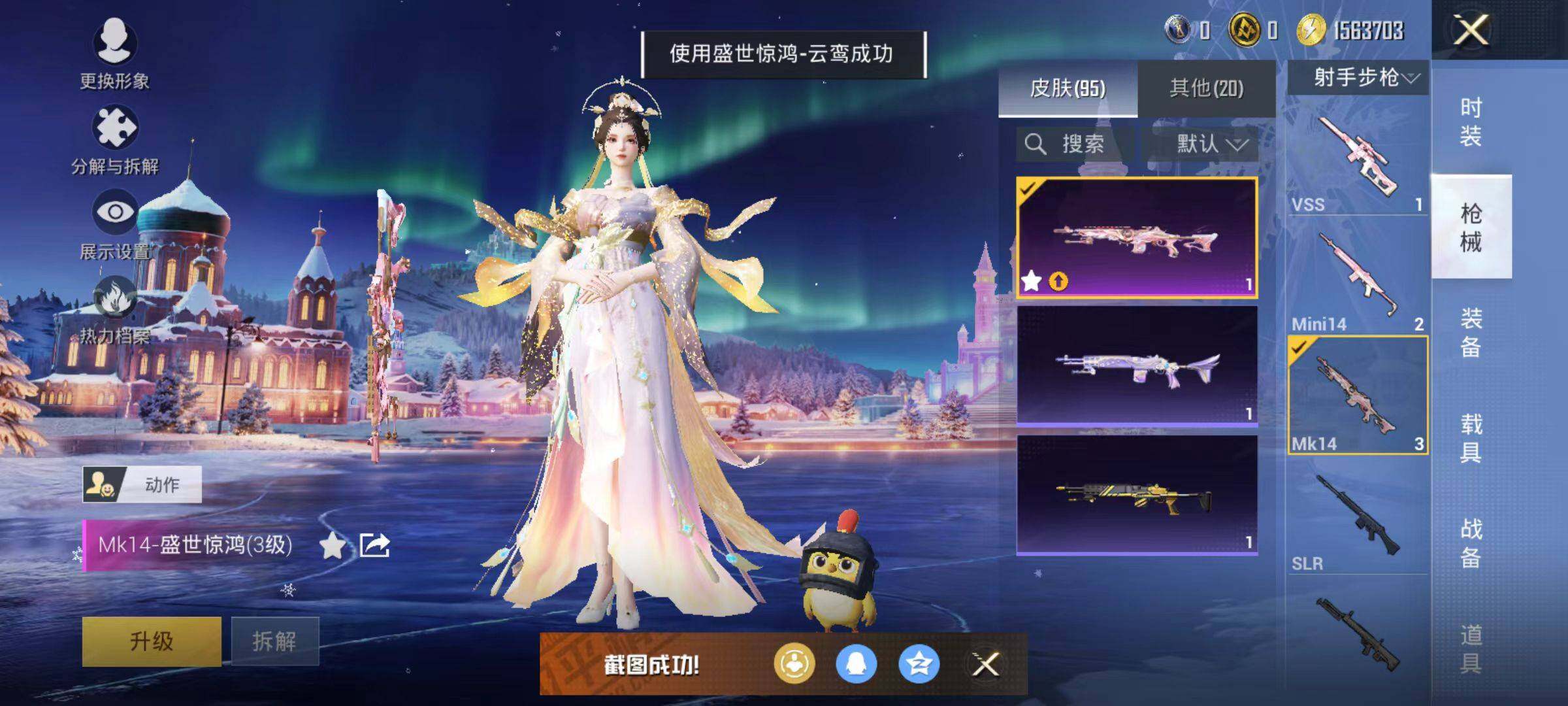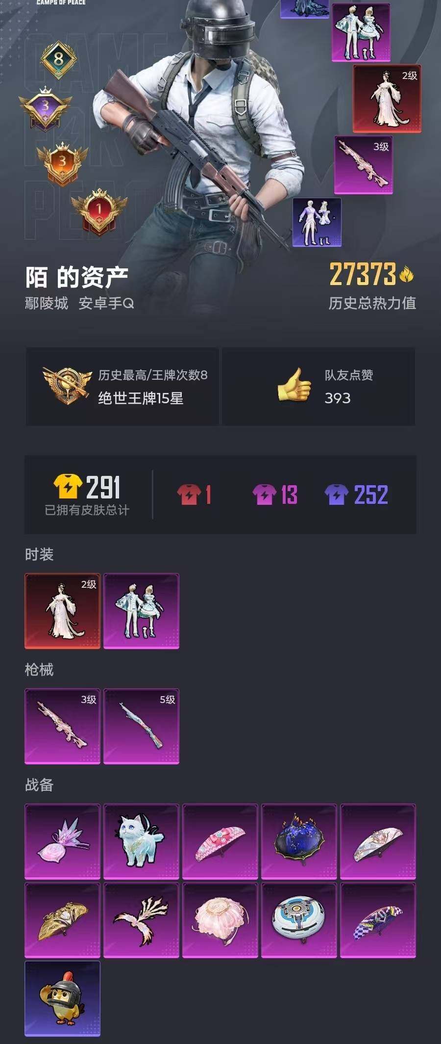62491神装-1粉装-2特效呛-0载具-3粉色飞行器-27373热力值-8王牌印记-52套装-95呛皮 【红色神装等级】:盛世惊鸿-云鸾二级 【红色角色神装】:盛世惊鸿-云鸾 【粉色套装】:粉装-雪月幻音 【粉色呛皮等级】:kar98k-巳巳如意五级,mk14-盛世惊鸿三级 【粉色