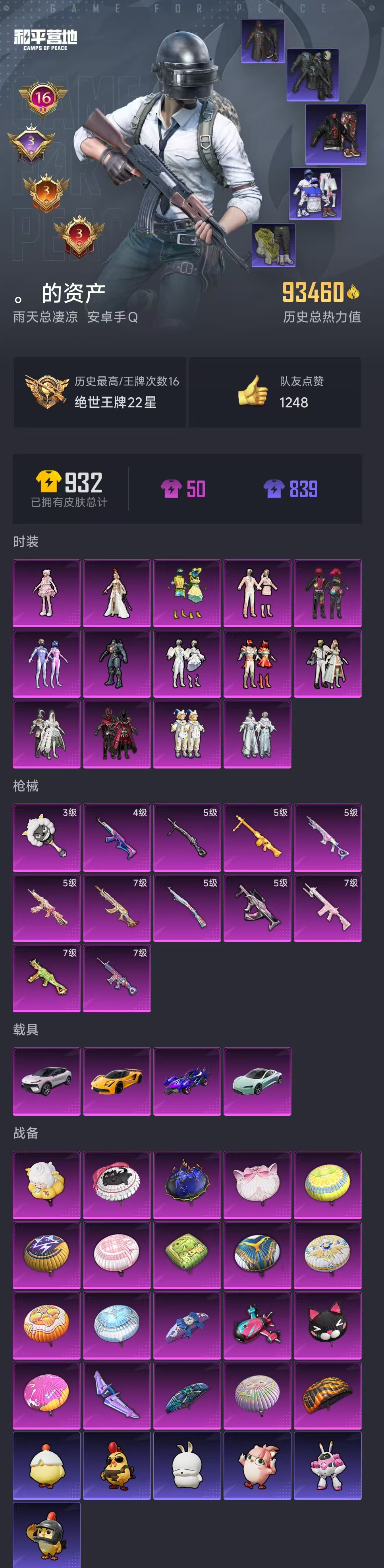 【和平精英】【lyhp18904】地铁满天赋 9.3w热力值高印记精品素材号 14粉装12特效呛 4载具 梦幻火箭 放客神游 第五大道 香水柠檬 美羊羊【都市猎人 赤蝎幽灵 狂沙舞者 浪漫天命 奇异狩猎者】梦之光华akm 满级鬼刀m762 满级童趣迷兔死噶 满级恐龙拽拽ump 路特斯 海龙奔腾 14粉装,12特效呛,4载具,历史最高段位:绝世王牌22星 王牌印记16次 热力值:93460,178套装,252呛械,319装备,153战备;套装:套装-梦幻火箭,套装-放客神游,套装-冰霜白皇,套装-炙焰红王,套装-香水柠檬,套装-相思残雪,套装-筑梦精灵,角色-复仇流浪者,套装-酣梦娃娃,套装-霞光圣骑,套装-寒光使者,套装-第五大道,角色-萨利娅,角色-羊梦糖心,套装-竞技名士,套装-湖蓝色名流,套装-猛禽,套装-长空猛禽,套装-漫步者,套装-竞技勇士朋克,套装-海岛探路者,套装-旭日情侣,套装-赤蝎幽灵,套装-都市猎人,套装-浪漫天命,套装-特战装甲,套装-灰色格斗者,套装-甜蜜告白,套装-滨海假日,套装-鹰眼刺客,套装-冰冻风暴,套装-完美偶像,套装-千禧之恋,套装-怒火燎原,套装-魅力单车,套装-绮丽涂鸦,套装-狂战萌兔,套装-坚韧舞者,套装-竞技达人朋克,套装-狂沙舞者,套装-沙漠兵团,套装-酷潮明星,套装-幻世战舞者,套装-奇异狩猎者,套装-蓝调潮人,套装-血色贵族,套装-呆萌铁蟹,套装-甜蜜熊情侣,套装-青涩时光,套装-缤纷果语,套装-龙魂突击队,套装-冰川特警,套装-格斗先锋,套装-wifi精灵,套装-粉红小猪,套装-破蛋小黄鸡,套装-好奇恐龙,套装-浪漫波比,套装-北国孤狼,套装-霓虹街区,套装-暗夜契约,套装-纯白誓言,套装-软萌银虎,套装-白熊同盟,套装-夏日音浪,套装-探宝勇士,套装-特种颜团子,套装-战术大师,套装-ss18特训,套装-曼妙人鱼,套装-热情海星,套装-纯真浪花,套装-冰爽海盐,角色-欧布奥特曼,套装-吉莉礼服,套装-龙宫之主,套装-ss15特训,套装-ss16特训,套装-暴风机械师,套装-时空追击者,角色-英勇保护者,套装-ss17特训,套装-水晶王族,套装-醒狮腾龙,套装-瑞龙福将,套装-团圆交子,套装-爆裂葡萄,套装-福星高照,套装-豚鼠丹丹,套装-虎虎生威吉莉,角色-军刀雅典娜,套装-异彩先驱,套装-霓虹极客,套装-空投萌叽,套装-ss19特训,套装-飞驰魅影,套装-音速流光,套装-炫蓝之夏,套装-ss20特训,套装-猎梦纪元,套装-甜心亚梦,套装-虚音幻奏,套装-ss21特训,套装-萌趣咩咩,套装-ss22特训,套装-绯格组合,套装-ss23特训,套装-莱茵河畔,套装-神气柴柴,套装-懵萌河马,套装-王牌教练,套装-柠萌假日,套装-ss24特训,套装-龟仙人,套装-涂山之恋,套装-ss25特训,套装-惊鸿侠骨,套装-锦衣飞扬,套装-香桃花海,套装-龙的传人,套装-冰河战士,套装-ss26特训,套装-快闪甜心,套装-春光漫游,套装-空岛之星,套装-贝斯之夜,套装-焰鹰斗篷,套装-幽夜迷踪,套装-幻羽潜行,套装-ss27特训,套装-恋语绒绒,套装-老实芭蕉,套装-ss28特训,套装-街头风暴,套装-海盐绵绵冰,套装-蝶变,套装-小熊娃娃,套装-ss29特训,套装-雏菊兔兔,套装-萝兰蝴蝶,角色-无面战甲,角色-摩登魅猫,角色-都市丽猫,套装-星途旅人,套装-ss30特训,套装-青团波波,套装-棉花软糖,套装-糖糖葫芦,套装-小鸟芋圆,套装-ss31特训,套装-鱼渊荷华,套装-燕燕于飞,套装-智谋强哥,套装-紫幽梦,套装-粉恋花,套装-ss33特训,套装-云朵鹅,套装-巳巳如意,套装-ss32特训,套装-彩虹兔,套装-蓝冰羽,套装-雪绒豹,套装-大橘大利,套装-霓虹热舞,玩偶服-懒羊羊,套装-元气之梦,套装-ss34特训,套装-擎苍青焰,套装-朱霞炽焰,套装-游乐,套装-凌霄紫焰,套装-薄荷星砂,套装-ss35特训,套装-午间小调,套装-秘语星愿,套装-风迹短诗,套装-ss36特训,套装-萌鸡速递;呛皮:4级akm-梦之光华,akm-灼热熔岩,akm-影袭,akm-破晓战魂,akm-春暖花开,akm-霓虹街区,akm-涂鸦街区,akm-彩虹符号,akm-虎虎生威,akm-海渊国主,akm-恐龙拽拽,akm-环太平洋,akm-筑梦精灵,akm-龙的传人,akm-荧星灵猫,akm-霓彩脉冲,g36c-时空追击者,g36c-暗夜玫瑰,g36c-冷魅冰骑,g36c-懵萌河马,g36c-星穹咏叹调,g36c-乌木金纹,aug-甜蜜菠萝,aug-幻影战神,aug-耀粉歌者,aug-圣光天使,7级m762-鬼刀,m762-瑞龙福将,m762-彩虹符号,m762-第五大道,m762-雏菊兔兔,m762-云朵鹅,7级scar-l-童趣迷兔,scar-l-龙宫之主,scar-l-星途旅人,scar-l-海盐豹豹,mk47-百万伏特,mk47-乌木金纹,mk47-风迹短诗,famas-突变脉冲,famas-霓彩脉冲,famas-乌木金纹,5级groza-镜光银凌,groza-影袭,groza-林间仙鹿,groza-彩虹符号,groza-异彩先驱,groza-恐龙拽拽,groza-懵萌河马,groza-海盐豹豹,groza-无面战甲,蜜獾-娇憨猪猪,蜜獾-垂柳戏鸭,蜜獾-天降萌叽,蜜獾-糖糖葫芦,蜜獾-风迹短诗,蜜獾-乌木金纹,m16a4-甜心亚梦,m16a4-幻世战舞者,m16a4-冰河战士,m16a4-千金淑猫,q-神秘黑猫,q-洛神天依,q-飞驰魅影,q-纯真浪花,ac-val-甜心亚梦,ac-val-乌木金纹,ac-val-快闪甜心,m416-蓝色火焰,m416-绯红前夜,m416-神秘黑猫,arx-凌霄紫焰,5级kar98k-巳巳如意,kar98k-影袭,kar98k-梦幻火箭,kar98k-彩虹符号,kar98k-飞驰魅影,kar98k-顶峰精英,kar98k-乌木金纹,awm-恐龙拽拽,awm-垂柳戏鸭,awm-焰鹰斗篷,awm-纯真浪花,svd-冷漠罗丽,svd-云朵鹅,m24-影袭,m24-炫彩节奏,m24-乌木金纹,莫辛纳甘-乌木金纹,莫辛纳甘-懵萌河马,莫辛纳甘-风迹短诗,m200-惊鸿侠骨,m200-乌木金纹,win94-瑞龙福将,win94-乌木金纹,amr-乌木金纹,5级mk14-甜梦熊击,mk14-童趣迷兔,mk14-乌木金纹,mk14-冰河战士,mk14-紫幽梦,mk14-薄荷星砂,mk20-h-快闪甜心,mk20-h-星途旅人,mk20-h-糖糖葫芦,mk20-h-狂鲨锋刃,mk20-h-乌