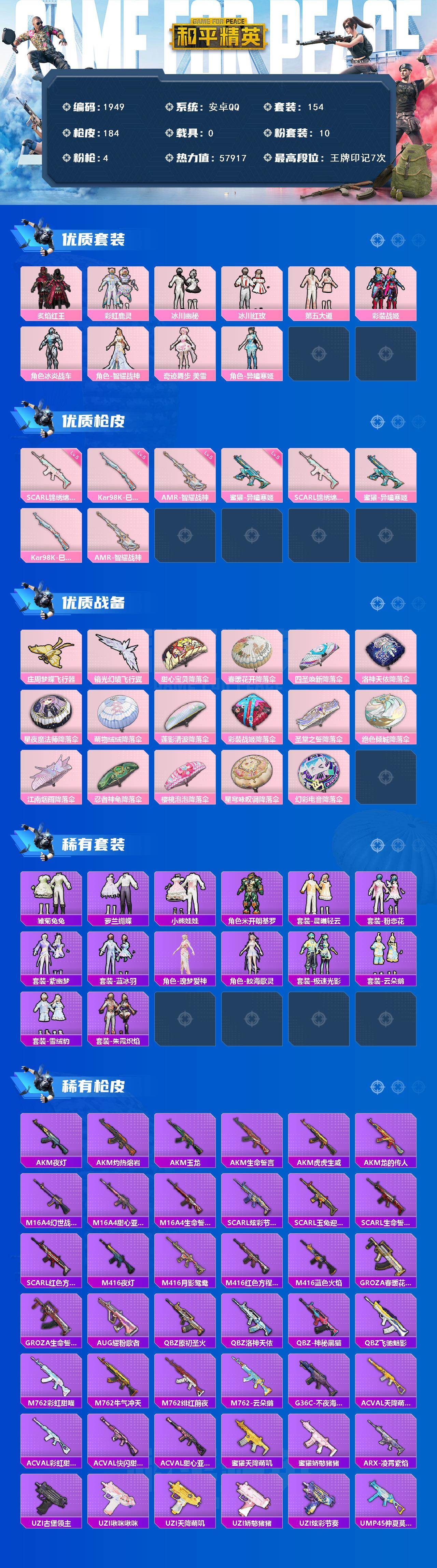 0载具-154套装-184呛皮-154套装/呛械4/装备227/战备152/王牌印记7/热力值57917/五级scar-l-锦绣绵绵/五级蜜獾-异瞳寒姬/五级kar98k-巳巳如意/五级amr-智耀战神/粉装-彩装战姬/套装-龟仙人/炙焰红王/彩虹鹿灵/冰川幽秘/冰川红玫/第五大道/彩装战姬/冰炎战车/角色-智耀战神/角色-奇迹舞步 美雪/角色-异瞳寒姬/scar-l-锦绣绵绵/蜜獾-异瞳寒姬/kar98k-巳巳如意/amr