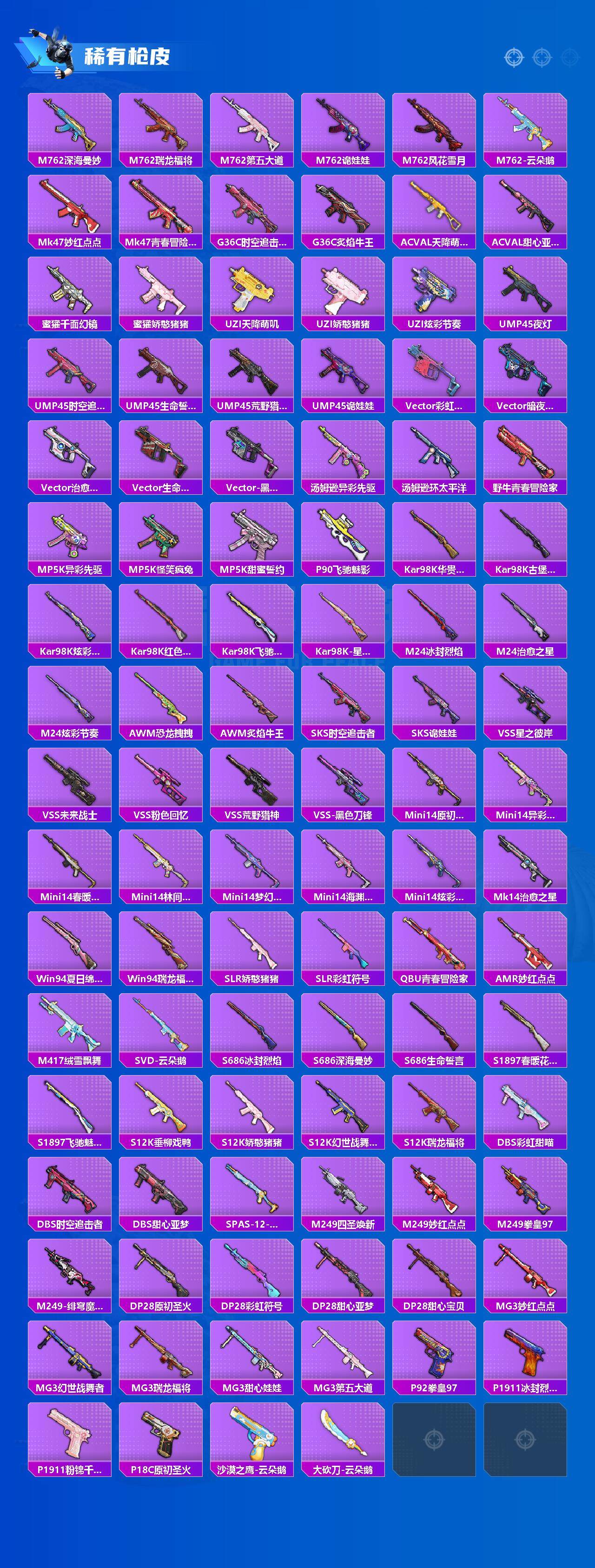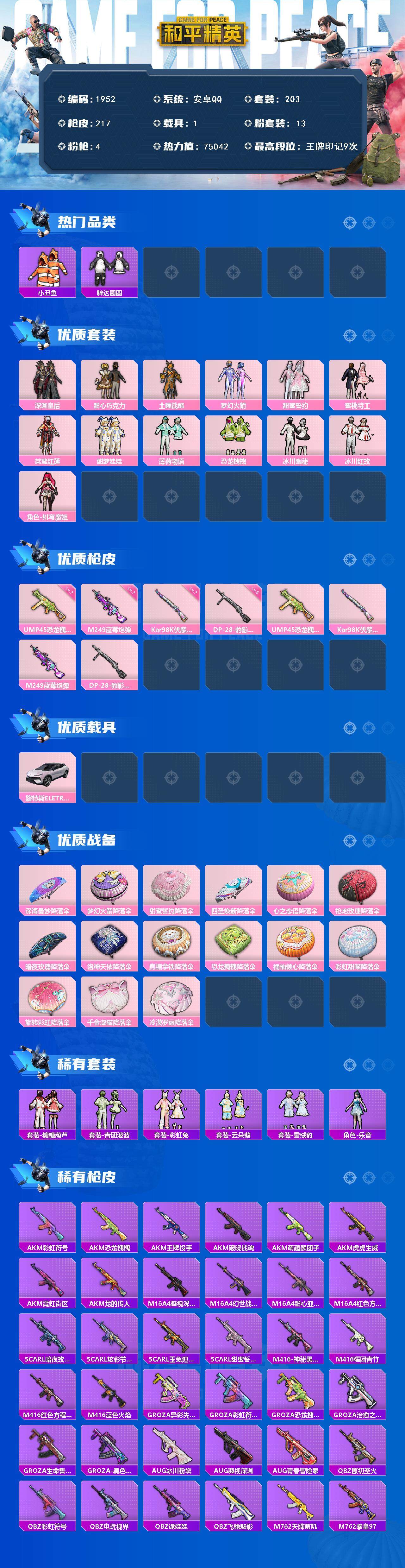1载具-203套装-217呛皮-203套装/呛械4/装备252/载具1/战备174/王牌印记9/热力值75042/七级ump45-恐龙拽拽/七级kar98k-伏魔团/七级m249-蓝莓炮弹/五级dp-28-豹影疾电/粉装-梦幻火箭/小丑鱼/胖达圆圆/套装-龟仙人/套装-浪漫波比/套装-粉红小猪/深渊皇后/甜心巧克力/土曜战麒/梦幻火箭/甜蜜誓约/蜜桃特工/桀骜红莲/酣梦娃娃/薄荷物语/恐龙拽拽/冰川幽秘/冰川红玫/角色-绯穹