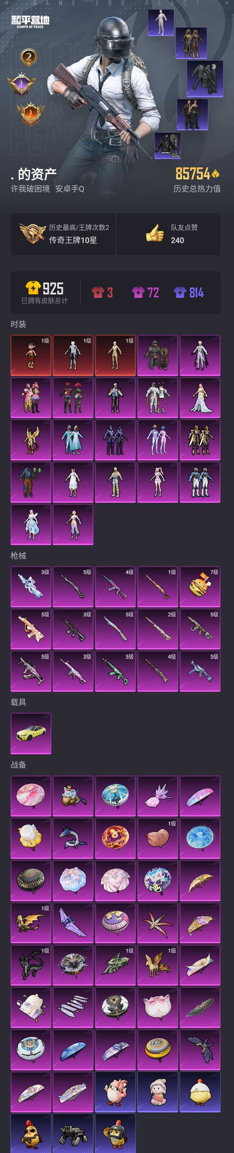 【和平精英】【lyhp18513】3红装19粉装15特效呛1载具 1级图卡盟 1级哪吒 怪诞乔克 雪国幻梦 赵灵儿 放客神游 智能音符 梦幻火箭 极限特训 (白木乃伊 沙漠守护者 天网终结者 都市猎人 寒蝎幽灵 暗夜之虎 追光服 恶魔人蛛 胖达团团 国宝头盔 粉熊背包)3级m4墨龙九天 3级p90魔童闹海 3级死噶时空协奏 满级手蕾 宝马m4 19粉装,15特效呛,1载具,历史最高段位:传奇王牌10星 王牌印记2次 热力值:85754,180套装,250呛械,326装备,144战备;套装:沙丘之主-图卡盟,魔童闹海-哪吒,灵猫魔法师-塞维尔,套装-极限特训,套装-怪诞乔克,套装-雪国幻梦,套装-梦幻火箭,套装-智能音符,套装-缤纷油彩,套装-放客神游,套装-彗云及圣,女娲后裔-赵灵儿,角色-星梦奇缘,套装-创世·救赎,时空协奏·心弦,时空协奏·火花,角色-金域紫灵,套装-未来领航者,套装-动力核心,角色-凤凰座 一辉,角色-智耀战神,角色-星渊,套装-特训学院,套装-红色运动,套装-黄色运动,套装-蓝色运动,套装-黄色伏地魔,套装-白色伏地魔,套装-黑色伏地魔,套装-竞技名士,套装-猛禽,套装-长空猛禽,套装-漫步者,套装-霸义无双,套装-雪鹰学院,套装-海岛探路者,套装-旭日情侣,套装-寒蝎幽灵,套装-都市猎人,套装-水银刺客,套装-浪漫天命,套装-特战装甲,套装-特殊使命,套装-青春校园,套装-活力之心,套装-甜蜜告白,套装-燃烧卡路里,套装-沙漠狂蝎,套装-鹰眼刺客,套装-冰冻风暴,套装-幻影武者,套装-热血骑手,套装-红潮炫舞,套装-魅力单车,套装-绮丽涂鸦,套装-超能勇士,套装-狂沙舞者,套装-破晓战魂,套装-森林游猎者,套装-都市魅力,套装-热血青春,套装-雪山精英,套装-幽冥伯爵,套装-暗影哥特,套装-深海小丑鱼,套装-夏日倾情,套装-青涩时光,套装-缤纷果语,套装-滨海厨神,套装-alan walker,套装-龙魂突击队,套装-元素星魂,套装-胖达团团,套装-沙漠守护者,套装-沙暴袭击者,套装-暗夜之虎,套装-冥河战士,套装-恶魔人蛛,套装-天网终结者,套装-浪漫波比,套装-仓鼠灰灰,套装-霓虹街区,套装-jdg战队服,套装-nv战队服,套装-红红火火,套装-潮流游乐家,套装-战术大师,套装-耀粉歌者,套装-曼妙人鱼,套装-热情海星,套装-纯真浪花,套装-rsg追光队服,套装-tjb追光队服,套装-tt战队服,角色-赵灵儿,套装-ss22特训,套装-王牌教练,套装-香桃花海,套装-龙的传人,套装-冰河战士,套装-ss26特训,套装-快闪甜心,套装-春光漫游,套装-空岛之星,套装-贝斯之夜,套装-焰鹰斗篷,套装-幻羽潜行,套装-ss27特训,套装-恋语绒绒,套装-老实芭蕉,套装-ss28特训,玩偶服-卖崽青蛙,角色-极地流光,角色-粉雾星云,角色-冰公主,角色-8号机,角色-mark.06,套装-街头风暴,套装-海盐绵绵冰,套装-蝶变,套装-创世·幻影,套装-创世·追猎,套装-小熊娃娃,套装-ss29特训,套装-雏菊兔兔,套装-萝兰蝴蝶,角色-紫俏灵猫,套装-火种守卫者,角色-蜜桃派对,角色-都市丽猫,套装-星途旅人,角色-临安公主,套装-ss30特训,套装-青团波波,套装-棉花软糖,角色-夜瞳黯灵,套装-糖糖葫芦,套装-裁决天象,套装-萌萌史莱姆,套装-镭金极速,套装-纯白跃动,套装-ss31特训,套装-鱼渊荷华,套装-燕燕于飞,套装-智谋强哥,套装-紫幽梦,套装-粉恋花,套装-ss33特训,套装-云朵鹅,玩偶服-小狗蛇点点,套装-巳巳如意,套装-ss32特训,套装-彩虹兔,套装-蓝冰羽,套装-顶瓜瓜,套装-雪绒豹,套装-混沌火种,套装-大橘大利,套装-星渊小夜曲,套装-霓虹热舞,套装-蜜露汐语,套装-炫彩糖果,玩偶服-美羊羊,套装-元气之梦,套装-ss34特训,套装-擎苍青焰,套装-朱霞炽焰,角色-申公豹,套装-游乐,套装-凌霄紫焰,套装-薄荷星砂,套装-ss35特训,套装-午间小调,套装-秘语星愿,套装-风迹短诗,套装-琴音绮想,套装-画境星梦,套装-ss36特训,套装-雪国风尚,套装-萌鸡速递;呛皮:mk47-极冰使者,mk47-风迹短诗,q-纯真浪花,q-绒兔团圆,5级aug-暖羊咩咩,aug-甜蜜菠萝,aug-终结者,aug-耀粉歌者,aug-异域银装,aug-绝对恒星,aug-冰晶雪宝,5级m762-青锋波束,m762-天降萌叽,m762-雏菊兔兔,m762-云朵鹅,蜜獾-天降萌叽,蜜獾-糖糖葫芦,蜜獾-绯穹魔姬,蜜獾-青瓷战姬,蜜獾-风迹短诗,蜜獾-冰澜龙吟,蜜獾-乌木金纹,3级m416-墨龙九天,m416-蓝色火焰,m416-星际漫游,m416-罗小黑,m416-萌萌史莱姆,famas-墨龙九天,famas-镜域双华,famas-霓彩脉冲,famas-乌木金纹,4级akm-炫紫旋律,akm-影袭,akm-霓虹街区,akm-沙漠守护者,akm-龙的传人,akm-灵猫魔法师,akm-砺玉逐花,akm-霓彩脉冲,ace32-画境星梦,g36c-星际漫游,g36c-镜域双华,g36c-星穹咏叹调,arx-凌霄紫焰,3级scar-l-时空协奏,scar-l-红色方程式,scar-l-夜灯,scar-l-星途旅人,scar-l-海盐豹豹,scar-l-小狗蛇点点,5级groza-镜光银凌,groza-影袭,groza-守护天翼,groza-海盐豹豹,ac-val-快闪甜心,m16a4-红色方程式,m16a4-星际漫游,m16a4-冥河战士,m16a4-冰河战士,amr-墨龙九天,amr-雾都回忆,amr-鸡智如我,amr-喜羊羊与灰太狼,amr-乌木金纹,m200-六号稻草人,m200-乌木金纹,2级m24-镜域双华,m24-奇异狩猎者,4级kar98k-创世·救赎,1级kar98k-圣域龙灵,5级kar98k-巳巳如意,kar98k-影袭,kar98k-顶峰精英,awm-焰鹰斗篷,awm-纯真浪花,svd-冷漠罗丽,svd-云朵鹅,svd-霓彩脉冲,莫辛纳甘-乌木金纹,莫辛纳甘-兔兔小魔女,莫辛纳甘-风迹短诗,win94-乌木金纹,mk20-h-莲影清波,mk20-h-快闪甜心,mk20-h-星梦奇缘,mk20-h-星途旅人,mk20-h-糖糖葫芦,mk20-h-乌木金纹,mini14-金玉无双,mini14-星际漫游,mini14-梦幻火箭,mini14-炫彩节奏,mini14-耀粉歌者,mini14-香桃花海,mini14-雏菊兔兔,slr-沙漠守护