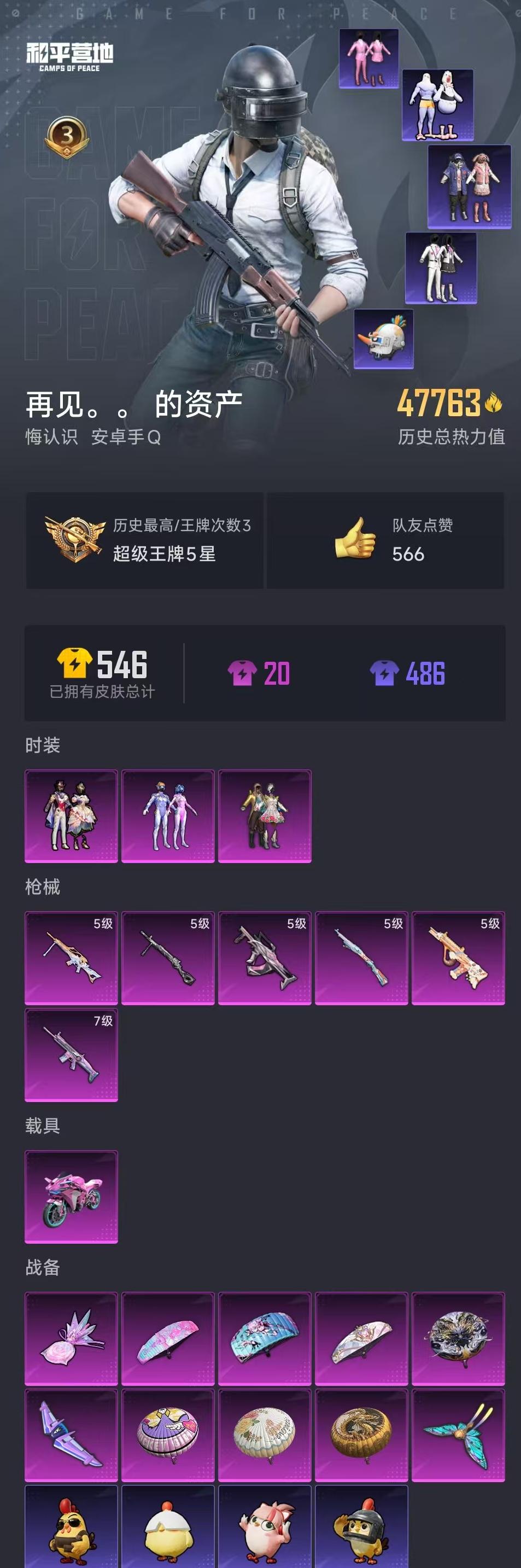 【和平精英】【lyhp18969】地铁满天赋 3粉装6特效呛 1载具 梦幻火箭 蝶舞迷情 满级梦幻火箭死噶 满级暖阳咩咩aug 雪国头盔 梦幻火箭摩托 3粉装,6特效呛,1载具,历史最高段位:超级王牌5星 王牌印记3次 热力值:47763,128套装,148呛械,176装备,76战备;套装:套装-梦幻火箭,套装-蝶舞迷情,套装-星穹咏叹调,套装-特训学院,套装-猎鹰,套装-青年教官,套装-橘黑制服,套装-红色运动,套装-黄色运动,套装-蓝色运动,套装-黄色伏地魔,套装-白色伏地魔,套装-黑色伏地魔,套装-冰川格斗者,套装-竞技名士,套装-深蓝色名流,套装-酒红色名流,套装-湖蓝色名流,套装-黄色名流,套装-猛禽,套装-长空猛禽,套装-竞技勇士朋克,套装-蓝色守护者,套装-旭日情侣,套装-冷焰舞者,套装-灼焰舞者,套装-浪漫假日,套装-战地督导,套装-黄色格斗者,套装-沙漠毒蛇,套装-完美偶像,套装-人气偶像,套装-幻影武者,套装-街头潮人,套装-蓝彩潮人,套装-酷萌兔限定,套装-魅力单车,套装-绮丽涂鸦,套装-竞技达人朋克,套装-超能勇士,套装-破晓战魂,套装-都市魅力,套装-传奇侦探,套装-幻世战舞者,套装-夏日倾情,套装-缤纷果语,套装-冰川特警,套装-极速红龙,套装-格斗先锋,套装-破蛋小黄鸡,套装-疯狂小兔子,套装-北国孤狼,套装-ss6特训,套装-拳皇97八神庵,套装-炽焰拳师,套装-格斗专家,套装-星光纪元,套装-奇迹天团,套装-云纹魔法士,套装-淡雅花蕊,套装-玲珑飞花,套装-跃动心情,套装-ss7特训,套装-鹤鸣,套装-霓虹街区,套装-ss10特训,套装-ss8特训,套装-pel躁动竞梦者,套装-夏日音浪,套装-ss9特训,套装-探宝勇士,套装-白糯汤圆,套装-战术大师,套装-ss12特训,套装-ss18特训,套装-耀粉歌者,套装-ss13特训,套装-ss14特训,套装-ss16特训,套装-ss17特训,套装-瑞龙福将,套装-团圆交子,套装-福星高照,套装-豚鼠丹丹,套装-虎虎生威吉莉,套装-空投萌叽,套装-ss19特训,套装-炫蓝之夏,套装-ss20特训,套装-ss21特训,套装-光之冒险,套装-绯格组合,套装-飞狐塔尔斯,套装-柠萌假日,套装-香桃花海,套装-恋语绒绒,套装-街头风暴,套装-异域银装,角色-摩登魅猫,角色-蜜桃派对,套装-ss30特训,套装-青团波波,套装-棉花软糖,套装-双彩圣灵,套装-糖糖葫芦,套装-梦域神使,套装-小鸟芋圆,套装-绒宝小鹅,套装-ss31特训,套装-鱼渊荷华,套装-石蕴玉辉,套装-燕燕于飞,套装-紫幽梦,套装-粉恋花,套装-ss33特训,套装-巳巳如意,套装-ss32特训,套装-蓝冰羽,套装-大橘大利,套装-炫彩糖果,套装-星影赞美诗,玩偶服-喜羊羊,套装-ss34特训,套装-ss35特训,套装-午间小调,套装-风迹短诗,套装-ss36特训,套装-萌鸡速递;呛皮:m16a4-蓝色火焰,m16a4-红色方程式,m16a4-幻世战舞者,m16a4-乌木金纹,m416-蓝色火焰,m416-暗星紫秘,m416-乌木金纹,akm-灼热熔岩,akm-春暖花开,akm-彩虹符号,akm-虎虎生威,akm-霓彩脉冲,akm-乌木金纹,q-彩虹符号,q-乌木金纹,famas-镜域双华,famas-霓彩脉冲,famas-乌木金纹,7级scar-l-梦幻火箭,scar-l-彩虹符号,scar-l-乌木金纹,mk47-天之羽翼,mk47-风迹短诗,蜜獾-精灵梦叶罗丽,蜜獾-糖糖葫芦,蜜獾-风迹短诗,蜜獾-乌木金纹,ac-val-天降萌叽,ac-val-牡丹亭·游园,5级aug-暖羊咩咩,aug-甜蜜菠萝,aug-耀粉歌者,aug-异域银装,aug-冰晶雪宝,5级groza-镜光银凌,groza-春暖花开,groza-恐龙拽拽,groza-乌木金纹,m762-拳皇97,m762-深海曼妙,m762-瑞龙福将,g36c-乌木金纹,5级kar98k-巳巳如意,kar98k-梦幻火箭,kar98k-顶峰精英,kar98k-乌木金纹,m24-乌木金纹,m200-乌木金纹,awm-乌木金纹,莫辛纳甘-风迹短诗,svd-冷漠罗丽,win94-瑞龙福将,win94-乌木金纹,amr-墨龙九天,mini14-春暖花开,mini14-梦幻火箭,mini14-旋转彩虹,sks-夜灯,sks-炫彩节奏,sks-乌木金纹,mk14-乌木金纹,mk14-紫幽梦,mk14-紫晶流影,mk20-h-星途旅人,mk20-h-糖糖葫芦,mk20-h-狂鲨锋刃,mk12-风迹短诗,vss-香桃花海,slr-霓彩脉冲,ump45-生命誓言,ump45-春暖花开,ump45-海盐豹豹,ump45-糖糖葫芦,ump45-极意拳锋,p90-巳巳如意,uzi-红色方程式,uzi-炫彩节奏,uzi-炫彩糖果,汤姆逊-耀粉歌者,汤姆逊-炫彩节奏,汤姆逊-天降萌叽,汤姆逊-乌木金纹,aks-74u-鬼刀,aks-74u-乌木金纹,野牛-夜灯,野牛-燕燕于飞,野牛-乌木金纹,vect-彩虹符号,vect-英伦信使,vect-燕燕于飞,vect-乌木金纹,s12k-瑞龙福将,s12k-音爆索尼克,s12k-蓝晶绮麟,s12k-智耀战神,s12k-霓彩脉冲,s12k-乌木金纹,s686-魔法学院,s686-千金淑猫,s686-巳巳如意,s686-乌木金纹,s1897-春暖花开,s1897-紫幽梦,s1897-糯团青竹,dbs-彩虹符号,dbs-风迹短诗,spas-12-燕燕于飞,spas-12-乌木金纹,m249-拳皇97,m249-彩虹符号,m249-乌木金纹,5级mg-36-沧焰双生,pkm-啾咪啾咪,pkm-紫幽梦,mg3-瑞龙福将,mg3-甜心娃娃,mg3-幻世战舞者,mg3-霓彩脉冲,5级dp-28-豹影疾电,dp-28-彩虹符号,p92-拳皇97,p92-紫幽梦,信号呛-异瞳寒姬,蝎式手呛-燕燕于飞,p18c-糖糖葫芦,沙墨之鹦-羲和光序,p1911-小狗蛇点点,平底锅-拳皇97,平底锅-瑞龙福将,平底锅-糖糖葫芦,平底锅-紫幽梦,平底锅-属我最6,大砍刀-盛世惊鸿,撬棍-传奇侦探,撬棍-幻世战舞者,撬棍-沙丘之主权杖,撬棍-戏水时光,爆炸猎弓-雪月幻音,爆炸猎弓-喜羊羊与灰太狼,破片手留单-海盐豹豹,破片手留单-拽到爆炸,破片手留单-巳巳如意,破片手留单-爆破雪人,十子怒-燕燕于飞,十子怒-异域银装,十子怒-绒兔团圆,盐雾蛋-冰氧夏日,铝热弹-炫彩糖果;载具:双人摩托-梦幻火箭;降落伞:梦幻火箭飞行器,春暖花开飞行器,炫彩糖果飞行器,异域银装飞行器,顶峰精英尾迹,破刃行动尾迹,鸡智如我飞行器; 详情看图
