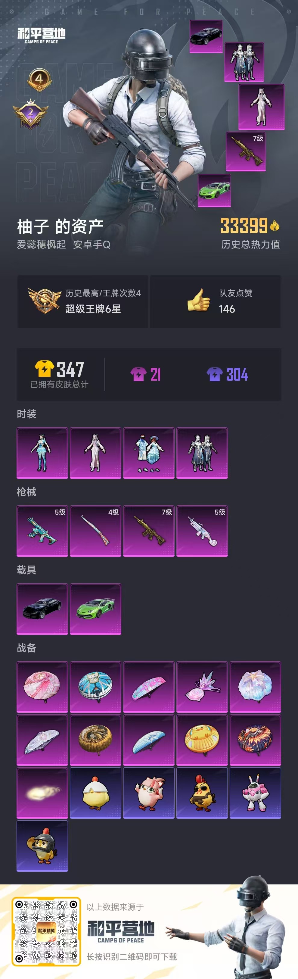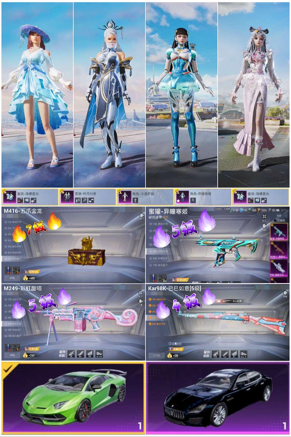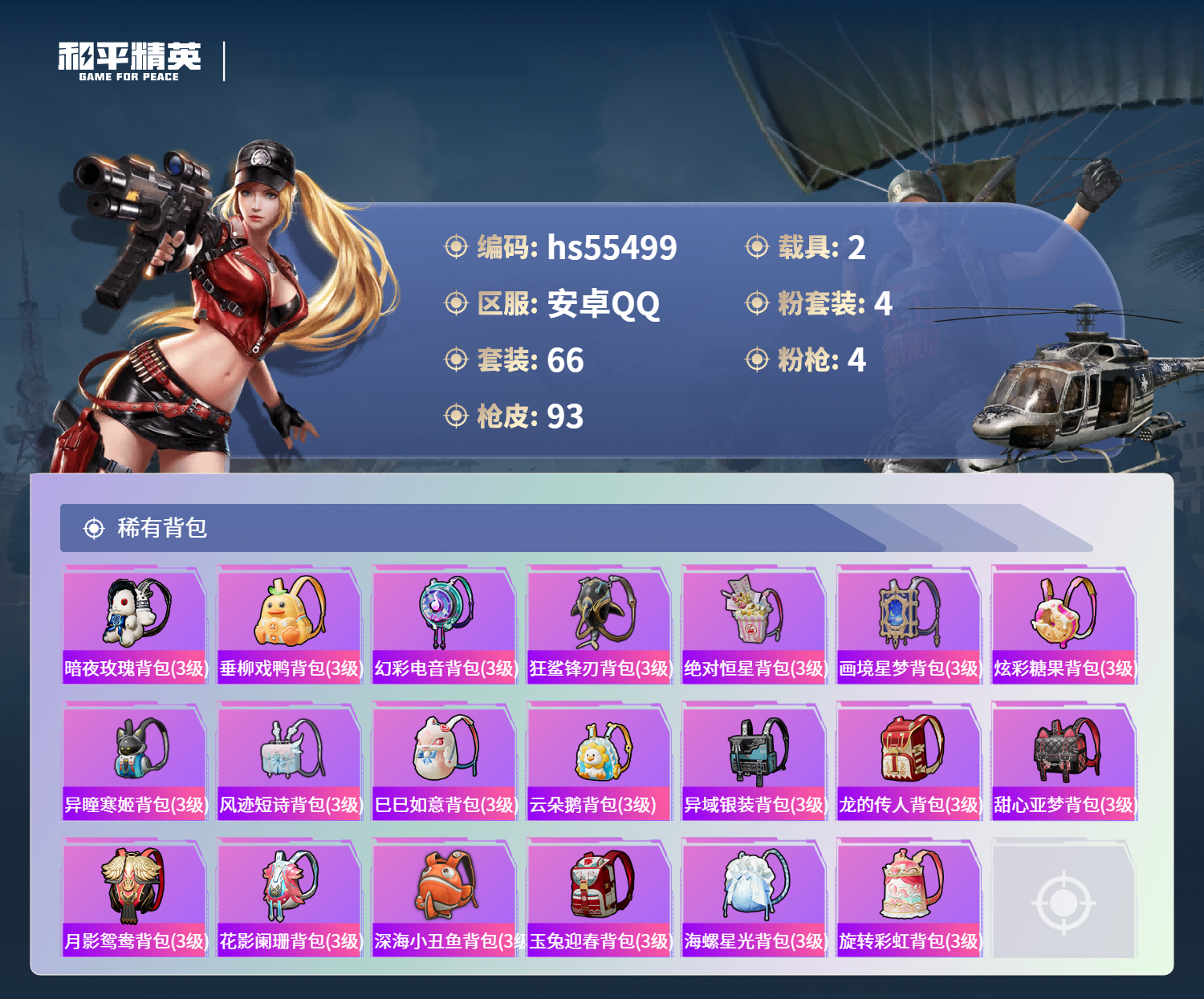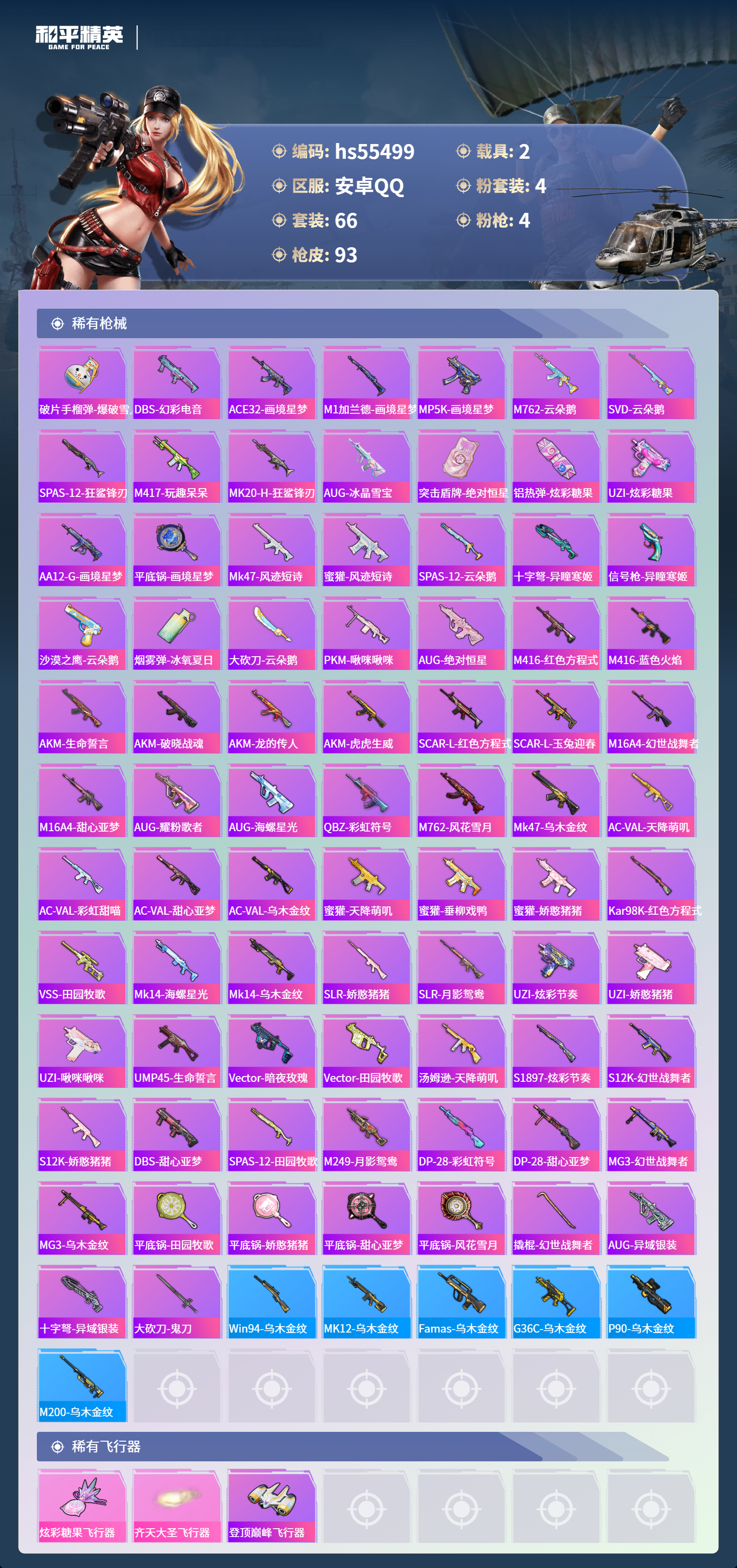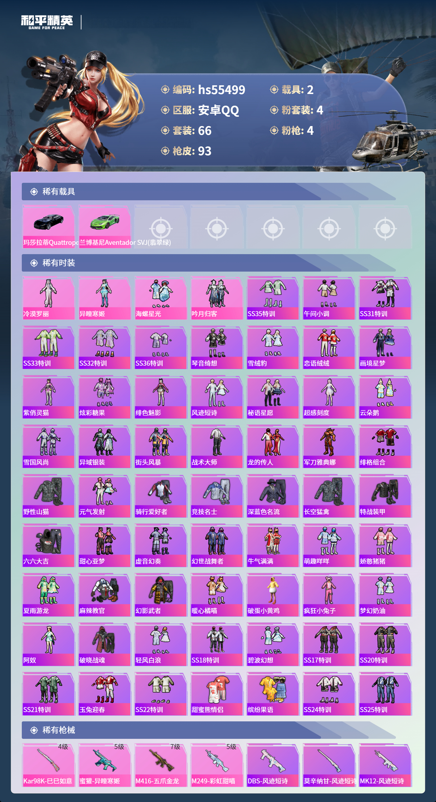 hs55499 安卓手q-4王牌印记-4粉装-4特效呛-2载具-33969热力值-66套装-93呛皮-2卓越印记【4粉装】角色-冷漠罗丽套装-吟月归客套装-海螺星光角色-异瞳寒姬【4特效呛】m416-五爪金龙/7级m249-彩虹甜喵/5级蜜獾-异瞳寒姬/5级kar98k-巳巳如意/4级【2稀有载具】玛莎拉蒂quattropte夜幕蓝兰博基尼aventad svj翡