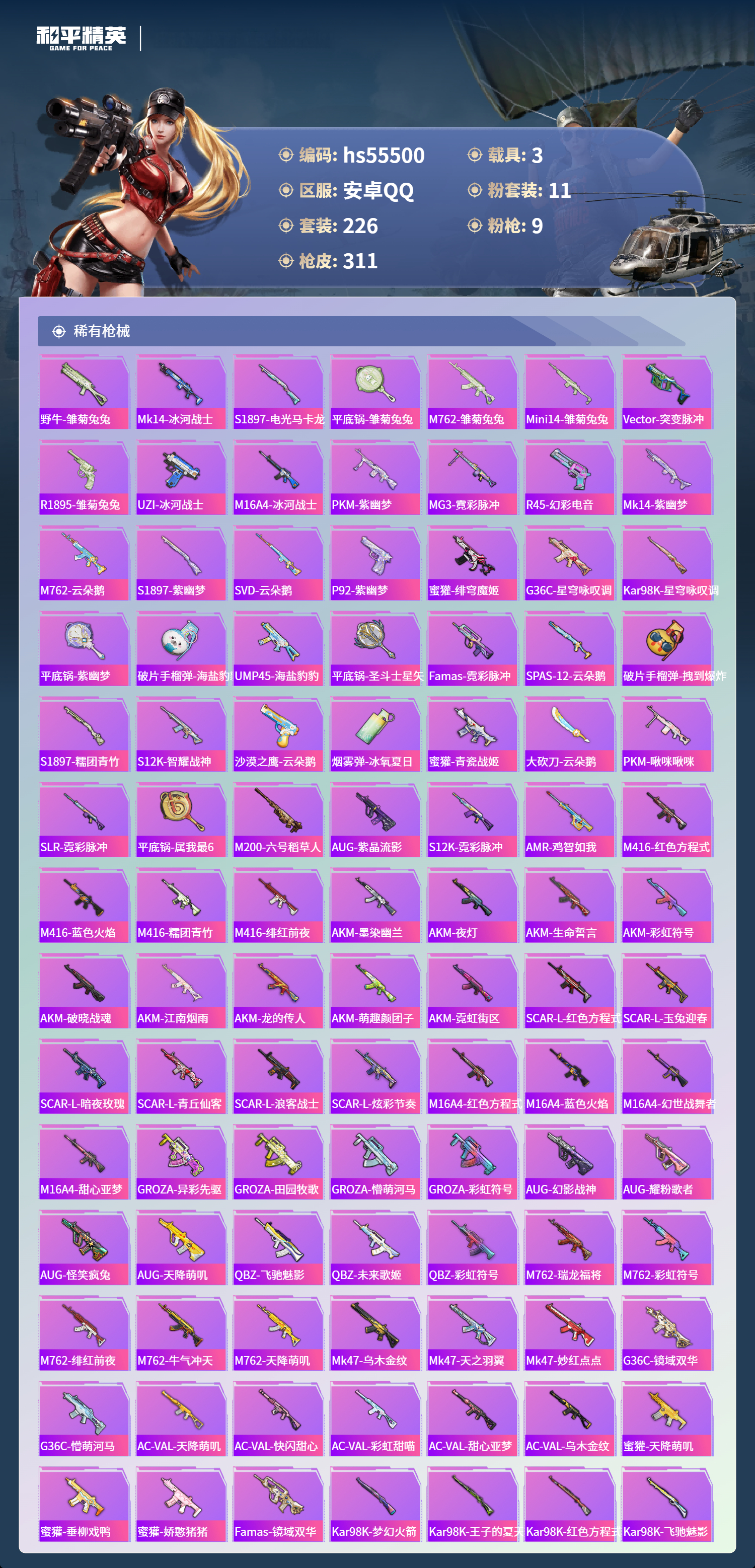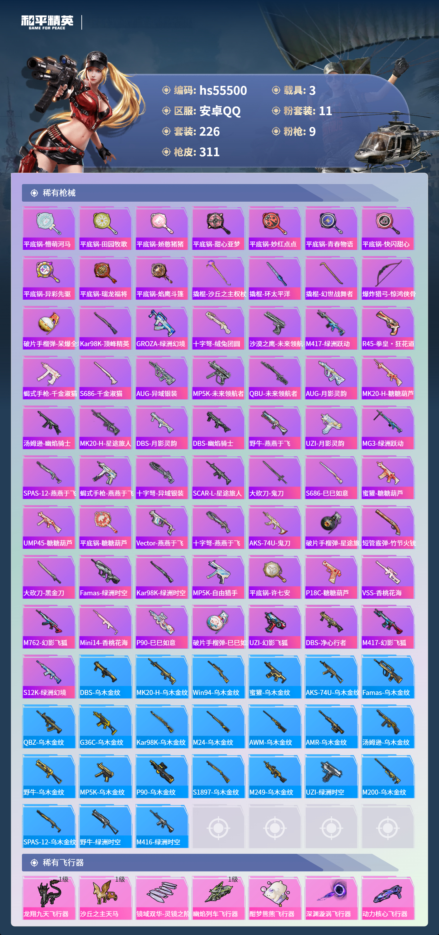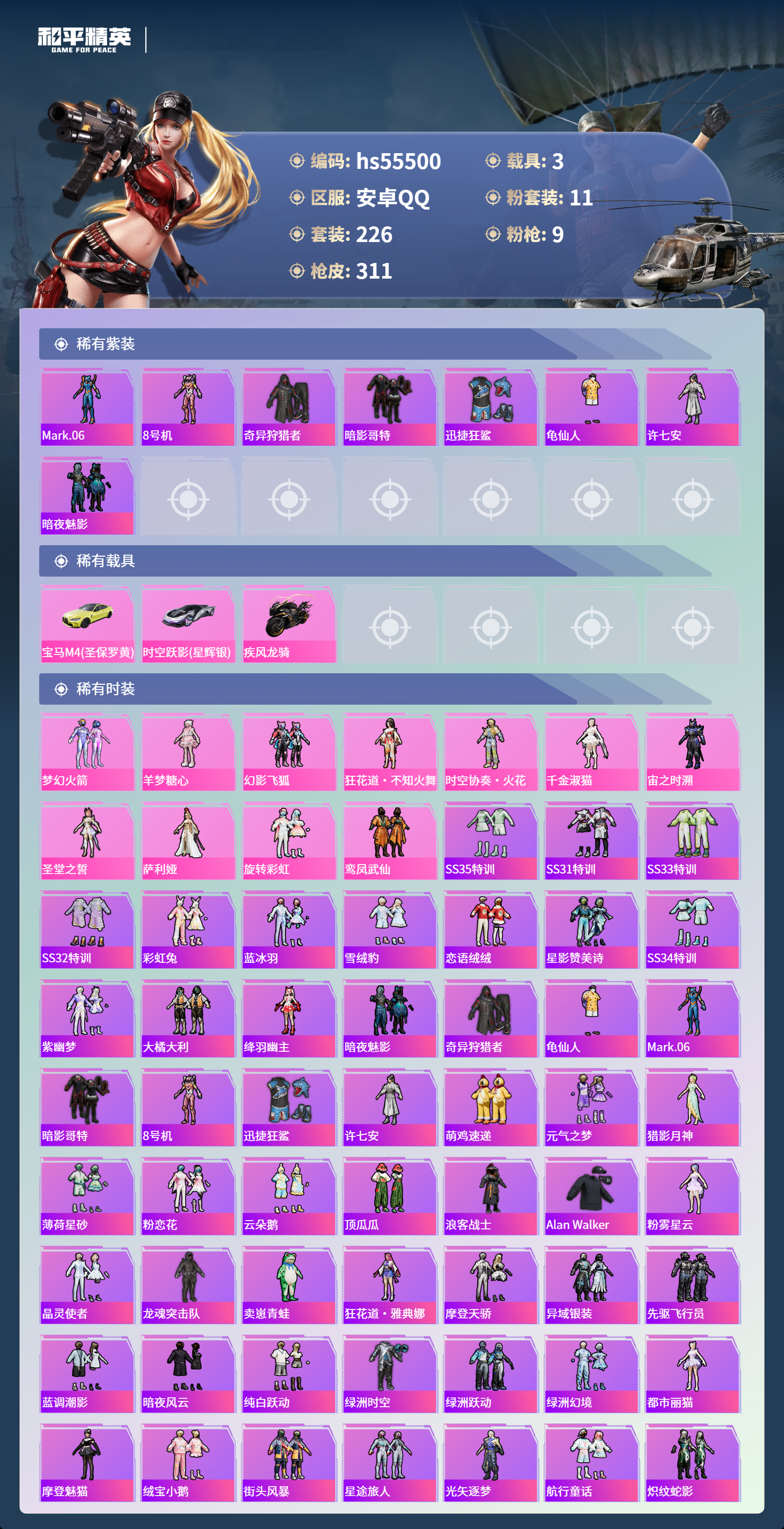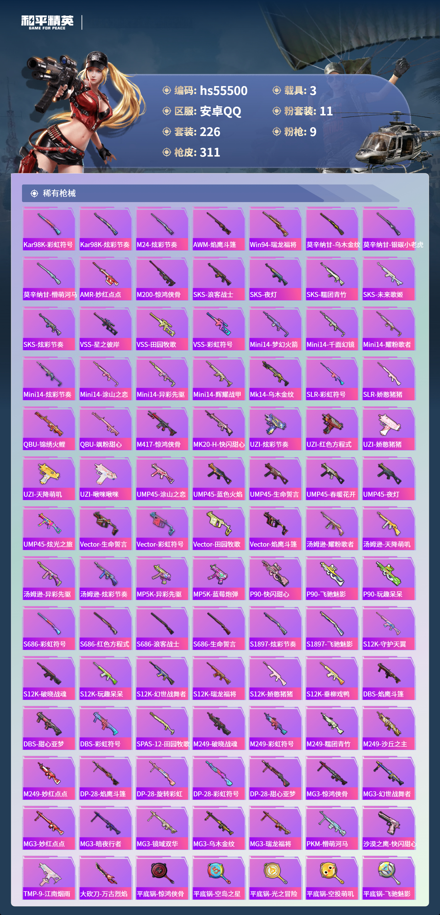 hs55500 安卓手q-9王牌印记-11粉装-9特效呛-3载具-97867热力值-226套装-311呛皮-1卓越印记-1传奇印记【11粉装】套装-鸾凤武仙时空协奏·火花角色-千金淑猫套装-旋转彩虹套装-幻影飞狐角色-狂花道·不知火舞角色-圣堂之誓套装-梦幻火箭角色-宙之时溯角色-羊梦糖心角色-萨利娅【9特效呛】dp-28-豹影疾电/5级kar98k-未来歌姬/7级p9
