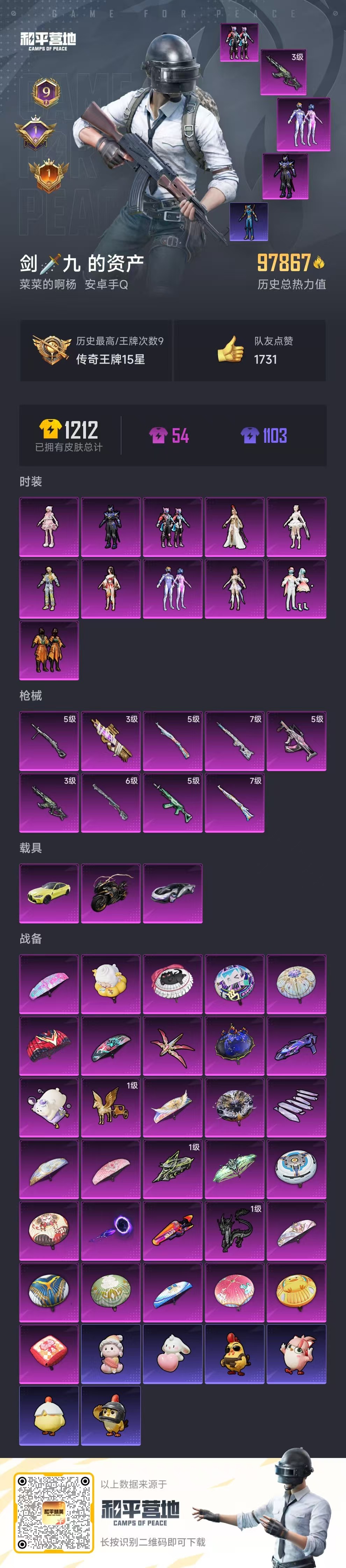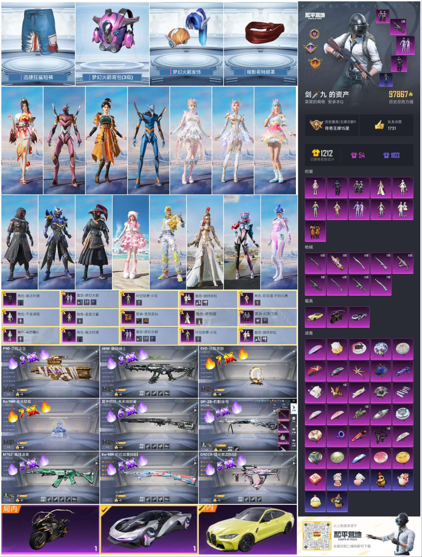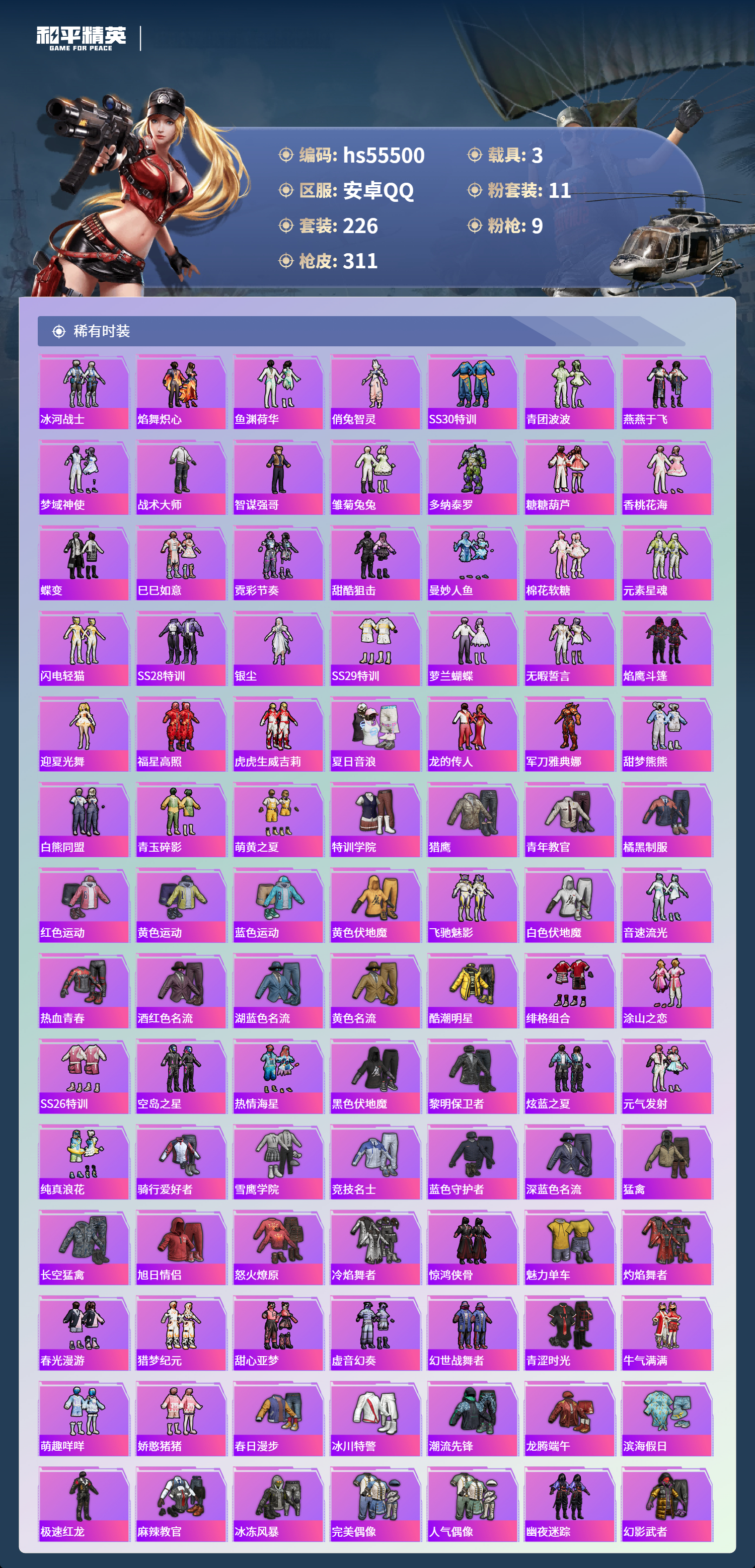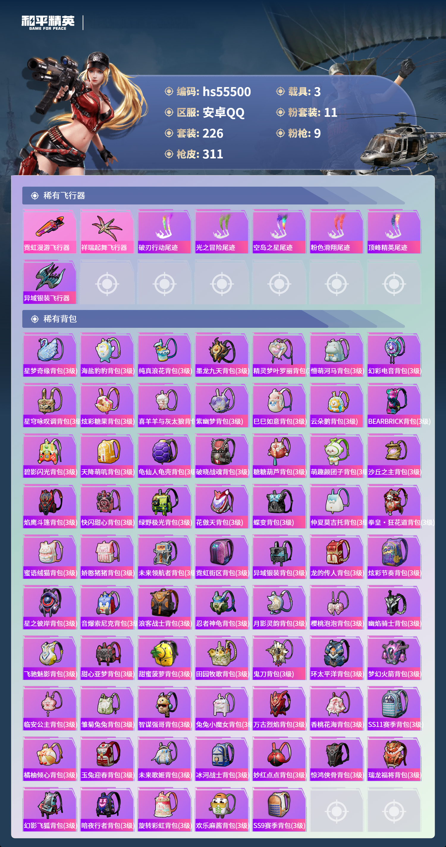 hs55500 安卓手q-9王牌印记-11粉装-9特效呛-3载具-97867热力值-226套装-311呛皮-1卓越印记-1传奇印记【11粉装】套装-鸾凤武仙时空协奏·火花角色-千金淑猫套装-旋转彩虹套装-幻影飞狐角色-狂花道·不知火舞角色-圣堂之誓套装-梦幻火箭角色-宙之时溯角色-羊梦糖心角色-萨利娅【9特效呛】dp-28-豹影疾电/5级kar98k-未来歌姬/7级p9