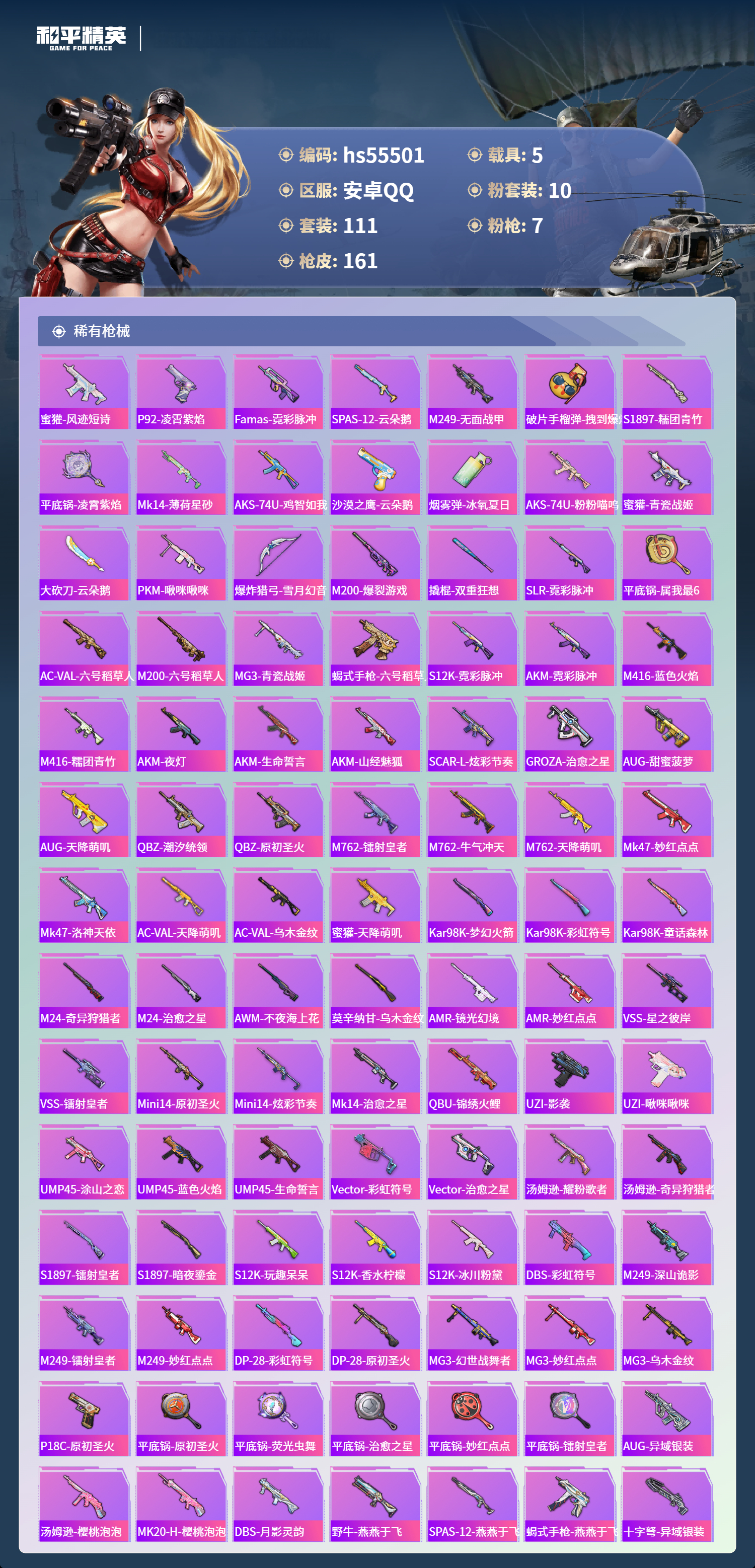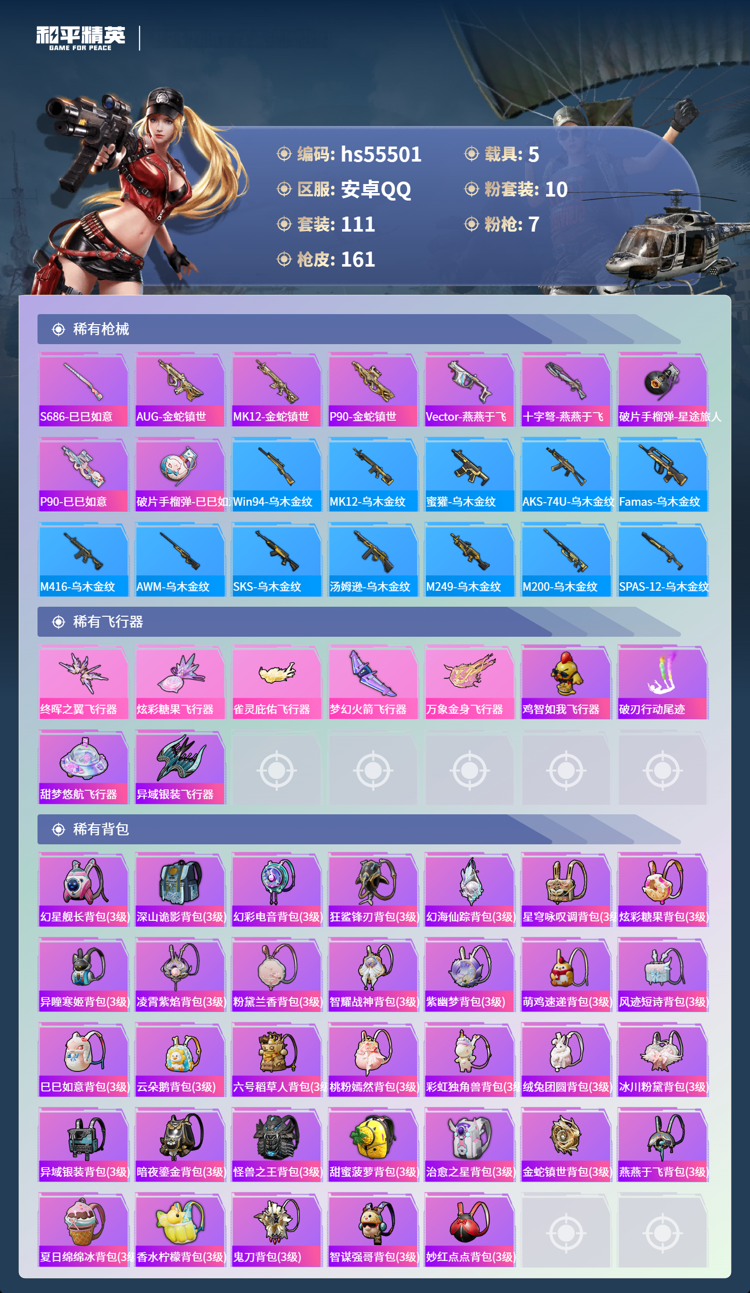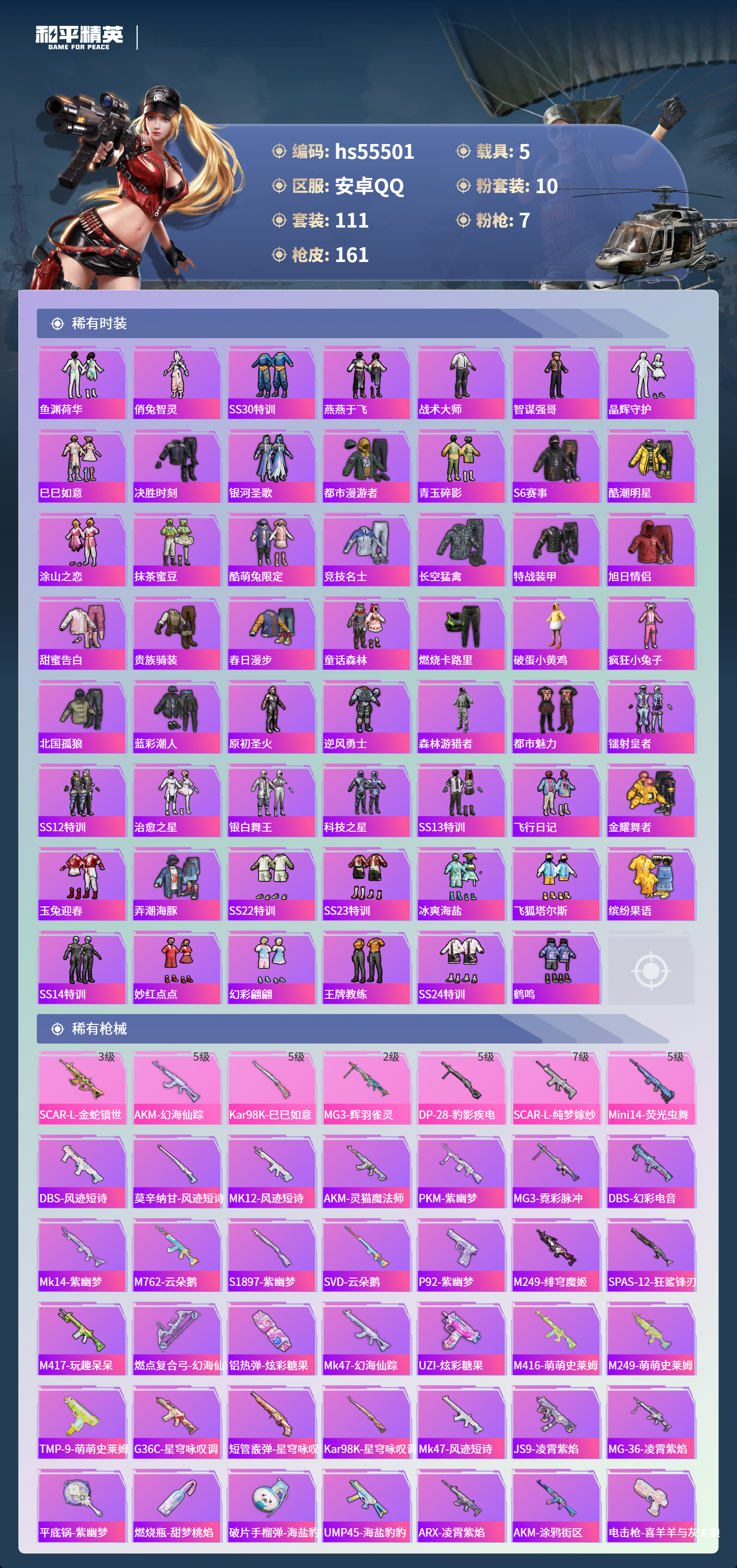 hs55501 安卓手q-11王牌印记-1红装-10粉装-7特效呛-5载具-57279热力值-111套装-161呛皮-1卓越印记【1红装】辉羽雀灵-初翊/2级【10粉装】套装-冰川幽秘套装-星空之魅套装-新星烈龙套装-绚金战神套装-迷蝶贵族套装-雪月幻音角色-狂魅哈莉角色-罗征套装-梦幻火箭角色-智耀战神【7特效呛】dp-28-豹影疾电/5级mini14-荧光虫舞/5级