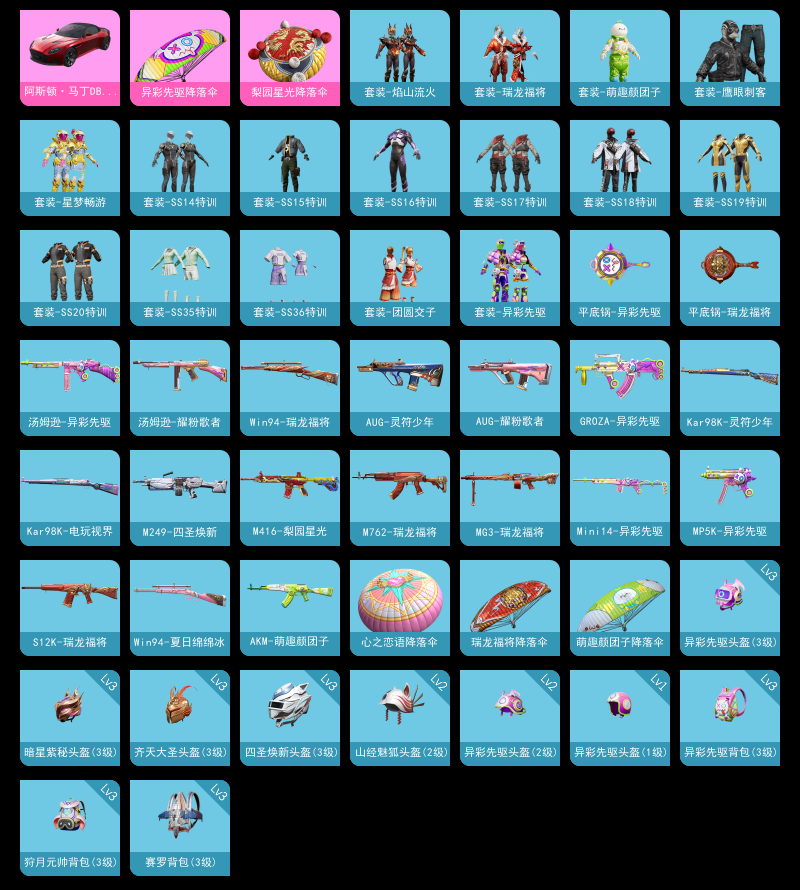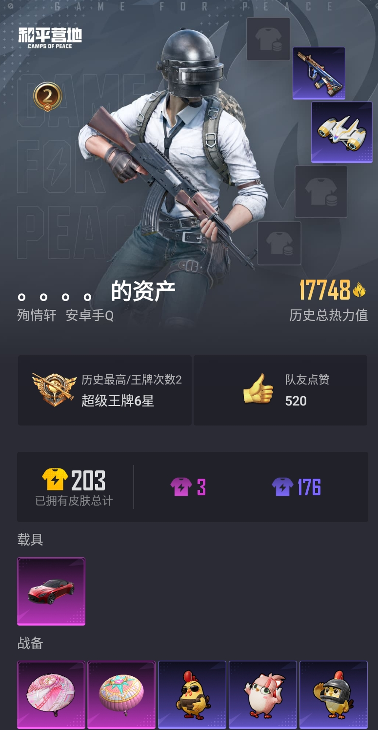 【和平精英】【lyhp19107】1载具 阿斯顿马丁 0粉装,0特效呛,1载具,历史最高段位:超级王牌6星 王牌印记2次 热力值:17748,44套装,53呛械,56装备,33战备;套装:套装-特训学院,套装-红色运动,套装-黄色运动,套装-蓝色运动,套装-白色伏地魔,套装-竞技名士,套装-湖蓝色名流,套装-猛禽,套装-长空猛禽,套装-战地督导,套装-滨海假日,套装-鹰眼刺客,套装-幻影武者,套装-怒火燎原,套装-超能勇士,套装-幻世战舞者,套装-格斗先锋,套装-北国孤狼,套装-霓虹街区,套装-夏日音浪,套装-探宝勇士,套装-牛气满满,套装-萌趣颜团子,套装-ss18特训,套装-ss14特训,套装-吉莉礼服,套装-星梦畅游,套装-ss15特训,套装-ss16特训,套装-ss17特训,套装-瑞龙福将,套装-团圆交子,套装-焰山流火,套装-福星高照,套装-虎虎生威吉莉,套装-异彩先驱,套装-霓虹极客,套装-ss19特训,套装-ss20特训,套装-绯格组合,套装-王牌教练,套装-ss35特训,套装-ss36特训,套装-雪国风尚;呛皮:akm-破晓战魂,akm-夜灯,akm-彩虹符号,akm-萌趣颜团子,akm-虎虎生威,g36c-乌木金纹,aug-耀粉歌者,aug-灵符少年,m762-牛气冲天,m762-瑞龙福将,groza-异彩先驱,m16a4-蓝色火焰,m416-红色方程式,m416-梨园星光,scar-l-红色方程式,kar98k-彩虹符号,kar98k-炫彩节奏,kar98k-电玩视界,kar98k-灵符少年,kar98k-乌木金纹,win94-夏日绵绵冰,win94-瑞龙福将,m24-乌木金纹,mk12-乌木金纹,mk14-乌木金纹,mini14-炫彩节奏,mini14-异彩先驱,sks-炫彩节奏,汤姆逊-耀粉歌者,汤姆逊-炫彩节奏,汤姆逊-异彩先驱,汤姆逊-天降萌叽,汤姆逊-乌木金纹,vect-彩虹符号,uzi-红色方程式,uzi-炫彩节奏,野牛-夜灯,野牛-乌木金纹,mp5k-异彩先驱,ump45-蓝色火焰,s12k-破晓战魂,s12k-瑞龙福将,s12k-幻世战舞者,s1897-乌木金纹,s686-红色方程式,mg3-瑞龙福将,mg3-幻世战舞者,m249-四圣焕新,m249-乌木金纹,平底锅-瑞龙福将,平底锅-空投萌叽,平底锅-异彩先驱,突击盾牌-绝对恒星;载具:阿斯顿·马丁dbs红;降落伞:火焰蝠人飞行服,登顶巅峰飞行器; 详情看图