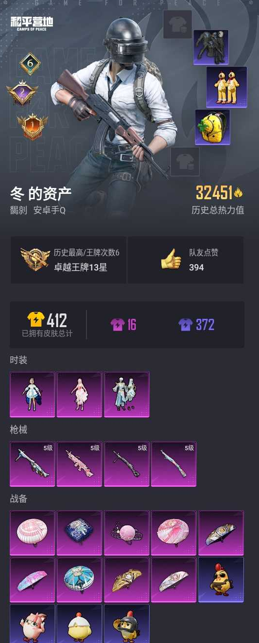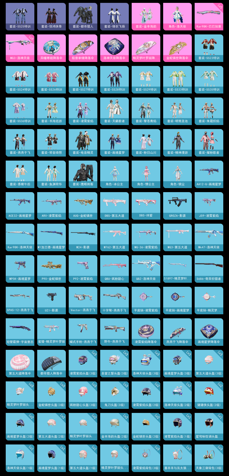 【和平精英】【lyhp19085】3粉4特效呛 都市猎人 洛天依 mg3洛神 大菠萝 3粉装,4特效呛,0载具,历史最高段位:卓越王牌13星 王牌印记6次 热力值:32985,103套装,102呛械,139装备,56战备;套装:角色-洛天依,套装-金丰海韵,角色-绝对恒星,套装-特训学院,套装-猎鹰,套装-青年教官,套装-橘黑制服,套装-红色运动,套装-黄色运动,套装-蓝色运动,套装-黄色伏地魔,套装-白色伏地魔,套装-黑色伏地魔,套装-竞技名士,套装-深蓝色名流,套装-酒红色名流,套装-湖蓝色名流,套装-黄色名流,套装-猛禽,套装-长空猛禽,套装-海岛探路者,套装-冷焰舞者,套装-灼焰舞者,套装-都市猎人,套装-特战装甲,套装-战地督导,套装-鹰眼刺客,套装-完美偶像,套装-人气偶像,套装-幻影武者,套装-街头潮人,套装-蓝彩潮人,套装-魅力单车,套装-绮丽涂鸦,套装-竞技达人朋克,套装-破晓战魂,套装-森林游猎者,套装-都市魅力,套装-热血青春,套装-幻世战舞者,套装-夏日倾情,套装-缤纷果语,套装-元素星魂,套装-极速红龙,套装-破蛋小黄鸡,套装-精神漫游,套装-鹤鸣,套装-白糯汤圆,套装-战术大师,套装-耀粉歌者,套装-天籁歌者,套装-电音精灵,套装-吉莉礼服,套装-tt战队服,套装-ss23特训,套装-香榭午后,套装-王牌教练,套装-青玉碎影,套装-ss24特训,套装-龟仙人,套装-ss25特训,套装-惊鸿侠骨,套装-锦衣飞扬,套装-龙的传人,套装-冰河战士,套装-ss26特训,套装-漫游都市,套装-明鸳圣池,套装-云魄琉璃,套装-ss27特训,套装-ss28特训,角色-情公主,角色-冰公主,角色-银尘,套装-街头风暴,套装-海盐绵绵冰,套装-蝶变,套装-粉日山川,套装-ss29特训,套装-ss31特训,套装-鱼渊荷华,套装-燕燕于飞,套装-智谋强哥,套装-ss33特训,套装-巳巳如意,套装-ss32特训,套装-狂鲨锋刃,套装-大橘大利,套装-元气之梦,套装-ss34特训,套装-擎苍青焰,套装-朱霞炽焰,套装-凌霄紫焰,套装-薄荷星砂,套装-ss35特训,套装-琴音绮想,角色-超感刻度,套装-画境星梦,套装-书海巡游,角色-甜心蒙太奇,套装-ss36特训,套装-雪国风尚,套装-萌鸡速递;呛皮:m762-第五大道,m762-登顶巅峰,mk47-洛神天依,akm-破晓战魂,akm-龙的传人,akm-霓彩脉冲,aug-甜蜜菠萝,aug-天降萌叽,aug-异域银装,aug-金蛇镇世,aug-绝对恒星,scar-l-海盐豹豹,蜜獾-天降萌叽,蜜獾-精灵梦叶罗丽,蜜獾-乌木金纹,m16a4-幻世战舞者,m16a4-冰河战士,ac-val-乌木金纹,ac-val-天降萌叽,famas-霓彩脉冲,famas-乌木金纹,ace32-画境星梦,arx-凌霄紫焰,groza-影袭,groza-海盐豹豹,m416-糯团青竹,q-彩虹符号,q-洛神天依,5级kar98k-巳巳如意,kar98k-洛神天依,amr-乌木金纹,m200-惊鸿侠骨,m200-乌木金纹,win94-乌木金纹,莫辛纳甘-乌木金纹,m24-影袭,mk20-h-狂鲨锋刃,mk20-h-乌木金纹,mk12-乌木金纹,vss-香桃花海,qbu-飒粉甜心,mk14-冰河战士,mk14-薄荷星砂,mk14-紫晶流影,slr-霓彩脉冲,mini14-炫彩节奏,mini14-香桃花海,m1加兰德-画境星梦,m417-惊鸿侠骨,mp5k-画境星梦,mp5k-乌木金纹,js9-凌霄紫焰,uzi-影袭,uzi-天降萌叽,uzi-冰河战士,uzi-炫彩糖果,野牛-燕燕于飞,vect-燕燕于飞,p90-玩趣呆呆,p90-巳巳如意,p90-金蛇镇世,p90-乌木金纹,汤姆逊-天降萌叽,aks-74u-乌木金纹,ump45-海盐豹豹,spas-12-燕燕于飞,spas-12-狂鲨锋刃,spas-12-乌木金纹,dbs-第五大道,dbs-彩虹符号,dbs-绊爱,dbs-乌木金纹,s12k-夜灯,s12k-霓彩脉冲,s686-奇异狩猎者,s686-巳巳如意,s1897-精灵梦叶罗丽,aa12-g-画境星梦,5级mg3-洛神天依,mg3-幻世战舞者,mg3-第五大道,mg3-惊鸿侠骨,5级m249-绝对恒星,5级dp-28-豹影疾电,dp-28-彩虹符号,mg-36-凌霄紫焰,短管霰弹-宇宙意志,p92-凌霄紫焰,蝎式手呛-燕燕于飞,平底锅-惊鸿侠骨,平底锅-空岛之星,平底锅-精灵梦叶罗丽,平底锅-凌霄紫焰,平底锅-画境星梦,破片手留单-呆爆全场,破片手留单-拽到爆炸,破片手留单-巳巳如意,破片手留单-爆破雪人,爆炸猎弓-惊鸿侠骨,十子怒-燕燕于飞,十子怒-异域银装,突击盾牌-绝对恒星;降落伞:绝对恒星飞行器,顶峰精英尾迹,狂鲨锋刃飞行器,破刃行动尾迹,鸡智如我飞行器,登顶巅峰飞行器; 详情看图