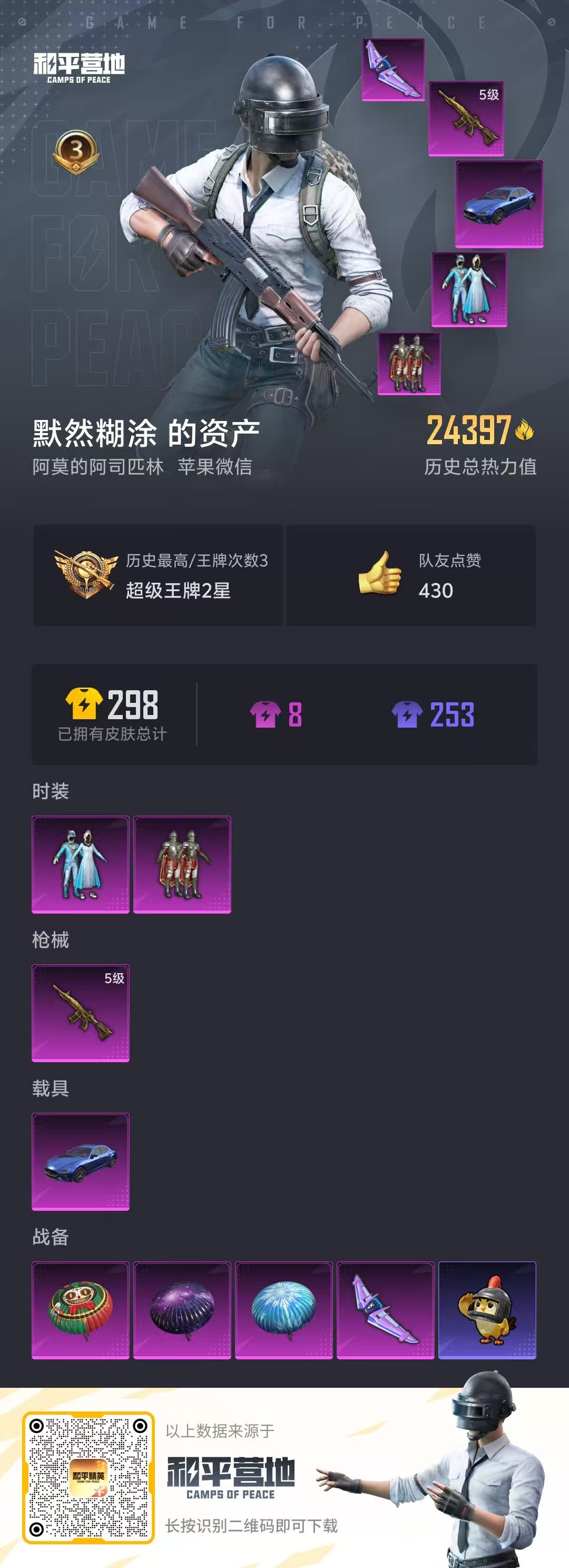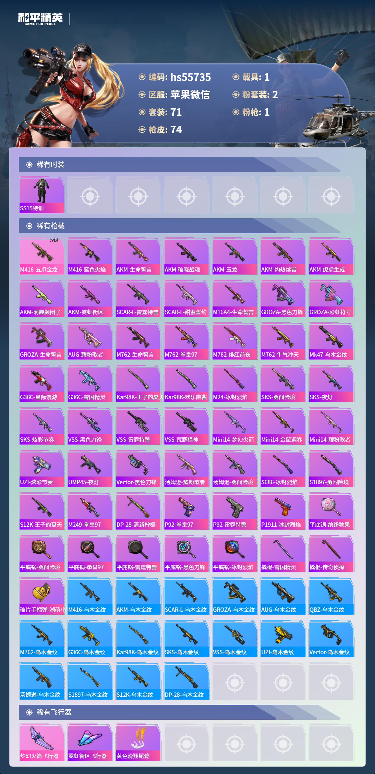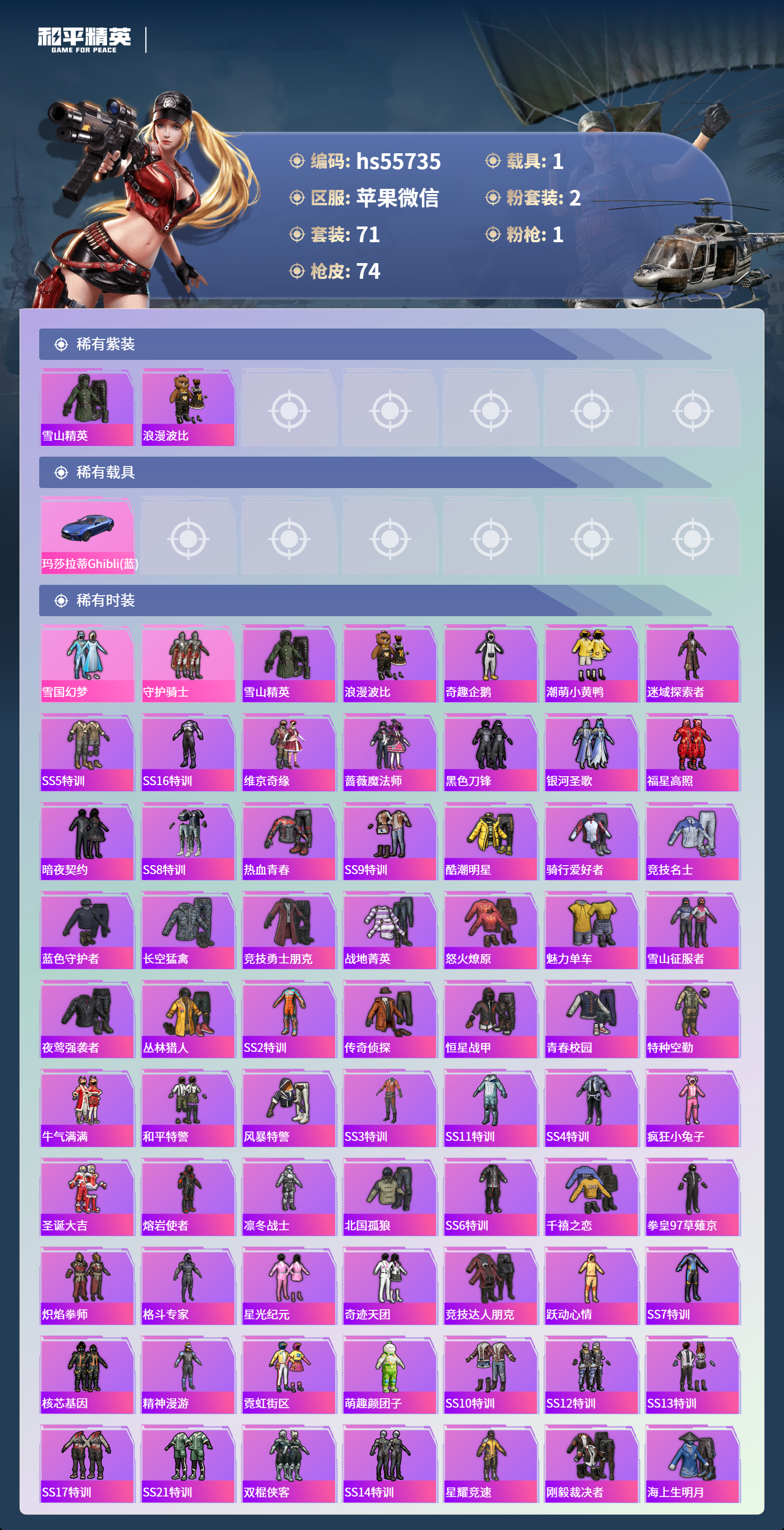 hs55735 苹果微信-3王牌印记-2粉装-1特效呛-1载具-24397热力值-71套装-74呛皮【2粉装】套装-守护骑士套装-雪国幻梦【1特效呛】m416-五爪金龙/5级【2稀有紫装】雪山精英浪漫波比【1稀有载具】玛莎拉蒂ghibli蓝【71稀有时装】雪国幻梦雪山精英浪漫波比守护骑士奇趣企鹅潮萌小黄鸭迷域探索者ss5特训ss16特训维京奇缘蔷薇魔法师黑色