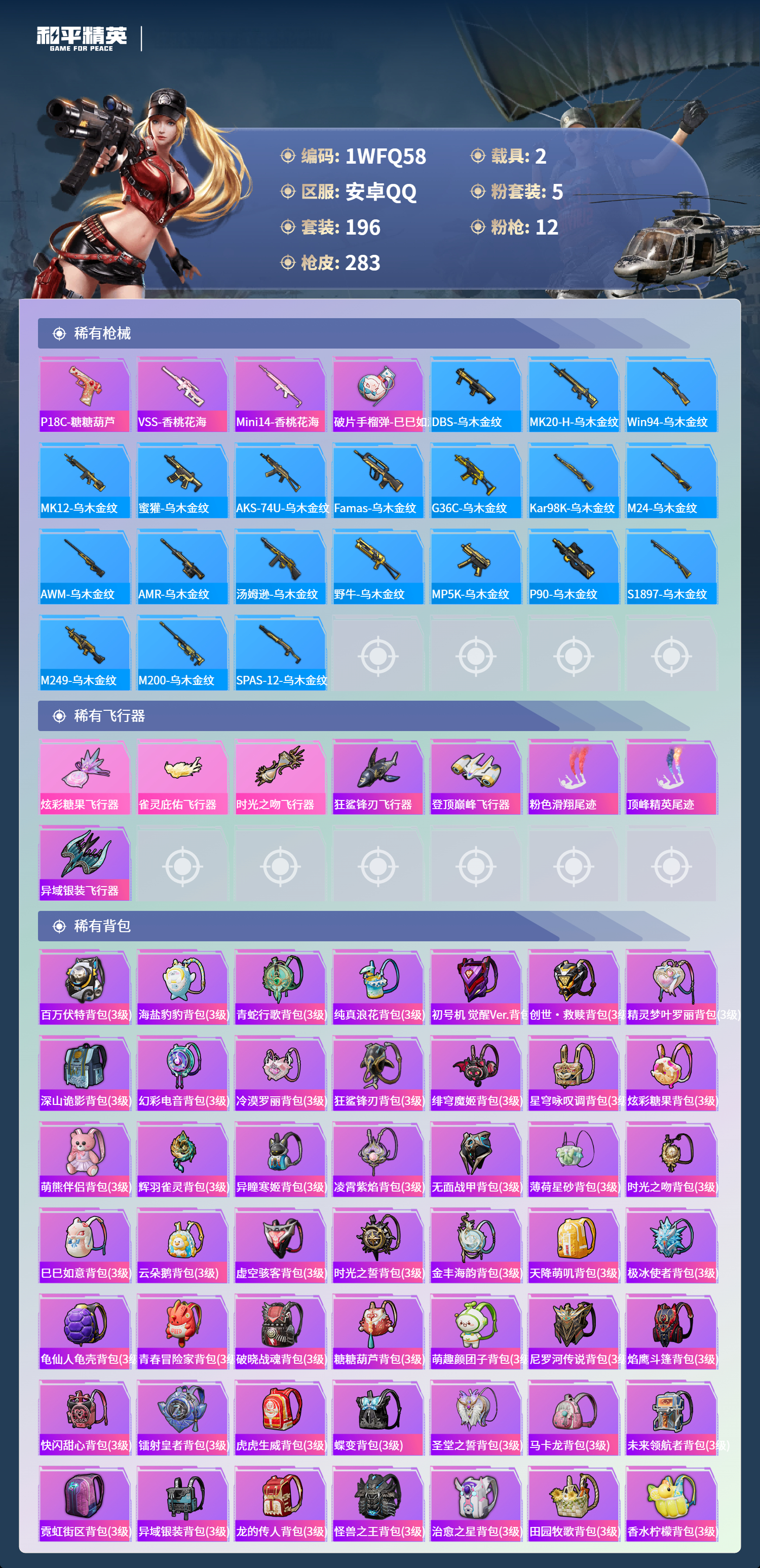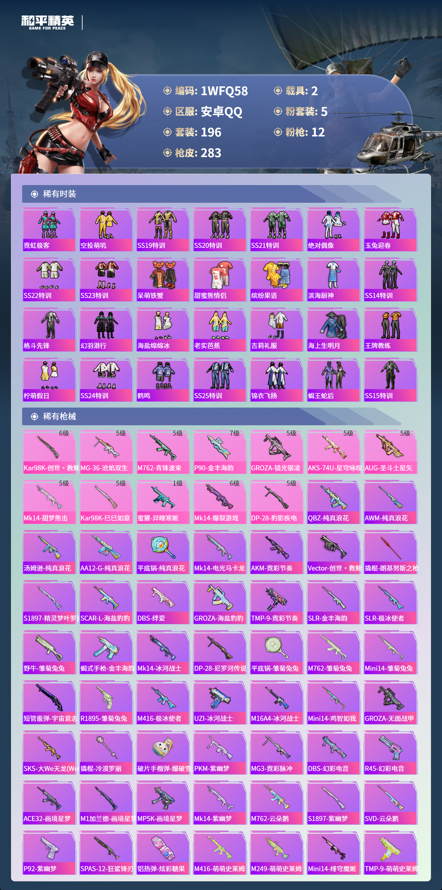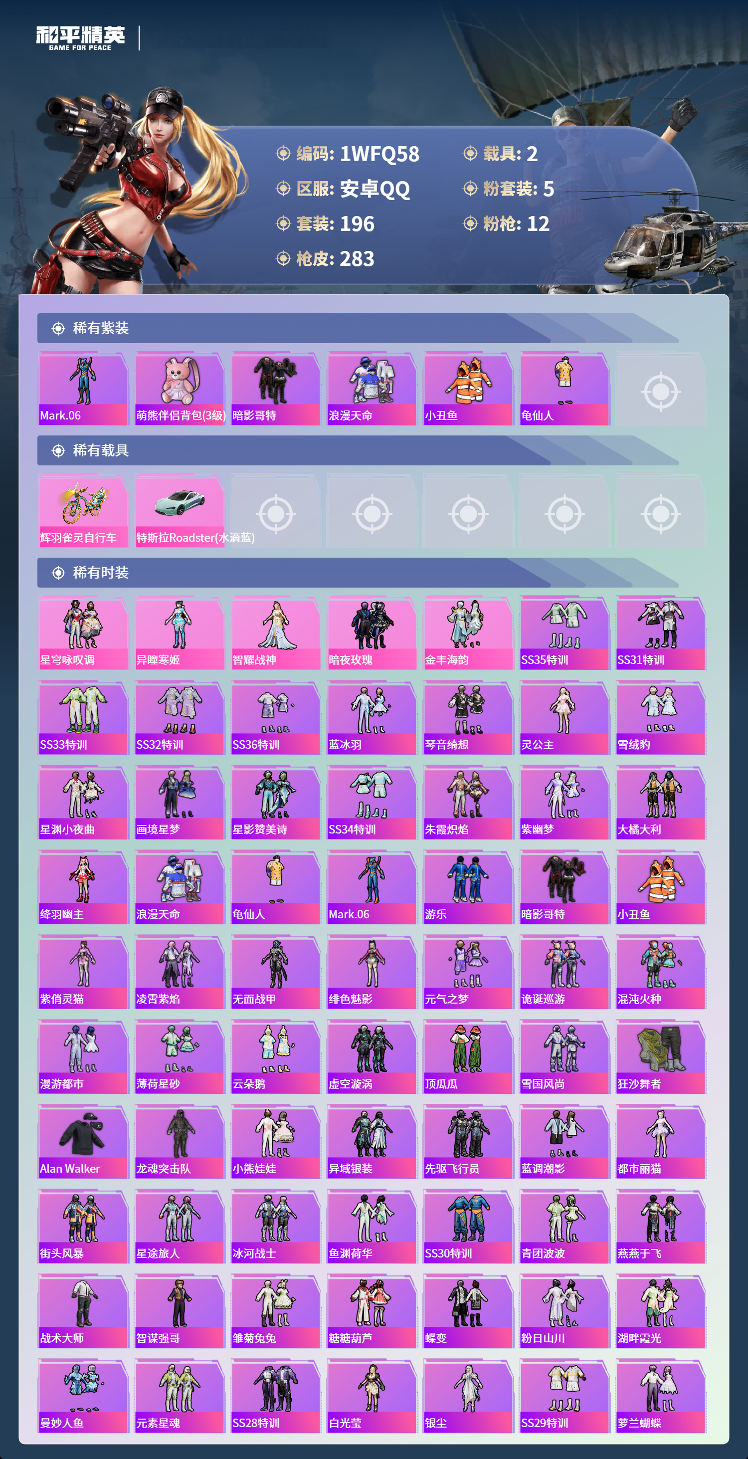 2载具-196套装-283呛皮-5级aug圣斗士-胖达头盔-粉熊背包-红眼罩-5粉12特2车-地铁满天赋