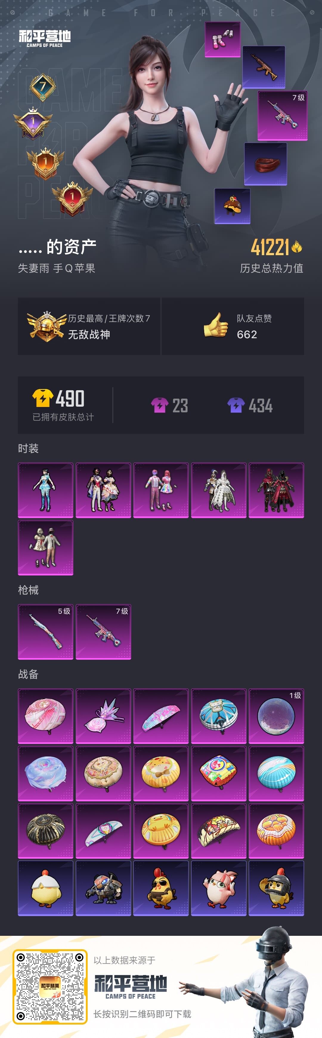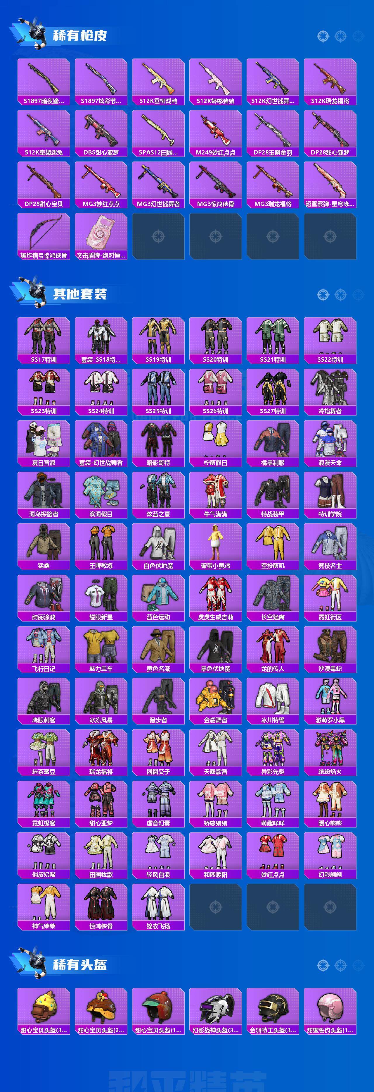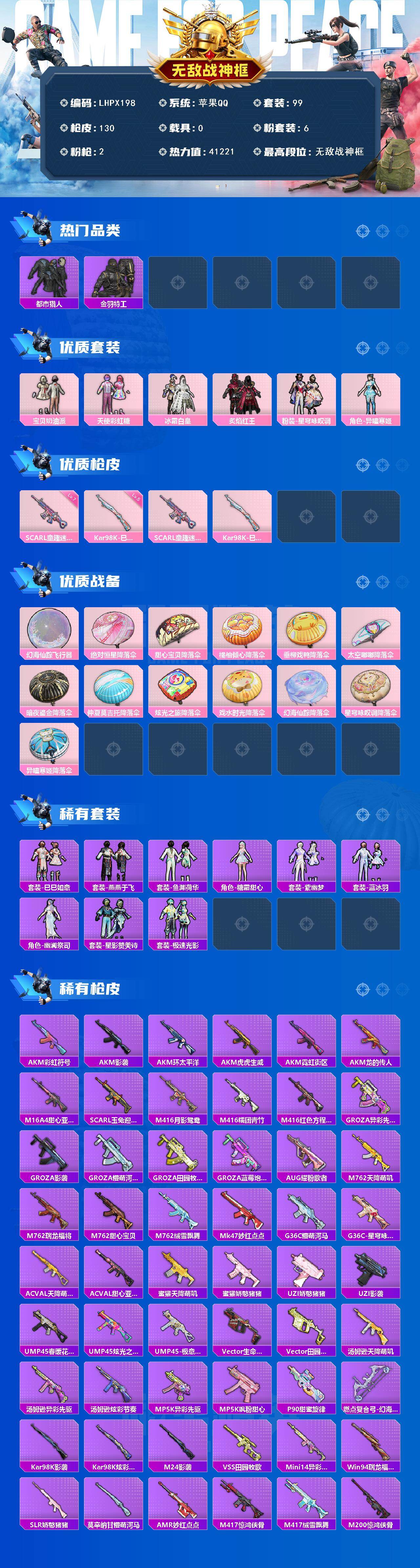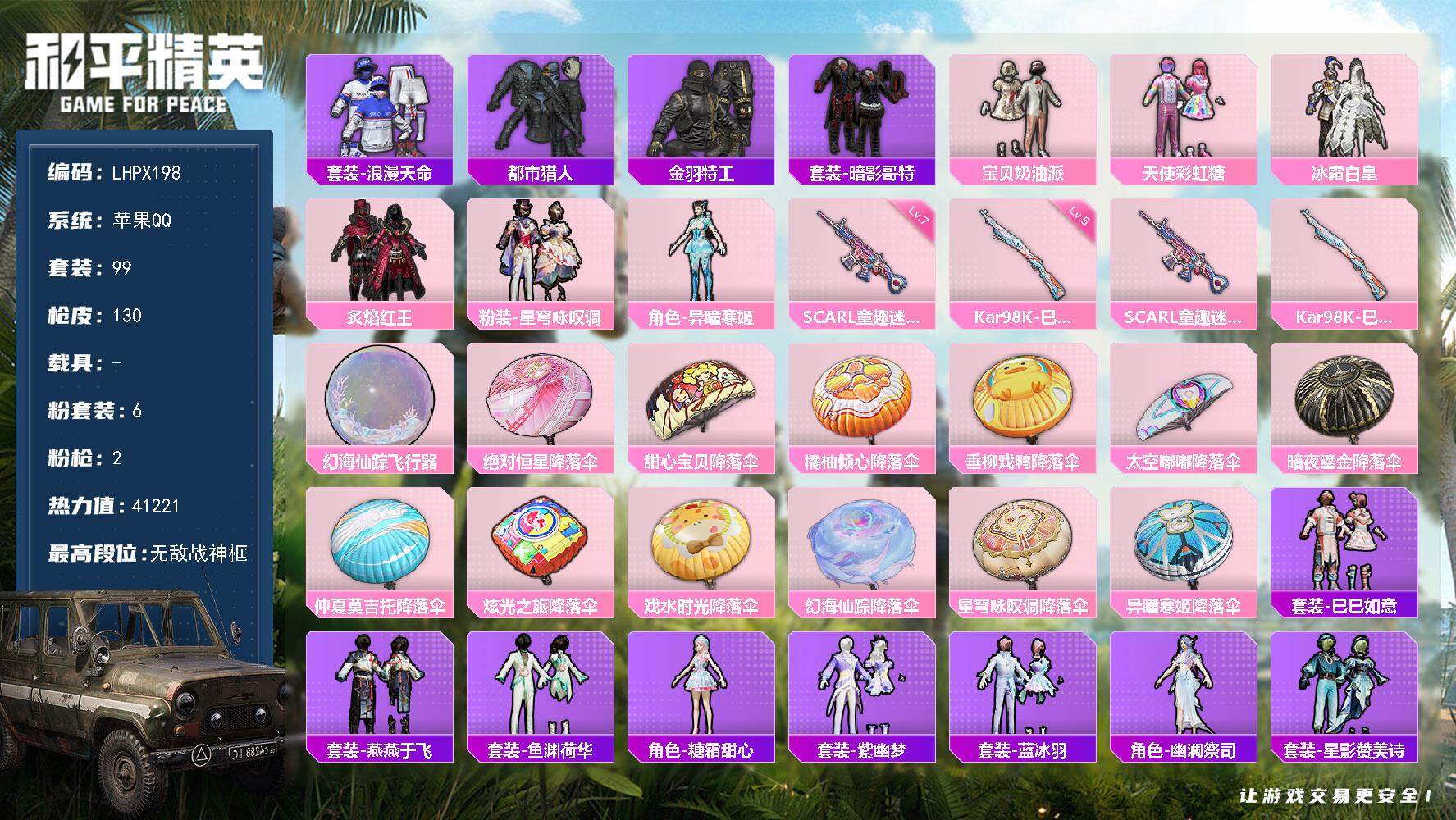 [15223102]【特价出售/店主推荐】苹果 手q-无敌战神框-6粉装-2特效呛-0载具-2粉色飞行器-41221热力值-7王牌印记-99套装-130呛皮 【热门品类】:套装-浪漫天命,套装-都市猎人,套装-金羽特工,套装-暗影哥特 【粉色套装】:粉装-宝贝奶油派,粉装-天使彩虹糖,粉装-冰霜白皇,粉装-炙焰红王,粉装-星穹咏叹调,角色-异瞳寒姬 【粉色呛皮等级】:scar-l-童趣迷兔七级,kar98k-巳巳如意五级 【粉色呛皮】:scar-l-童趣迷兔,kar98k-巳巳如意 【粉色飞行器】:幻海仙踪飞行器 【粉色降落伞】:绝对恒星降落伞,甜心宝贝降落伞,橘柚倾心降落伞,垂柳戏鸭降落伞,太空嘟嘟降落伞,暗夜鎏金降落伞,仲夏莫吉托降落伞,炫光之旅降落伞,戏水时光降落伞,幻海仙踪降落伞,星穹咏叹调降落伞,异瞳寒姬降落伞,炫彩糖果降落伞 【稀有套装】:套装-巳巳如意,套装-燕燕于飞,套装-鱼渊荷华,角色-糖霜甜心,套装-紫幽梦,套装-蓝冰羽,角色-幽澜祭司,套装-星影赞美诗,套装-极速光影,套装-炫彩糖果 【稀有呛皮】:aug-冰晶雪宝,akm-彩虹符号,akm-影袭,akm-环太平洋,akm-虎虎生威,akm-霓虹街区,akm-龙的传人,m16a4-甜心亚梦,scar-l-玉兔迎春,m416-月影鸳鸯,m416-糯团青竹,m416-红色方程式,groza-异彩先驱,groza-影袭,groza-懵萌河马,groza-田园牧歌,groza-蓝莓炮弹,aug-耀粉歌者,m762-天降萌叽,m762-瑞龙福将,m762-甜心宝贝,m762-绒雪飘舞,mk47-妙红点点,g36c-懵萌河马,g36c-星穹咏叹调,ac-val-天降萌叽,ac-val-甜心亚梦,蜜獾-天降萌叽,蜜獾-娇憨猪猪,uzi-娇憨猪猪,uzi-影袭,ump45-春暖花开,ump45-炫光之旅,ump45-极意拳锋,vect-生命誓言,vect-田园牧歌,汤姆逊-天降萌叽,汤姆逊-异彩先驱,汤姆逊-炫彩节奏,mp5k-异彩先驱,mp5k-飒粉甜心,p90-甜蜜旋律,燃点复合弓-幻海仙踪,kar98k-影袭,kar98k-炫彩节奏,m24-影袭,vss-田园牧歌,mini14-异彩先驱,win94-瑞龙福将,slr-娇憨猪猪,莫辛纳甘-懵萌河马,amr-妙红点点,m417-惊鸿侠骨,m417-绒雪飘舞,m