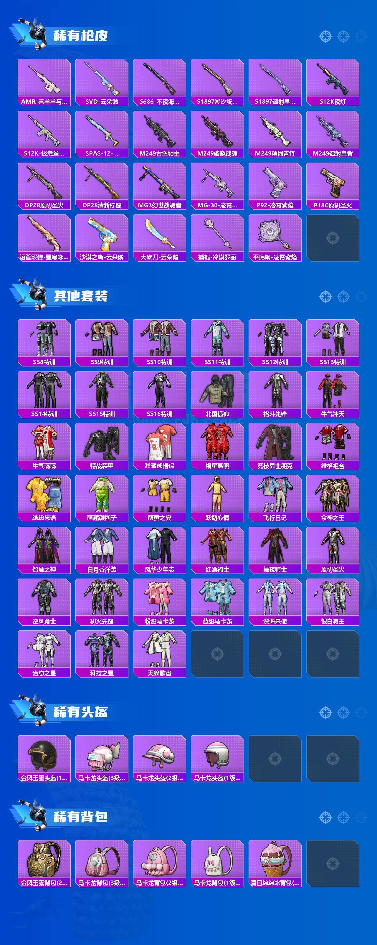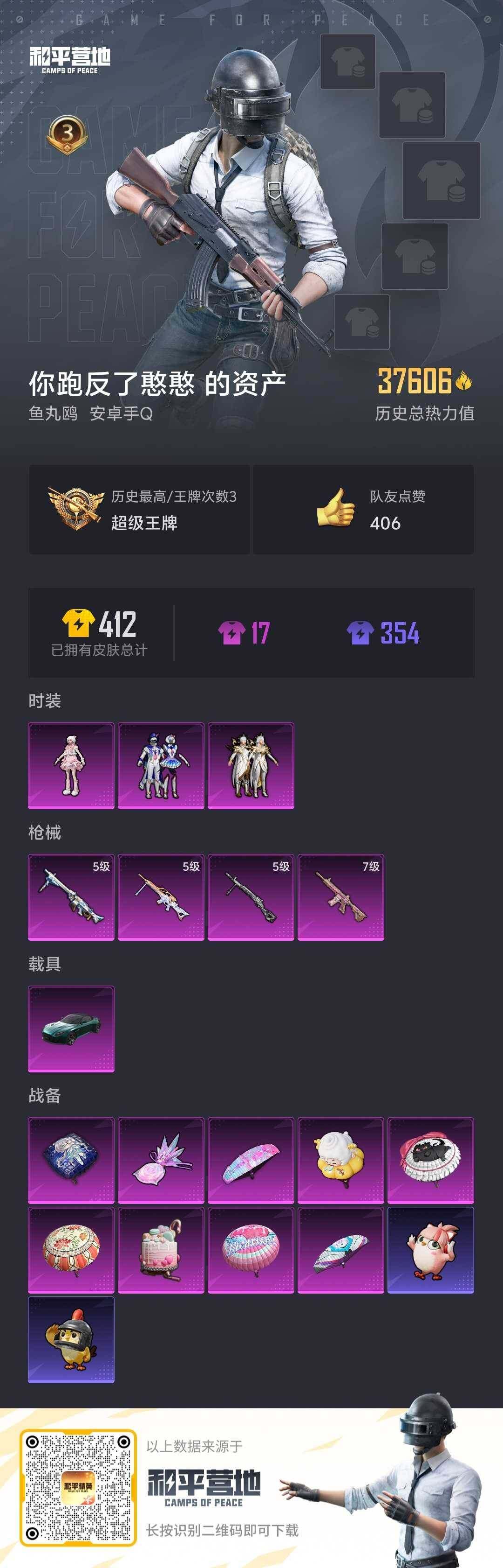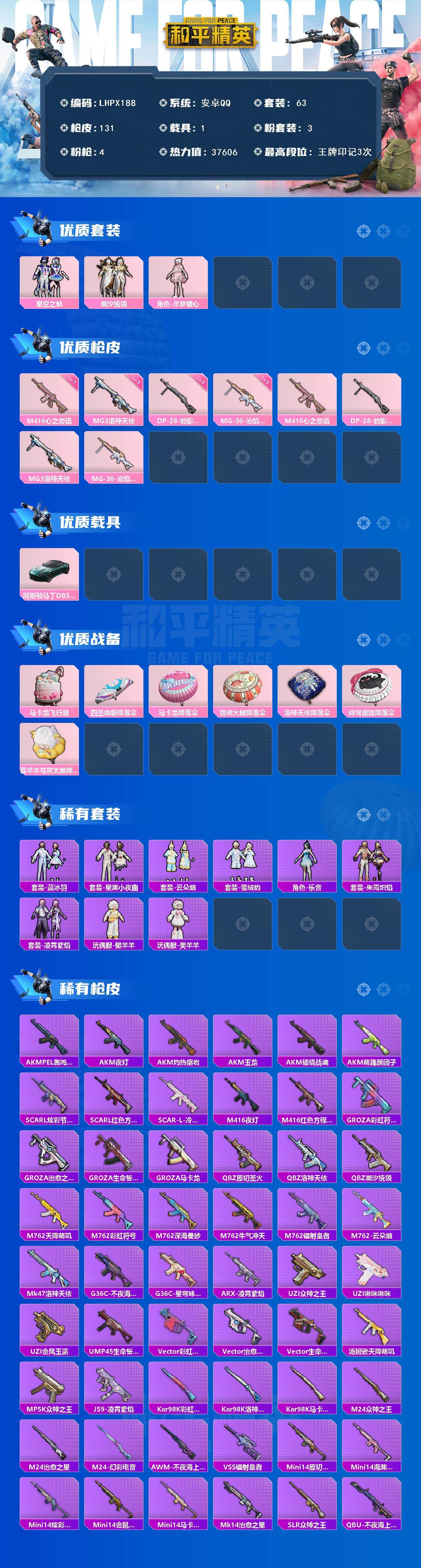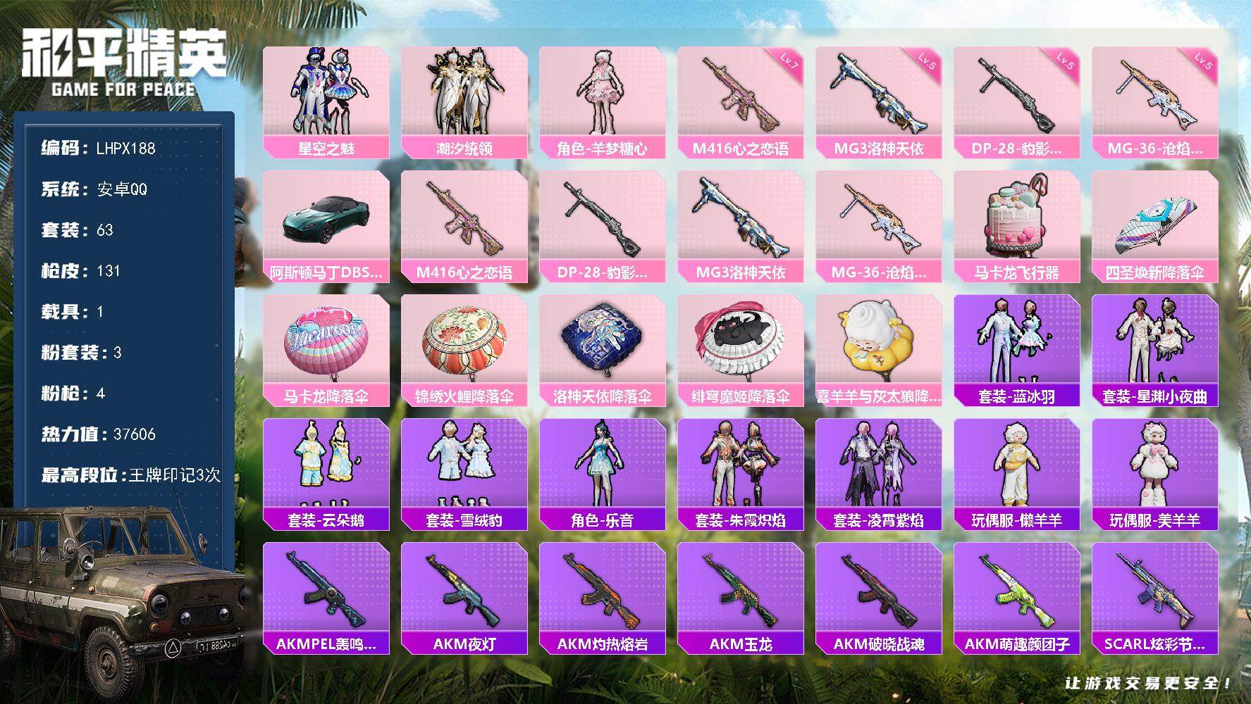 [15223124]【店主推荐捡漏号!可直接换绑】安卓 手q-3粉装-4特效呛-1载具-2粉色飞行器-37606热力值-3王牌印记-63套装-131呛皮 【粉色套装】:粉装-星空之魅,粉装-潮汐统领,角色-羊梦糖心 【粉色呛皮等级】:m416-心之恋语七级,dp-28-豹影疾电五级,mg3-洛神天依五级,mg-36-沧焰双生五级 【粉色载具】:阿斯顿马丁dbs(绿) 【粉色呛皮】:m416-心之恋语,dp-28-豹影疾电,mg3-洛神天依,mg-36-沧焰双生 【粉色飞行器】:马卡龙飞行器 【粉色降落伞】:四圣焕新降落伞,马卡龙降落伞,锦绣火鲤降落伞,洛神天依降落伞,绯穹魔姬降落伞,喜羊羊与灰太狼降落伞,炫彩糖果降落伞 【稀有套装】:套装-雪国风尚,套装-蓝冰羽,套装-星渊小夜曲,套装-云朵鹅,套装-雪绒豹,角色-乐音,套装-朱霞炽焰,套装-凌霄紫焰,玩偶服-懒羊羊,玩偶服-美羊羊,套装-炫彩糖果 【稀有呛皮】:akm-pel轰鸣竞梦者,akm-夜灯,akm-灼热熔岩,akm-玉龙,akm-破晓战魂,akm-萌趣颜团子,scar-l-炫彩节奏,scar-l-红色方程式,scar-l-冷漠罗丽,m416-夜灯,m416-红色方程式,groza-彩虹符号,groza-治愈之星,groza-生命誓言,groza-马卡龙,q-原初圣火,q-洛神天依,q-潮汐统领,m762-天降萌叽,m762-彩虹符号,m762-深海曼妙,m762-牛气冲天,m762-镭射皇者,m762-云朵鹅,mk47-洛神天依,g36c-不夜海上花,g36c-星穹咏叹调,arx-凌霄紫焰,uzi-众神之王,uzi-啾咪啾咪,uzi-金风玉露,ump45-生命誓言,vect-彩虹符号,vect-治愈之星,vect-生命誓言,汤姆逊-天降萌叽,mp5k-众神之王,js9-凌霄紫焰,kar98k-彩虹符号,kar98k-洛神天依,kar98k-马卡龙,m24-治愈之星,m24-众神之王,m24-幻彩电音,awm-不夜海上花,vss-镭射皇者,mini14-原初圣火,mini14-海渊国主,mini14-炫彩节奏,mini14-金鼠迎春,mini14-马卡龙,mk14-治愈之星,slr-众神之王,qbu-不夜海上花,amr-喜羊羊与灰太狼,svd-云朵鹅,s686-不夜海上花,s1897-
