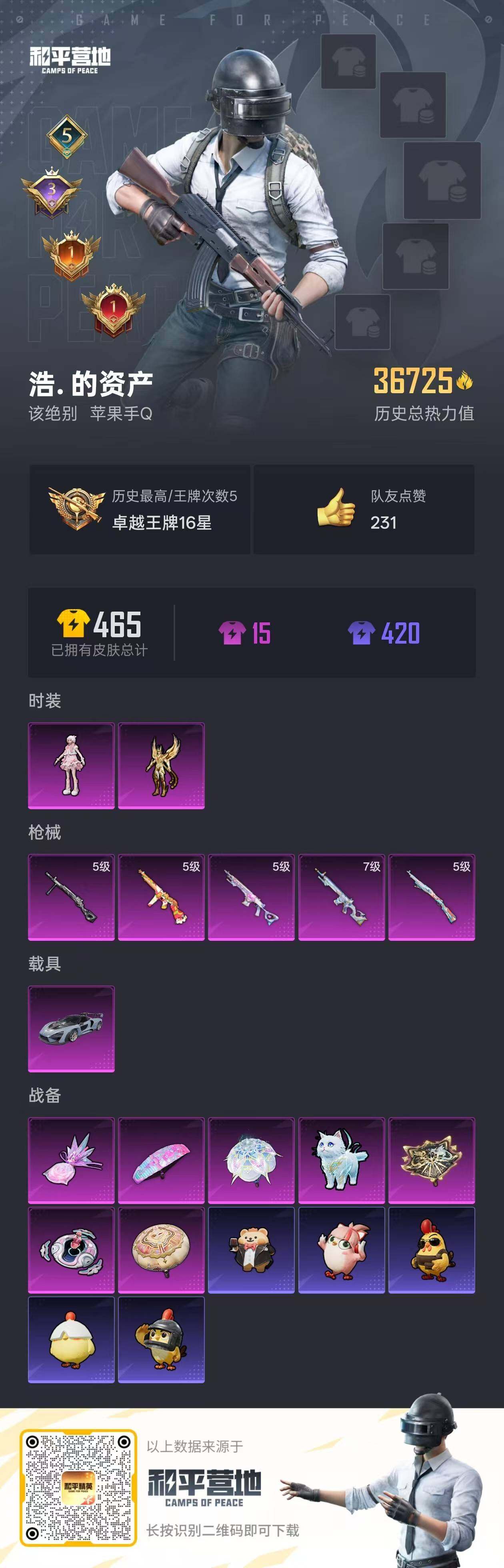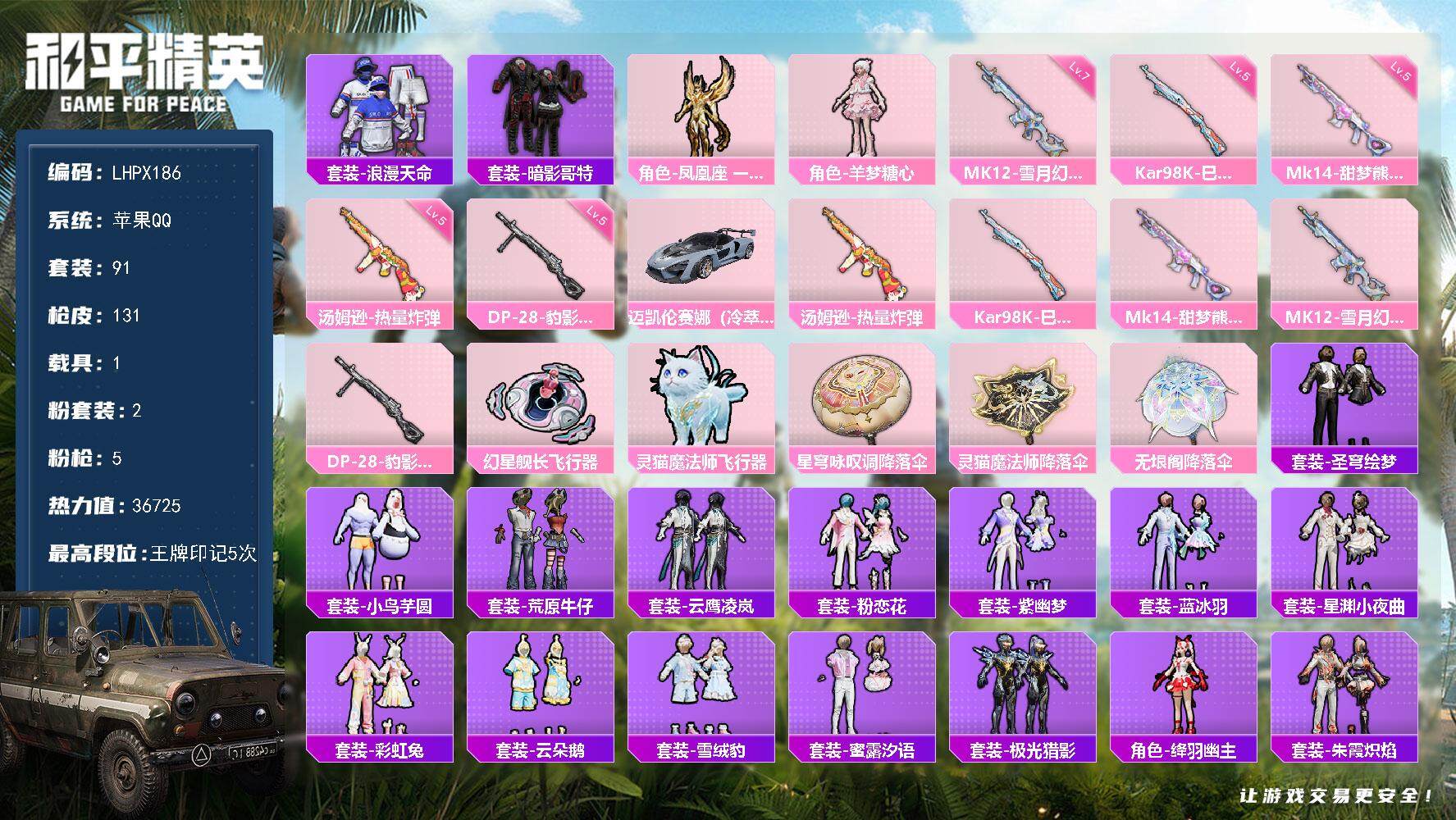 [15223142]【特价出售/店主推荐】 地铁满天赋 苹果 手q-2粉装-5特效呛-1载具-3粉色飞行器-36725热力值-5王牌印记-91套装-131呛皮【热门品类】:套装-浪漫天命,套装-暗影哥特【粉色套装】:角色-凤凰座 一辉,角色-羊梦糖心【粉色呛皮等级】:汤姆逊-热量炸弹五级,kar98k-巳巳如意五级,mk14-甜梦熊击五级,mk12-雪月幻音七级,dp-28-豹影疾电五级【粉色载具】:迈凯伦塞纳(冷萃蓝)【粉色呛皮】:汤姆逊-热量炸弹,kar98k-巳巳如意,mk14-甜梦熊击,mk12-雪月幻音,dp-28-豹影疾电【粉色飞行器】:幻星舰长飞行器,灵猫魔法师飞行器