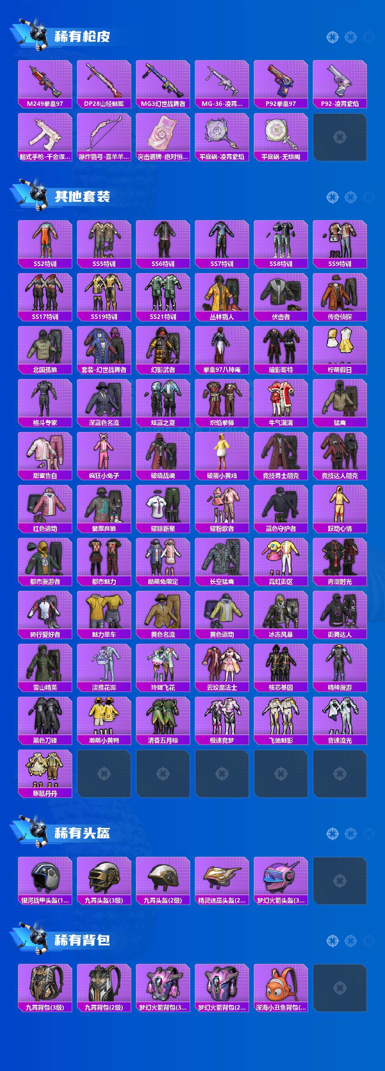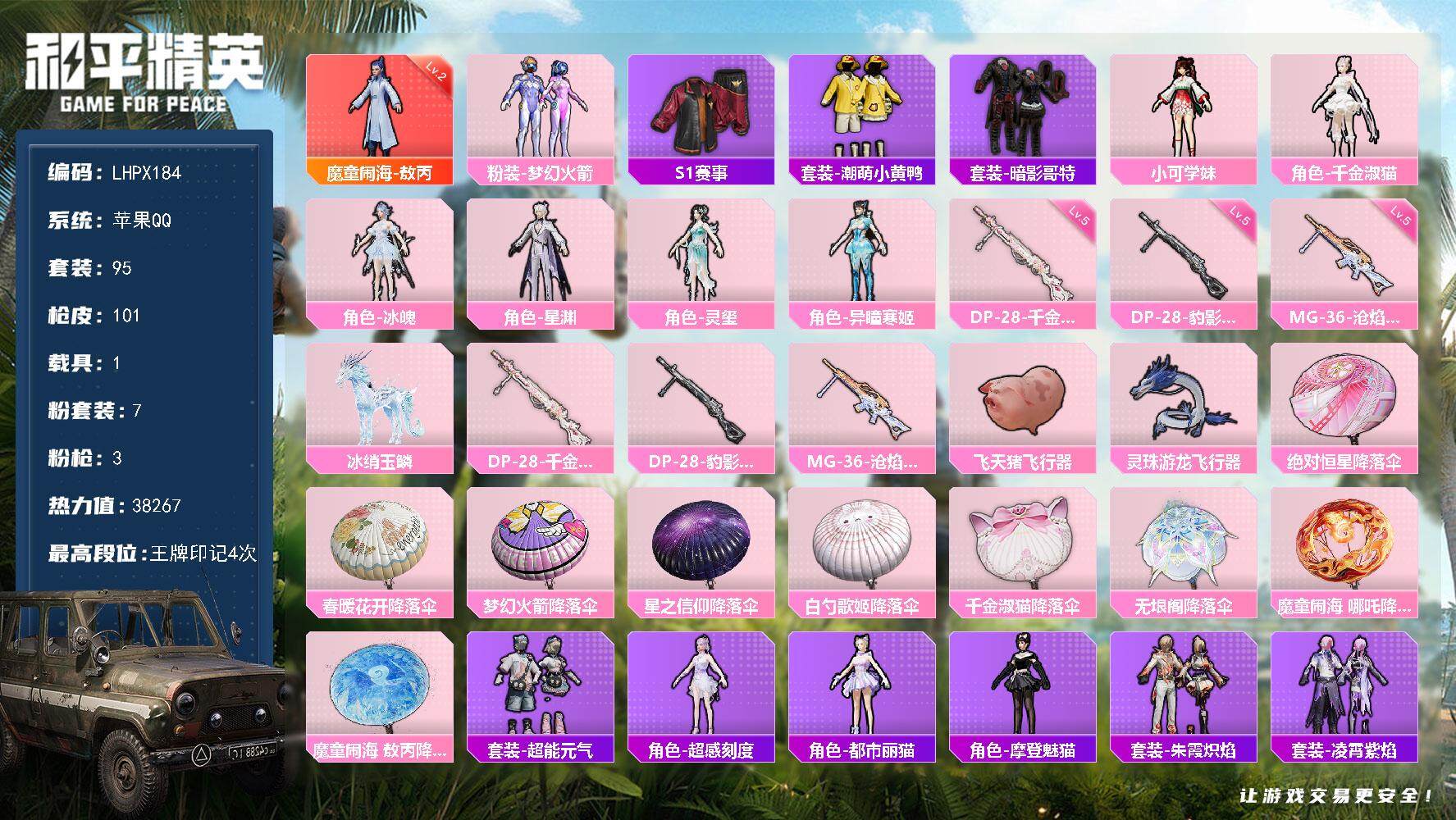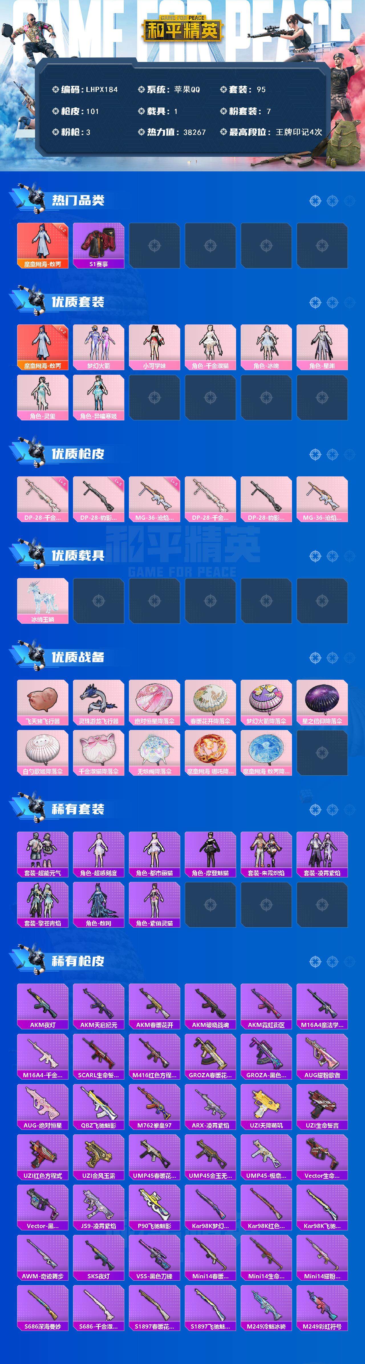 [15223196]【特价出售/店主推荐】苹果 手q-1神装-7粉装-3特效呛-1载具-4粉色飞行器-38267热力值-4王牌印记-95套装-101呛皮 【红色神装等级】:魔童闹海-敖丙二级 【红色角色神装】:魔童闹海-敖丙 【热门品类】:粉装-梦幻火箭,套装-s1赛事,套装-潮萌小黄鸭,套装-暗影哥特 【粉色套装】:粉装-梦幻火箭,角色-小可学妹,角色-千金淑猫,角色-冰魄,角色-星渊,角色-灵玺,角色-异瞳寒姬 【粉色呛皮等级】:dp-28-千金淑猫五级,dp-28-豹影疾电五级,mg-36-沧焰双生五级 【粉色载具】:冰绡玉鳞 【粉色呛皮】:dp-28-千金淑猫,dp-28-豹影疾电,mg-36-沧焰双生 【粉色飞行器】:飞天猪飞行器,灵珠游龙飞行器 【粉色降落伞】:绝对恒星降落伞,春暖花开降落伞,梦幻火箭降落伞,星之信仰降落伞,白勺歌姬降落伞,千金淑猫降落伞,无垠阁降落伞,魔童闹海 哪吒降落伞,魔童闹海 敖丙降落伞,炫彩糖果降落伞 【稀有套装】:套装-超能元气,角色-超感刻度,套装-雪国风尚,角色-都市丽猫,角色-摩登魅猫,套装-朱霞炽焰,套装-凌霄紫焰,套装-擎苍青焰,角色-敖闰,角色-紫俏灵猫,套装-炫彩糖果 【稀有呛皮】:aug-冰晶雪宝,akm-夜灯,akm-天启纪元,akm-春暖花开,akm-破晓战魂,akm-霓虹街区,m16a4-魔法学院,m16a4-千金淑猫,scar-l-生命誓言,m416-红色方程式,groza-春暖花开,groza-黑色刀锋,aug-耀粉歌者,aug-绝对恒星,q-飞驰魅影,m762-拳皇97,arx-凌霄紫焰,uzi-天降萌叽,uzi-生命誓言,uzi-红色方程式,uzi-金风玉露,ump45-春暖花开,ump45-金玉无双,ump45-极意拳锋,vect-生命誓言,vect-黑色刀锋,js9-凌霄紫焰,p90-飞驰魅影,kar98k-梦幻火箭,kar98k-红色方程式,kar98k-飞驰魅影,awm-奇迹舞步,sks-夜灯,vss-黑色刀锋,mini14-春暖花开,mini14-生命誓言,mini14-耀粉歌者,s686-深海曼妙,s686-千金淑猫,s1897-春暖花开,s1897-飞驰魅影,m249-冷魅冰骑,m249-彩虹符号,m249-拳皇97,dp-28-山经魅狐,mg3-幻世战舞者,mg-36-凌