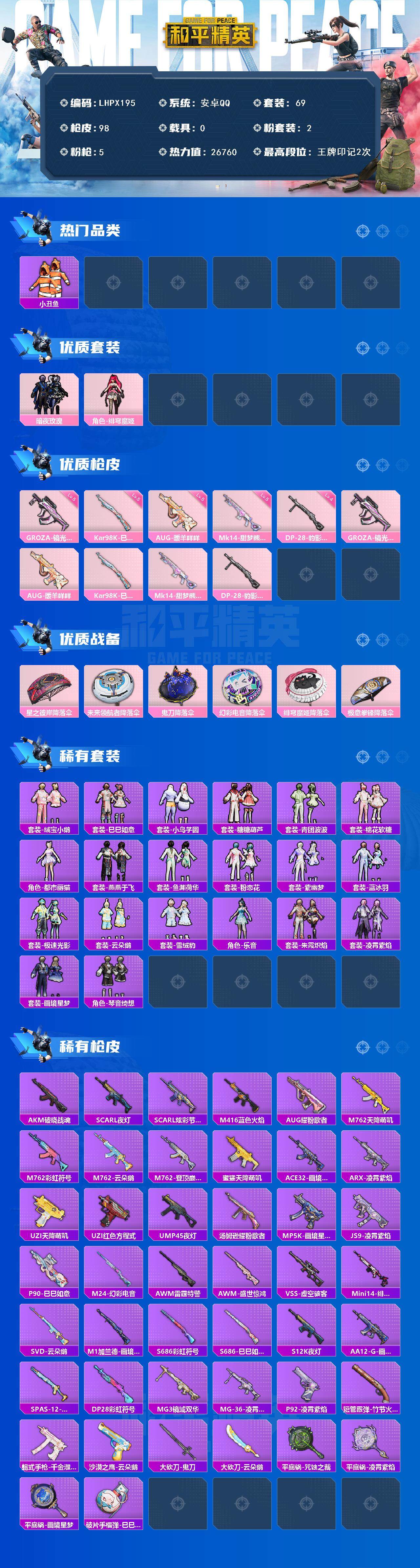 0载具-69套装-98呛皮-【特价出售/店主推荐】安卓 手q-2粉装-5特效呛-0载具-0粉色飞行器-26760热力值-2王牌印记-69套装-98呛皮 【热门品类】:套装-小丑鱼,套装-暗夜之虎,套装-粉红小猪 【粉色套装】:粉装-暗夜玫瑰,角色-绯穹魔姬 【粉色呛皮等级】:groza-镜光银凌五级,aug-暖羊咩咩五级