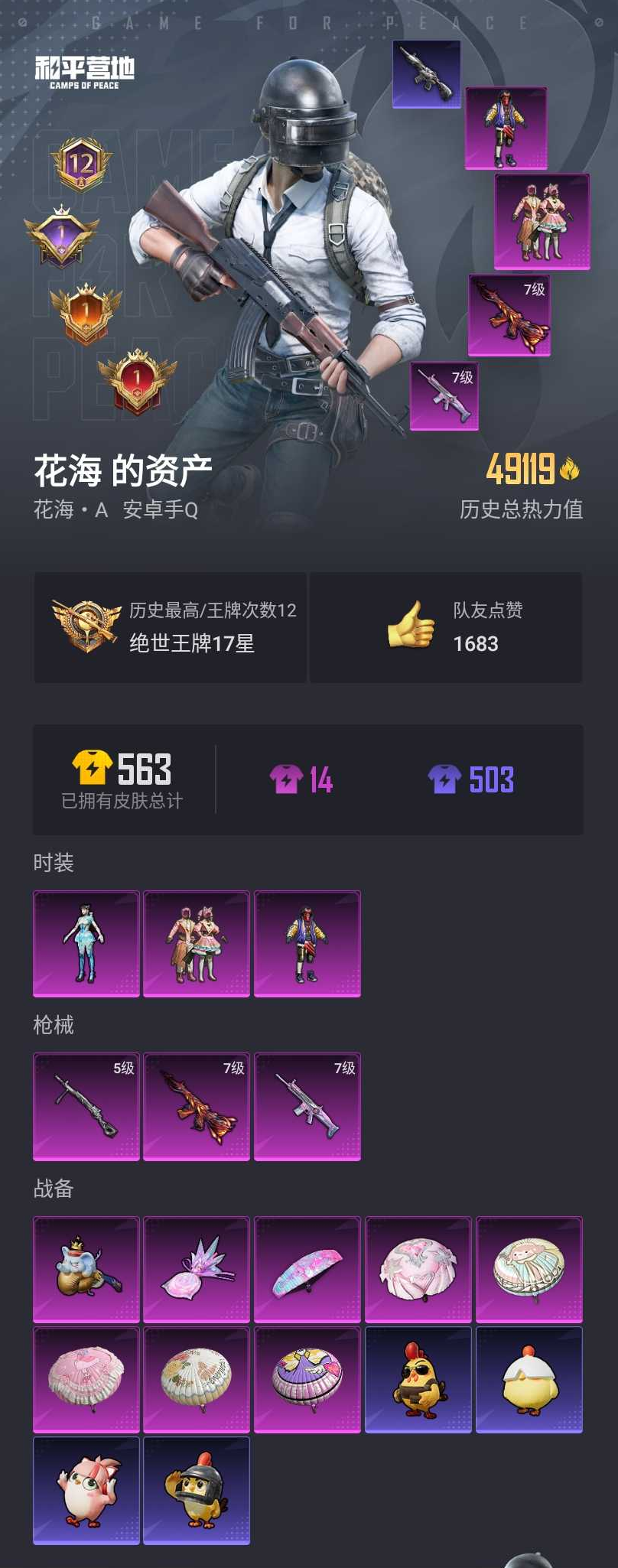【和平精英】【lyhp19321】3粉装3特效呛 草莓生巧 满级m4风花血月 满级死噶梦幻火箭 3粉装,3特效呛,0载具,历史最高段位:绝世王牌17星 王牌印记12次 热力值:49119,120套装,148呛械,178装备,94战备;套装:套装-草莓生巧,套装-天禅智恒,角色-异瞳寒姬,套装-红色运动,套装-黑色伏地魔,套装-骑行爱好者,套装-竞技名士,套装-猛禽,套装-长空猛禽,套装-竞技勇士朋克,套装-黎明保卫者,套装-蓝色守护者,套装-特战装甲,套装-青春校园,套装-甜蜜告白,套装-春日漫步,套装-龙腾端午,套装-滨海假日,套装-决胜时刻,套装-s6赛事,套装-ss1特训,套装-丛林猎人,套装-雪山精英,套装-酷潮明星,套装-传奇侦探,套装-幻世战舞者,套装-装甲骑士,套装-甜蜜熊情侣,套装-缤纷果语,套装-冰川特警,套装-格斗先锋,套装-太极红客,套装-麻辣教官,套装-粉红小猪,套装-疯狂小兔子,套装-ss5特训,套装-圣诞大吉,套装-北国孤狼,套装-ss6特训,套装-拳皇97草薙京,套装-炽焰拳师,套装-格斗专家,套装-奇迹天团,套装-淡雅花蕊,套装-玲珑飞花,套装-跃动心情,套装-ss7特训,套装-黑色刀锋,套装-核芯基因,套装-精神漫游,套装-银河圣歌,套装-霓虹街区,套装-暗夜契约,套装-纯白誓言,套装-赛博空间,套装-ss8特训,套装-白熊同盟,套装-摇滚狂鲨,套装-夏日音浪,套装-ss9特训,套装-神秘舞者,套装-丝绸行者,套装-探宝勇士,套装-牛气满满,套装-ss11特训,套装-朱雀圣者,套装-战术大师,套装-ss12特训,套装-牛气冲天,套装-ss18特训,套装-耀粉歌者,套装-ss13特训,套装-ss16特训,套装-暗夜傀儡,角色-英勇保护者,套装-ss17特训,套装-醒狮腾龙,套装-瑞龙福将,套装-团圆交子,套装-福星高照,套装-雪兔飞飞,套装-虎虎生威吉莉,套装-异彩先驱,套装-霓虹极客,套装-空投萌叽,套装-ss19特训,套装-飞驰魅影,套装-音速流光,套装-ss20特训,套装-甜心亚梦,套装-虚音幻奏,套装-ss21特训,套装-萌趣咩咩,套装-娇憨猪猪,套装-酸甜橘柚,套装-玉兔迎春,套装-ss22特训,套装-和煦暖阳,套装-田园牧歌,套装-轻风白浪,套装-光之冒险,套装-绯格组合,套装-ss23特训,套装-柠萌假日,套装-ss24特训,套装-荧惑魅影,套装-龟仙人,套装-ss25特训,套装-ss26特训,套装-空岛之星,套装-海盐绵绵冰,角色-紫俏灵猫,套装-ss31特训,套装-ss33特训,套装-ss32特训,套装-炫彩糖果,套装-ss34特训,套装-ss35特训,套装-ss36特训,套装-萌鸡速递;呛皮:7级m416-风花雪月,m416-蓝色火焰,m416-仓鼠灰灰,m416-糯团青竹,m416-乌木金纹,akm-生命誓言,akm-破晓战魂,akm-春暖花开,akm-霓虹街区,akm-彩虹符号,akm-虎虎生威,ac-val-甜心亚梦,ac-val-乌木金纹,ac-val-天降萌叽,7级scar-l-梦幻火箭,scar-l-炫彩节奏,scar-l-彩虹符号,scar-l-玉兔迎春,m762-折纸暴龙,m762-拳皇97,m762-牛气冲天,m762-瑞龙福将,m762-彩虹符号,m762-天降萌叽,蜜獾-娇憨猪猪,蜜獾-垂柳戏鸭,蜜獾-天降萌叽,g36c-金风玉露,g36c-乌木金纹,m16a4-蓝色火焰,m16a4-红色方程式,m16a4-甜心亚梦,m16a4-幻世战舞者,groza-黑色刀锋,groza-异彩先驱,groza-恐龙拽拽,groza-田园牧歌,groza-乌木金纹,aug-耀粉歌者,aug-青春冒险家,aug-天降萌叽,aug-冰晶雪宝,aug-乌木金纹,mk47-百万伏特,mk47-乌木金纹,famas-霓彩脉冲,famas-乌木金纹,q-银河战甲,q-彩虹符号,q-飞驰魅影,q-乌木金纹,awm-乌木金纹,kar98k-梦幻火箭,kar98k-飞驰魅影,kar98k-乌木金纹,m200-乌木金纹,m24-炫彩节奏,m24-乌木金纹,svd-霓彩脉冲,win94-瑞龙福将,win94-乌木金纹,莫辛纳甘-乌木金纹,amr-乌木金纹,slr-娇憨猪猪,slr-彩虹符号,mini14-银河战甲,mini14-金鼠迎春,mini14-春暖花开,mini14-梦幻火箭,mini14-炫彩节奏,mini14-海渊国主,mini14-异彩先驱,mini14-旋转彩虹,sks-夜灯,sks-炫彩节奏,sks-乌木金纹,mk14-治愈之星,mk14-乌木金纹,mk14-薄荷星砂,vss-黑色刀锋,vss-田园牧歌,mk12-乌木金纹,野牛-乌木金纹,ump45-夜灯,ump45-生命誓言,ump45-春暖花开,uzi-生命誓言,uzi-炫彩节奏,uzi-娇憨猪猪,uzi-炫彩糖果,vect-生命誓言,vect-黑色刀锋,vect-暗夜玫瑰,vect-田园牧歌,vect-乌木金纹,p90-飞驰魅影,p90-闪光银龙,p90-乌木金纹,汤姆逊-炫彩节奏,汤姆逊-异彩先驱,汤姆逊-天降萌叽,汤姆逊-乌木金纹,mp5k-异彩先驱,mp5k-乌木金纹,aks-74u-乌木金纹,s12k-华贵君王,s12k-瑞龙福将,s12k-娇憨猪猪,s12k-垂柳戏鸭,s12k-幻世战舞者,s12k-霓彩脉冲,s12k-乌木金纹,dbs-甜心亚梦,dbs-圣堂之誓,dbs-乌木金纹,s686-魔法学院,s686-彩虹符号,s686-乌木金纹,spas-12-田园牧歌,s1897-春暖花开,s1897-炫彩节奏,s1897-飞驰魅影,s1897-暗夜鎏金,mg3-瑞龙福将,mg3-幻世战舞者,mg3-乌木金纹,mg3-暗夜行者,m249-拳皇97,m249-四圣焕新,m249-糯团青竹,5级dp-28-豹影疾电,dp-28-甜心亚梦,p92-拳皇97,信号呛-异瞳寒姬,平底锅-拳皇97,平底锅-黑色刀锋,平底锅-缤纷糖果,平底锅-瑞龙福将,平底锅-异彩先驱,平底锅-飞驰魅影,平底锅-甜心亚梦,平底锅-娇憨猪猪,平底锅-田园牧歌,平底锅-空岛之星,撬棍-传奇侦探,破片手留单-呆爆全场,破片手留单-拽到爆炸,铝热弹-炫彩糖果;降落伞:炫彩糖果飞行器,极意拳锋飞行器,粉色滑翔尾迹,光之冒险尾迹,狂鲨锋刃飞行器,鸡智如我飞行器; 详情看图