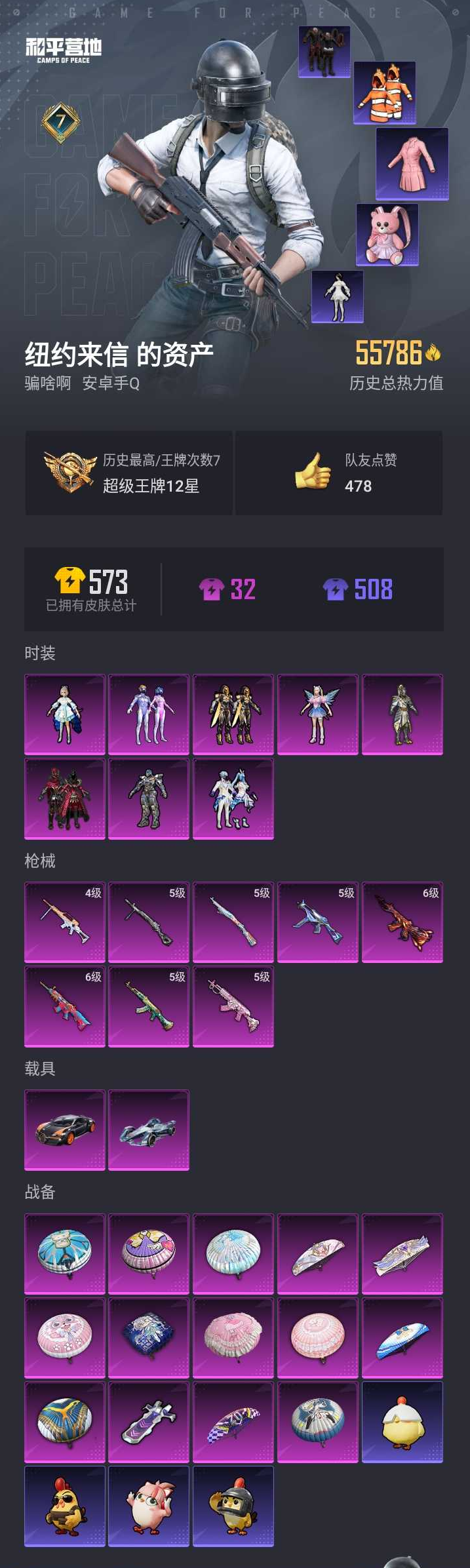 【和平精英】【lyhp19318】8粉装8特效呛2载具 洛天依 梦幻火箭 未来歌姬 老101 暗影哥特 小丑鱼 粉熊背包 6级m4风花雪月 6级死噶 5级m762甜蜜誓约 8粉装,8特效呛,2载具,历史最高段位:超级王牌12星 王牌印记7次 热力值:55786,128套装,172呛械,180装备,73战备;套装:套装-金曜白虎,套装-梦幻火箭,套装-炙焰红王,角色-洛天依,角色-幻影,套装-未来歌姬,角色-电磁星,套装-创世·救赎,套装-橘黑制服,套装-红色运动,套装-黄色运动,套装-黄色伏地魔,套装-白色伏地魔,套装-黑色伏地魔,套装-竞技名士,套装-长空猛禽,套装-海岛探路者,套装-雨林探路者,套装-六六大吉,套装-灰色格斗者,套装-甜蜜告白,套装-沙漠毒蛇,套装-人气偶像,套装-幻影武者,套装-蓝彩潮人,套装-魅力单车,套装-绮丽涂鸦,套装-耀眼新星,套装-野性战心,套装-破晓战魂,套装-荣耀,套装-火箭少女101,套装-酷潮明星,套装-极地朋克,套装-幻世战舞者,套装-暗影哥特,套装-弄潮海豚,套装-呆萌铁蟹,套装-缤纷果语,套装-风暴特警,套装-冰川特警,套装-小丑鱼,套装-粉红小猪,套装-破蛋小黄鸡,套装-疯狂小兔子,套装-霓虹街区,套装-暗夜契约,套装-纯白誓言,套装-萌黄之夏,套装-击剑大师,套装-超能拳王,套装-抹茶蜜豆,套装-牛气满满,套装-青春冒险家,套装-潮流游乐家,套装-萌趣颜团子,套装-战术大师,套装-治愈之星,套装-科技之星,套装-曼妙人鱼,套装-热情海星,套装-纯真浪花,套装-ss14特训,套装-天籁歌者,套装-电音精灵,套装-吉莉礼服,套装-ss15特训,套装-ss17特训,套装-青丘仙客,套装-甜星爱神,套装-ss20特训,套装-粉团憨憨,套装-甜心亚梦,套装-虚音幻奏,套装-ss21特训,套装-ss22特训,套装-光之冒险,套装-绯格组合,套装-ss23特训,套装-柠萌假日,套装-龟仙人,套装-涂山之恋,套装-ss25特训,套装-惊鸿侠骨,套装-锦衣飞扬,套装-晨曦薄雾,套装-深海梦境,角色-2p战斗服款,套装-龙的传人,套装-冰河战士,套装-ss26特训,套装-快闪甜心,套装-春光漫游,套装-空岛之星,套装-明鸳圣池,角色-星际旅行,套装-彩霞狙击,套装-ss27特训,套装-恋语绒绒,套装-老实芭蕉,套装-ss28特训,角色-米开朗基罗,角色-冰公主,角色-mark.06,套装-海盐绵绵冰,套装-蝶变,角色-绊爱,套装-ss29特训,套装-雏菊兔兔,套装-萝兰蝴蝶,套装-闪电轻猫,套装-ss30特训,套装-ss31特训,套装-ss33特训,套装-巳巳如意,套装-ss32特训,套装-大橘大利,角色-时希公主,玩偶服-喜羊羊,套装-元气之梦,套装-ss34特训,套装-擎苍青焰,套装-朱霞炽焰,套装-凌霄紫焰,套装-薄荷星砂,套装-ss35特训,套装-ss36特训,套装-雪国风尚;呛皮:5级akm-绿萝繁花,akm-缤纷海域,akm-夜灯,akm-涂鸦街区,akm-萌趣颜团子,akm-虎虎生威,akm-2p战斗服款,akm-龙的传人,6级m416-风花雪月,m416-红色方程式,m416-糯团青竹,famas-乌木金纹,6级scar-l-彩装战姬,scar-l-红色方程式,scar-l-黄金龙骨,scar-l-夜灯,scar-l-王牌四分卫,scar-l-玉兔迎春,scar-l-海盐豹豹,mk47-青春冒险家,mk47-洛神天依,mk47-乌木金纹,arx-凌霄紫焰,q-彩虹符号,q-洛神天依,q-纯真浪花,m16a4-红色方程式,m16a4-甜心亚梦,m16a4-幻世战舞者,m16a4-冰河战士,groza-治愈之星,groza-彩虹符号,groza-海盐豹豹,groza-荧海星豚,ac-val-甜心亚梦,ac-val-乌木金纹,ac-val-快闪甜心,aug-耀粉歌者,aug-青春冒险家,aug-天降萌叽,aug-2p战斗服款,aug-异域银装,aug-紫晶流影,5级m762-甜蜜誓约,m762-暖熊萌萌,m762-天降萌叽,m762-雏菊兔兔,蜜獾-天降萌叽,蜜獾-乌木金纹,g36c-乌木金纹,awm-王牌四分卫,awm-天降萌叽,awm-纯真浪花,awm-乌木金纹,5级kar98k-巳巳如意,kar98k-红色方程式,kar98k-彩虹符号,kar98k-洛神天依,m24-治愈之星,amr-鸡智如我,amr-乌木金纹,莫辛纳甘-乌木金纹,m200-惊鸿侠骨,m200-乌木金纹,win94-拳皇·狂花道,mk20-h-莲影清波,mk20-h-快闪甜心,mk20-h-乌木金纹,m417-惊鸿侠骨,m417-玩趣呆呆,sks-迅猛狂鲨,sks-夜灯,sks-糯团青竹,qbu-青春冒险家,mini14-穿刺龙虾,mini14-炫彩节奏,mini14-耀粉歌者,mini14-雏菊兔兔,mk14-治愈之星,mk14-乌木金纹,slr-彩虹符号,mk12-乌木金纹,vss-彩虹符号,5级ump45-量子极限,ump45-夜灯,ump45-蓝色火焰,ump45-生命誓言,汤姆逊-银刃赛罗,汤姆逊-炫彩节奏,汤姆逊-纯真浪花,aks-74u-鬼刀,aks-74u-乌木金纹,vect-生命誓言,vect-夜灯,vect-彩虹符号,vect-治愈之星,uzi-红色方程式,uzi-天降萌叽,uzi-啾咪啾咪,p90-飞驰魅影,p90-快闪甜心,p90-玩趣呆呆,p90-巳巳如意,p90-乌木金纹,mp5k-甜蜜誓约,mp5k-乌木金纹,野牛-王牌四分卫,野牛-青春冒险家,野牛-雏菊兔兔,js9-凌霄紫焰,spas-12-狂鲨锋刃,spas-12-乌木金纹,s1897-炫彩节奏,s1897-精灵梦叶罗丽,s1897-糯团青竹,s1897-乌木金纹,dbs-甜心亚梦,dbs-圣堂之誓,dbs-绊爱,dbs-乌木金纹,s686-红色方程式,s686-生命誓言,s686-巳巳如意,s12k-破晓战魂,s12k-夜灯,s12k-幻世战舞者,s12k-玩趣呆呆,s12k-守护天翼,s12k-霓彩脉冲,aa12-g-纯真浪花,mg3-幻世战舞者,mg3-乌木金纹,mg3-惊鸿侠骨,pkm-啾咪啾咪,4级mg-36-沧焰双生,mg-36-凌霄紫焰,m249-星之彼岸,m249-彩虹符号,m249-冰晶雪宝,m249-乌木金纹,5级dp-28-豹影疾电,dp-28-彩虹符号,dp-28-甜心亚梦,p92-彩装战姬,p92-凌霄紫焰,r1895-绊爱,r1895-雏菊兔兔,电击呛-喜羊羊与灰太狼,沙墨之鹦-快闪甜心,蝎式手呛-千金淑猫,平底锅-治愈之星,平底锅-青春冒险家,平底锅-甜心亚梦,平底锅-光之冒险,平底锅-惊鸿侠骨,平底锅-快闪甜心,平底锅-空岛之星,平底锅-精灵梦叶罗丽,平底锅-纯真浪花,平底锅-雏菊兔兔,平底锅-凌霄紫焰,撬棍-甜心宝贝,撬棍-幻世战舞