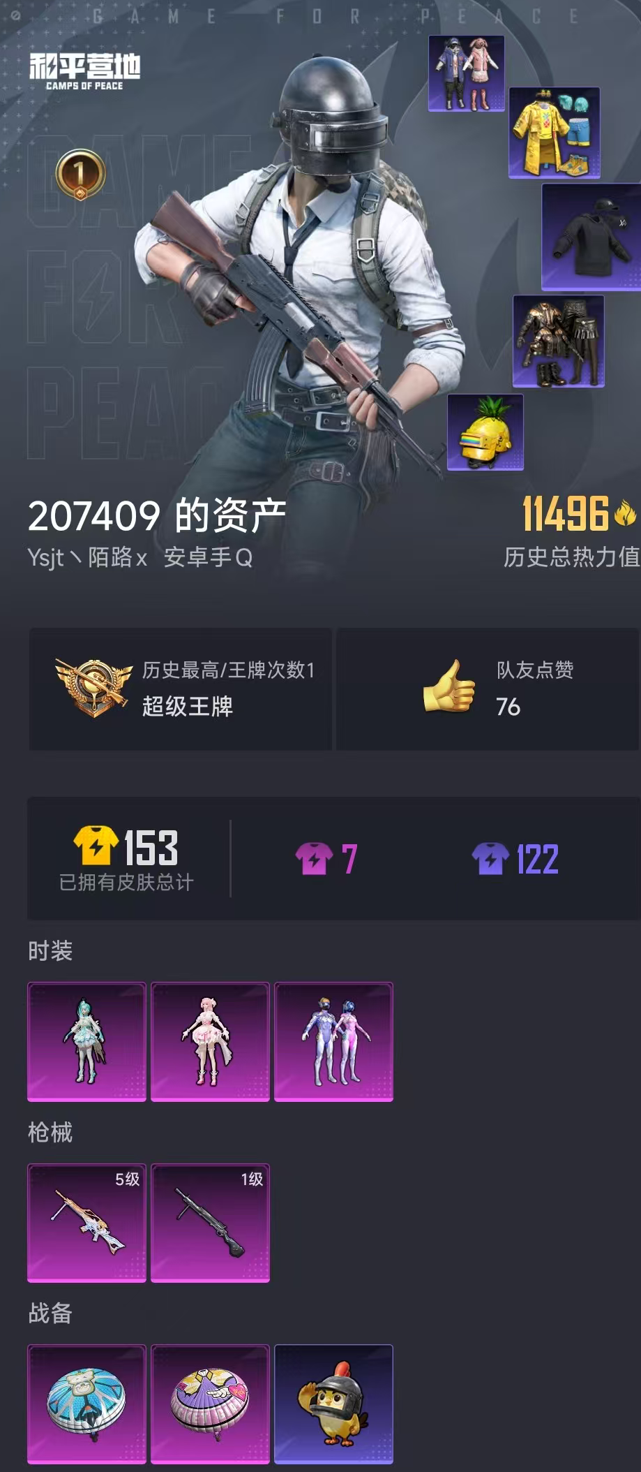【和平精英】【lyhp19344】3粉装2特效呛 梦幻火箭 艾伦沃克 3粉装,2特效呛,0载具,历史最高段位:超级王牌 王牌印记1次 热力值:11496,26套装,44呛械,40装备,24战备;套装:套装-梦幻火箭,角色-奇迹舞步 美雪,角色-奇迹舞步 雅雅,套装-蓝色运动,套装-白色伏地魔,套装-黑色伏地魔,套装-战地菁英,套装-贵族骑装,套装-酷萌兔限定,套装-ss2特训,套装-派对绅士,套装-极地朋克,套装-甜蜜菠萝,套装-半糖蓝莓,套装-alan walker,套装-疯狂小兔子,套装-圣诞大吉,套装-牛气满满,套装-ss34特训,套装-朱霞炽焰,套装-凌霄紫焰,套装-ss35特训,套装-午间小调,套装-风迹短诗,套装-雪国风尚,套装-萌鸡速递;呛皮:scar-l-红色方程式,m762-牛气冲天,m762-天降萌叽,m762-乌木金纹,akm-冰凉西瓜,akm-霓彩脉冲,mk47-风迹短诗,arx-凌霄紫焰,famas-霓彩脉冲,aug-耀粉歌者,蜜獾-风迹短诗,m416-蓝色火焰,kar98k-红色方程式,kar98k-梦幻火箭,莫辛纳甘-风迹短诗,win94-乌木金纹,awm-奇迹舞步,mk12-风迹短诗,mk12-乌木金纹,slr-霓彩脉冲,sks-乌木金纹,mini14-梦幻火箭,ump45-蓝色火焰,汤姆逊-耀粉歌者,uzi-红色方程式,js9-凌霄紫焰,aks-74u-乌木金纹,s12k-霓彩脉冲,dbs-风迹短诗,spas-12-狂鲨锋刃,mg3-幻世战舞者,5级mg-36-沧焰双生,mg-36-凌霄紫焰,1级dp-28-豹影疾电,dp-28-清新柠檬,dp-28-彩虹符号,信号呛-异瞳寒姬,信号呛-奇迹舞步,p92-凌霄紫焰,蝎式手呛-欢乐香蕉,平底锅-火吻草莓,平底锅-凌霄紫焰,撬棍-传奇侦探,破片手留单-拽到爆炸;降落伞:鸡智如我飞行器; 详情看图