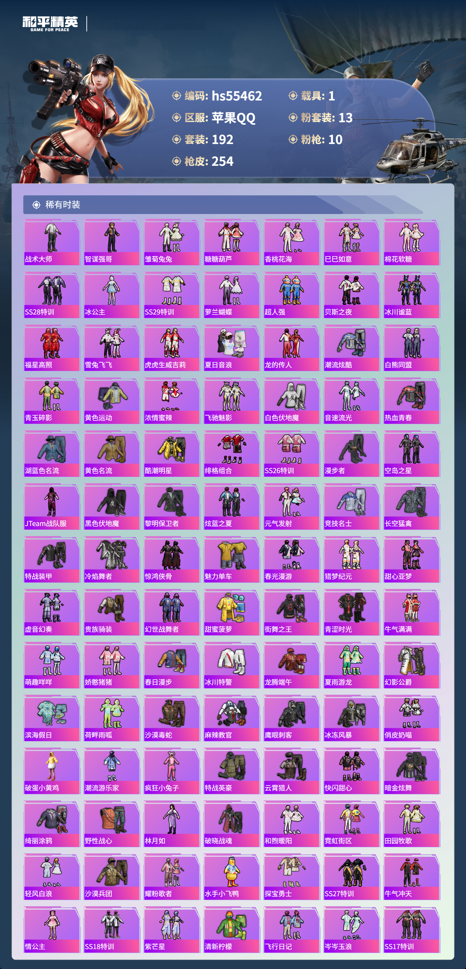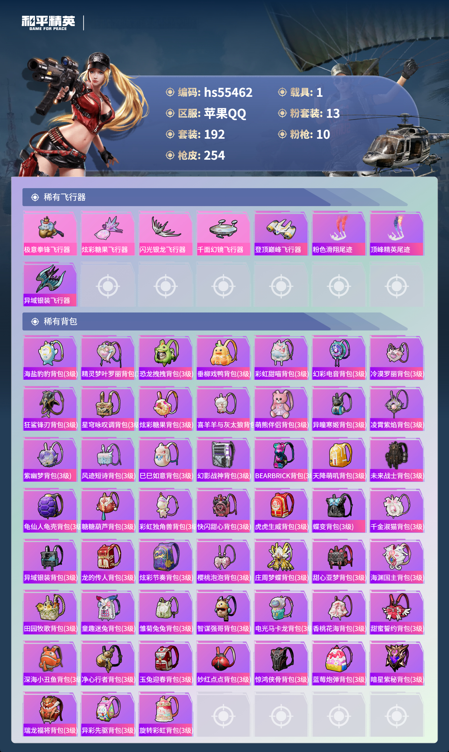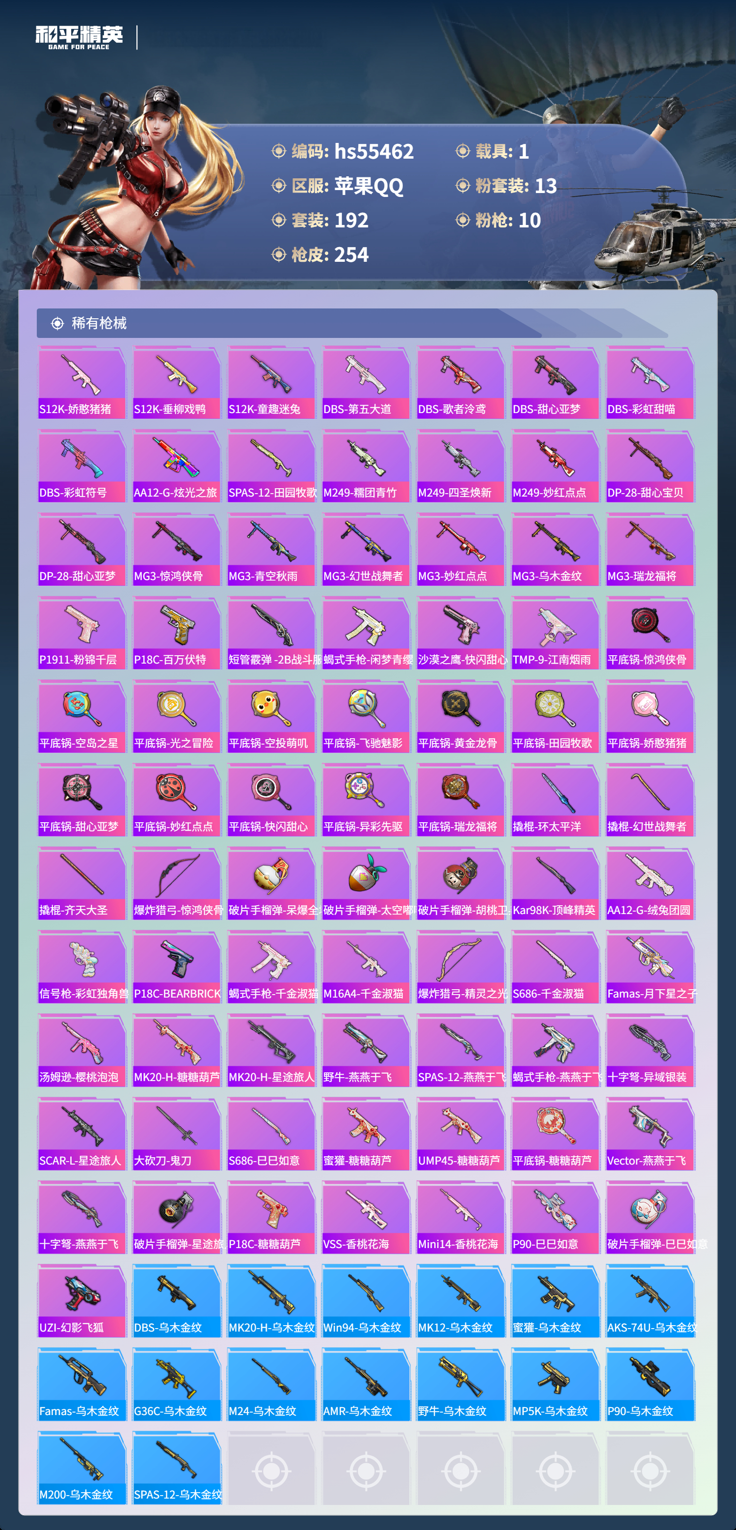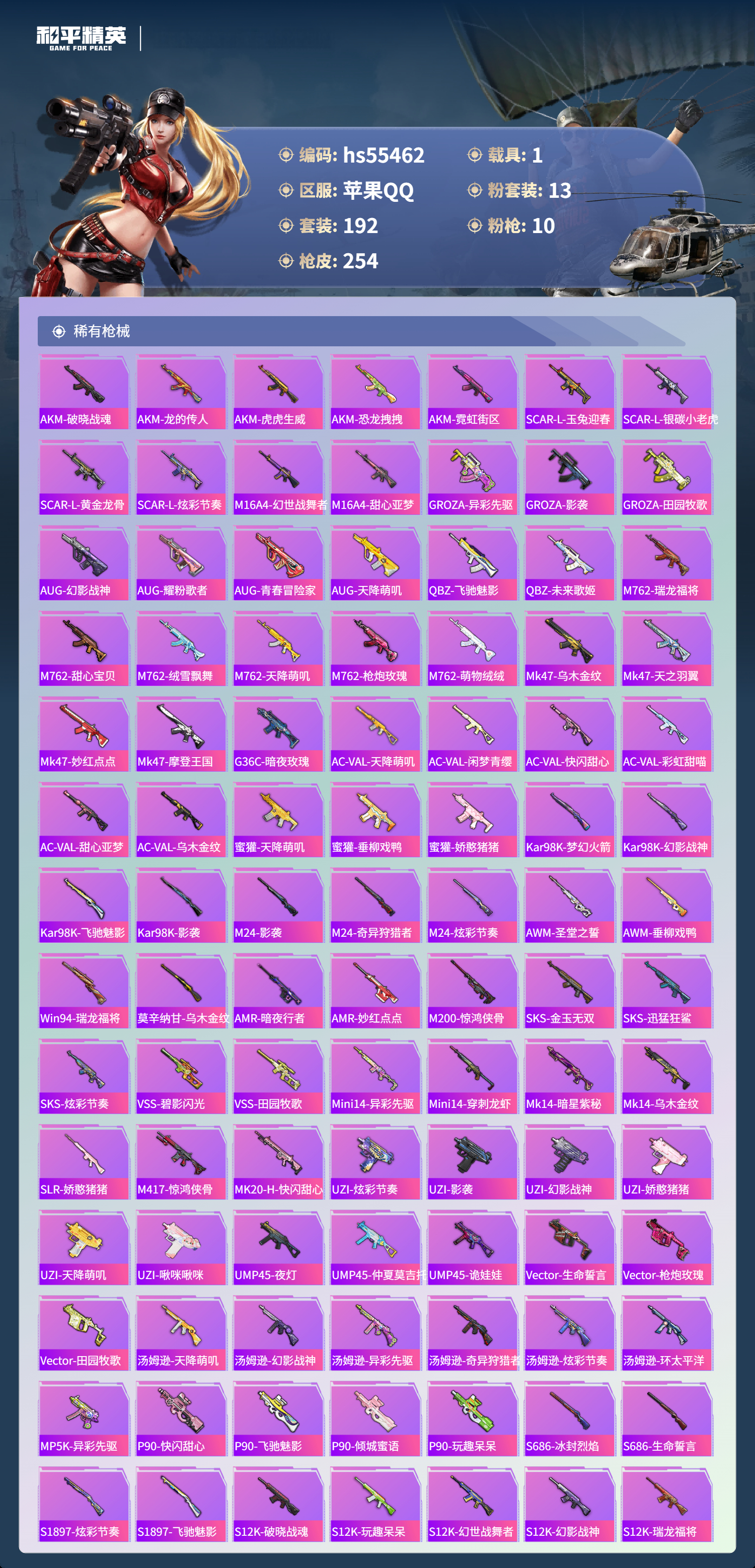 hs55462 苹果手q-17王牌印记-13粉装-10特效呛-1载具-87743热力值-192套装-254呛皮-1卓越印记-1传奇印记【13粉装】角色-守护天翼角色-千金淑猫套装-炙焰牛王套装-旋转彩虹套装-星穹咏叹调套装-甜蜜誓约套装-傲雪凌霜角色-异瞳寒姬套装-幻影战神套装-冰霜白皇套装-寒光使者角色-绯穹魔姬套装-炙焰红王【10特效呛】aks-74u-星穹咏叹调/