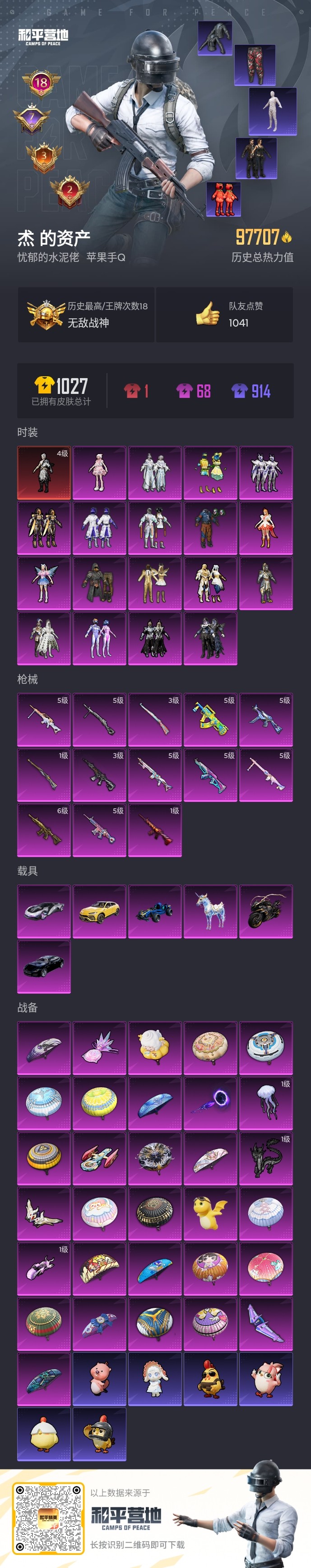 【和平精英】【txhp5693】18粉装,13特效呛,6载具,历史最高段位:无敌战神 王牌印记18次 热力值:97707,200套装,256呛械,375装备,162战备;套装:墨龙九天-敖渊,套装-极限特训,套装-怪诞乔克,套装-金曜白虎,套装-梦幻火箭,套装-金属狂野,套装-智能音符,套装-新星烈龙,套装-冰霜白皇,套装-暗翼战神,套装-香水柠檬,套装-相思残雪,套装-骨龙祭渊,套装-紫电风暴,套装-天星战神,角色-电磁星,角色-小蓝,套装-创世·救赎,角色-羊梦糖心,套装-特训学院,套装-黑色伏地魔,套装-骑行爱好者,套装-竞技名士,套装-湖蓝色名流,套装-猛禽,套装-长空猛禽,套装-漫步者,套装-海岛探路者,套装-旭日情侣,套装-赤蝎幽灵,套装-都市猎人,套装-刚毅裁决者,套装-水银刺客,套装-浪漫天命,套装-特战装甲,套装-战地督导,套装-活力之心,套装-燃烧卡路里,套装-沙漠毒蛇,套装-鹰眼刺客,套装-冰冻风暴,套装-冷酷挑战者,套装-摇滚战魂,套装-摇滚舞王,套装-街头潮人,套装-魅力单车,套装-绮丽涂鸦,套装-坚韧舞者,套装-都市漫游者,套装-森林游猎者,套装-沙漠兵团,套装-极地朋克,套装-幻世战舞者,套装-金耀舞者,套装-蓝调潮人,套装-暗影哥特,套装-迅捷狂鲨,套装-青涩时光,套装-缤纷果语,套装-alan walker,套装-龙魂突击队,套装-风暴特警,套装-冰川特警,套装-青涩年华,套装-元素星魂,套装-忍者信条,套装-格斗先锋,套装-麻辣教官,套装-沙暴袭击者,套装-小丑鱼,套装-东方飞龙,套装-冥河战士,套装-恶魔人蛛,套装-天网终结者,套装-破蛋小黄鸡,套装-疯狂小兔子,套装-核芯基因,套装-鹤鸣,套装-探宝勇士,套装-4am战队服,套装-红红火火,套装-牛气满满,套装-潮流游乐家,套装-牛气冲天,套装-飞行日记,套装-曼妙人鱼,套装-热情海星,套装-纯真浪花,套装-冰爽海盐,套装-浪漫樱花,套装-ss14特训,套装-ss15特训,套装-ss16特训,套装-暴风机械师,套装-暗夜傀儡,角色-英勇保护者,套装-ss17特训,套装-瑞龙福将,套装-团圆交子,套装-福星高照,套装-虎虎生威吉莉,角色-军刀雅典娜,套装-ss19特训,套装-ss20特训,套装-甜心亚梦,套装-虚音幻奏,套装-ss21特训,套装-萌趣咩咩,套装-娇憨猪猪,套装-红熊茄茄,套装-俏皮奶喵,套装-酸甜橘柚,套装-玉兔迎春,套装-ss22特训,套装-田园牧歌,套装-轻风白浪,套装-绚烂繁星,套装-光之冒险,套装-绯格组合,套装-ss23特训,套装-甜梦熊熊,套装-神气柴柴,套装-懵萌河马,套装-妙红点点,套装-幻彩翩翩,套装-王牌教练,套装-柠萌假日,套装-青玉碎影,套装-ss24特训,套装-龟仙人,套装-涂山之恋,套装-ss25特训,套装-惊鸿侠骨,套装-锦衣飞扬,套装-香桃花海,套装-果汁能量,套装-龙的传人,套装-冰河战士,套装-ss26特训,套装-快闪甜心,套装-春光漫游,套装-漫游都市,套装-空岛之星,套装-云魄琉璃,玩偶服-菲菲,套装-焰鹰斗篷,套装-幽夜迷踪,套装-幻羽潜行,套装-ss27特训,套装-恋语绒绒,套装-老实芭蕉,套装-ss28特训,玩偶服-卖崽青蛙,角色-多纳泰罗,角色-极地流光,角色-粉雾星云,角色-白光莹,角色-情公主,角色-银尘,角色-mark.06,套装-海盐绵绵冰,套装-蝶变,套装-创世·幻影,套装-创世·追猎,套装-小熊娃娃,套装-ss29特训,套装-雏菊兔兔,套装-萝兰蝴蝶,套装-先驱飞行员,套装-异域银装,套装-星途旅人,套装-ss30特训,套装-青团波波,套装-糖糖葫芦,套装-ss31特训,套装-鱼渊荷华,套装-燕燕于飞,套装-紫幽梦,套装-粉恋花,套装-ss33特训,套装-ss32特训,套装-樱梦幻音,套装-蓝冰羽,套装-大橘大利,角色-灵公主,玩偶服-喜羊羊,套装-元气之梦,套装-ss34特训,套装-擎苍青焰,套装-朱霞炽焰,套装-游乐,套装-凌霄紫焰,套装-薄荷星砂,套装-ss35特训,套装-琴音绮想,套装-粉黛兰香,套装-画境星梦,套装-ss36特训,套装-雪国风尚,套装-萌鸡速递;呛皮:蜜獾-娇憨猪猪,蜜獾-垂柳戏鸭,蜜獾-天降萌叽,蜜獾-精灵梦叶罗丽,蜜獾-糖糖葫芦,蜜獾-乌木金纹,m762-奇异狩猎者,m762-瑞龙福将,m762-彩虹符号,m762-天降萌叽,m762-雏菊兔兔,5级akm-梦之光华,akm-奇异狩猎者,akm-涂鸦街区,akm-虎虎生威,akm-环太平洋,akm-龙的传人,akm-江南烟雨,akm-霓彩脉冲,5级groza-香水柠檬,groza-影袭,groza-梨园星光,groza-彩虹符号,groza-田园牧歌,groza-懵萌河马,groza-海盐豹豹,aug-幻影战神,aug-终结者,aug-耀粉歌者,aug-青春冒险家,aug-异域银装,q-彩虹符号,q-洛神天依,q-纯真浪花,5级scar-l-童趣迷兔,scar-l-红色方程式,scar-l-炫彩节奏,scar-l-彩虹符号,scar-l-玉兔迎春,scar-l-星途旅人,scar-l-海盐豹豹,6级m416-五爪金龙,1级m416-风花雪月,3级m416-墨龙九天,m416-糯团青竹,arx-凌霄紫焰,g36c-时空追击者,g36c-暗夜玫瑰,g36c-懵萌河马,g36c-乌木金纹,ace32-画境星梦,ac-val-甜心亚梦,ac-val-乌木金纹,ac-val-彩虹甜喵,ac-val-天降萌叽,ac-val-快闪甜心,famas-墨龙九天,famas-霓彩脉冲,famas-乌木金纹,m16a4-冥河战士,m16a4-甜心亚梦,m16a4-幻世战舞者,m16a4-冰河战士,mk47-乌木金纹,mk47-妙红点点,mk47-炫光之旅,m200-绿野极光,m200-惊鸿侠骨,m200-宇宙意志,m200-乌木金纹,win94-瑞龙福将,win94-萝萝小趴兔,win94-拳皇·狂花道,win94-乌木金纹,1级kar98k-创世·救赎,3级kar98k-巳巳如意,kar98k-王子的夏天,kar98k-金玉无双,kar98k-乌木金纹,莫辛纳甘-乌木金纹,莫辛纳甘-懵萌河马,amr-妙红点点,amr-墨龙九天,amr-喜羊羊与灰太狼,amr-乌木金纹,awm-天降萌叽,awm-焰鹰斗篷,awm-纯真浪花,m24-影袭,m24-香水柠檬,slr-娇憨猪猪,slr-彩虹符号,slr-墨龙九天,slr-金丰海韵,slr-霓彩脉冲,mini14-金玉无双,mini14-耀粉歌者,min