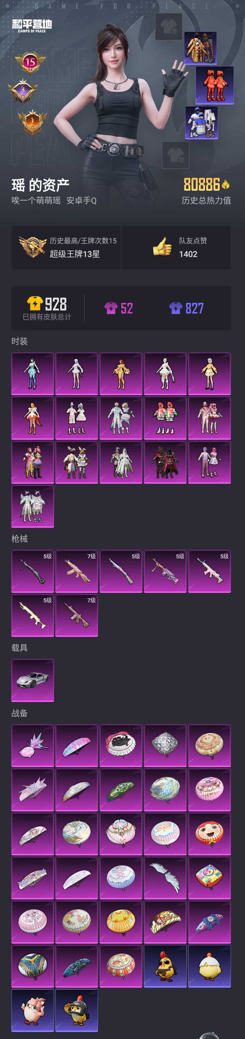 【和平精英】【lyhp19385】16粉装7特效呛1载具 缤纷油彩 馨动时刻 千金淑猫 呆萌星弥 童趣迷兔 红熊番茄 青涩年华 满级m4心之恋语 满级aks 16粉装,7特效呛,1载具,历史最高段位:超级王牌13星 王牌印记15次 热力值:80886,198套装,227呛械,313装备,157战备;套装:套装-天使彩虹糖,套装-缤纷油彩,套装-馨动时刻,套装-冰霜白皇,套装-童趣迷兔,套装-炙焰红王,套装-彩虹鹿灵,套装-山涧鹿灵,角色-呆萌星弥,套装-炫光之旅,套装-蜜语绒猫,角色-小蓝,角色-异瞳寒姬,角色-千金淑猫,角色-羲和光序,角色-荧海星豚,套装-特训学院,套装-猎鹰,套装-青年教官,套装-橘黑制服,套装-红色运动,套装-黄色运动,套装-蓝色运动,套装-黄色伏地魔,套装-白色伏地魔,套装-黑色伏地魔,套装-骑行爱好者,套装-竞技名士,套装-深蓝色名流,套装-酒红色名流,套装-湖蓝色名流,套装-黄色名流,套装-猛禽,套装-野性山猫,套装-长空猛禽,套装-黎明保卫者,套装-蓝色守护者,套装-海岛探路者,套装-旭日情侣,套装-冷焰舞者,套装-浪漫天命,套装-特战装甲,套装-缤纷假日,套装-浪漫假日,套装-青春校园,套装-燃烧卡路里,套装-完美偶像,套装-人气偶像,套装-幻影武者,套装-蓝彩潮人,套装-千禧之恋,套装-怒火燎原,套装-魅力单车,套装-绮丽涂鸦,套装-耀眼新星,套装-雪山征服者,套装-竞技达人朋克,套装-野性战心,套装-破晓战魂,套装-幻世战舞者,套装-甜蜜菠萝,套装-呆萌铁蟹,套装-青涩时光,套装-缤纷果语,套装-龙魂突击队,套装-冰川特警,套装-青涩年华,套装-元素星魂,套装-极速红龙,套装-粉红小猪,套装-破蛋小黄鸡,套装-疯狂小兔子,套装-淡雅花蕊,套装-玲珑飞花,套装-精神漫游,套装-鹤鸣,套装-霓虹街区,套装-神秘黑猫,套装-白熊同盟,套装-萌黄之夏,套装-夏日音浪,套装-探宝勇士,套装-战术大师,套装-ss18特训,套装-耀粉歌者,套装-飞行日记,套装-ss13特训,套装-曼妙人鱼,套装-热情海星,套装-纯真浪花,套装-ss14特训,套装-吉莉礼服,角色-英勇保护者,套装-ss17特训,套装-福星高照,角色-军刀雅典娜,套装-异彩先驱,套装-霓虹极客,套装-空投萌叽,套装-ss19特训,套装-飞驰魅影,套装-音速流光,套装-炫蓝之夏,套装-ss20特训,套装-粉团憨憨,套装-软羊咩咩,套装-猎梦纪元,套装-甜心亚梦,套装-虚音幻奏,套装-ss21特训,套装-萌趣咩咩,套装-娇憨猪猪,套装-红熊茄茄,套装-梦幻奶油,套装-ss22特训,套装-田园牧歌,套装-轻风白浪,套装-熠彩粉晶,套装-光之冒险,套装-绯格组合,套装-ss23特训,套装-灵蜜圈圈,套装-妙红点点,套装-幻彩翩翩,套装-王牌教练,套装-柠萌假日,套装-ss24特训,套装-龟仙人,套装-ss25特训,套装-惊鸿侠骨,套装-锦衣飞扬,套装-龙的传人,套装-冰河战士,套装-ss26特训,套装-快闪甜心,套装-春光漫游,套装-空岛之星,套装-明鸳圣池,角色-星际旅行,角色-舰行太空,套装-云魄琉璃,套装-贝斯之夜,套装-焰鹰斗篷,套装-幽夜迷踪,套装-幻羽潜行,套装-ss27特训,套装-恋语绒绒,套装-老实芭蕉,套装-ss28特训,角色-湖雨初晴,角色-拉斐尔,套装-街头风暴,套装-海盐绵绵冰,套装-蝶变,套装-粉日山川,套装-小熊娃娃,套装-ss29特训,套装-雏菊兔兔,套装-萝兰蝴蝶,套装-异域银装,套装-ss30特训,角色-光矢逐梦,角色-夜瞳黯灵,套装-ss31特训,套装-鱼渊荷华,套装-燕燕于飞,套装-晶灵使者,套装-紫幽梦,套装-粉恋花,套装-ss33特训,角色-猎影月神,套装-云朵鹅,套装-巳巳如意,套装-ss32特训,套装-彩虹兔,套装-蓝冰羽,套装-顶瓜瓜,套装-雪绒豹,套装-狂鲨锋刃,套装-大橘大利,套装-圣穹绘梦,角色-时希公主,套装-星渊小夜曲,套装-炫彩糖果,玩偶服-懒羊羊,玩偶服-喜羊羊,套装-元气之梦,套装-ss34特训,套装-擎苍青焰,套装-朱霞炽焰,套装-凌霄紫焰,套装-ss35特训,套装-午间小调,套装-秘语星愿,套装-风迹短诗,套装-ss36特训,套装-雪国风尚,套装-萌鸡速递;呛皮:m16a4-蓝色火焰,m16a4-甜心亚梦,m16a4-幻世战舞者,m16a4-冰河战士,m16a4-天使羽翼,akm-冰凉西瓜,akm-春暖花开,akm-涂鸦街区,akm-彩虹符号,akm-龙的传人,akm-霓彩脉冲,mk47-林间仙鹿,mk47-乌木金纹,mk47-妙红点点,mk47-幻海仙踪,mk47-风迹短诗,ac-val-甜心亚梦,ac-val-乌木金纹,ac-val-快闪甜心,famas-霓彩脉冲,famas-乌木金纹,5级scar-l-锦绣绵绵,scar-l-红色方程式,scar-l-绊爱,scar-l-海盐豹豹,q-神秘黑猫,q-飞驰魅影,q-纯真浪花,aug-甜蜜菠萝,aug-耀粉歌者,aug-天降萌叽,aug-兔兔小魔女,aug-异域银装,7级m416-心之恋语,m416-蓝色火焰,m416-糯团青竹,蜜獾-娇憨猪猪,蜜獾-天降萌叽,蜜獾-绯穹魔姬,蜜獾-风迹短诗,蜜獾-乌木金纹,arx-凌霄紫焰,groza-春暖花开,groza-异彩先驱,groza-田园牧歌,groza-守护天翼,groza-海盐豹豹,g36c-桃粉嫣然,g36c-星穹咏叹调,g36c-乌木金纹,m762-暖熊萌萌,m762-天降萌叽,m762-雏菊兔兔,m762-云朵鹅,m762-登顶巅峰,svd-云朵鹅,win94-乌木金纹,awm-垂柳戏鸭,awm-音爆索尼克,awm-焰鹰斗篷,awm-纯真浪花,awm-乌木金纹,5级kar98k-巳巳如意,kar98k-彩虹符号,kar98k-炫彩节奏,kar98k-飞驰魅影,莫辛纳甘-乌木金纹,莫辛纳甘-蜜语绒猫,莫辛纳甘-风迹短诗,amr-妙红点点,amr-喜羊羊与灰太狼,amr-乌木金纹,m24-炫彩节奏,m24-乌木金纹,m200-惊鸿侠骨,m200-乌木金纹,5级mk14-闲梦青缨,mk14-童趣迷兔,mk14-乌木金纹,mk14-冰河战士,mk14-紫幽梦,mk12-风迹短诗,mk12-乌木金纹,mini14-春暖花开,mini14-林间仙鹿,mini14-异彩先驱,mini14-香桃花海,mini14-雏菊兔兔,mini14-绯穹魔姬,sks-炫彩节奏,mk20-h-快闪甜心,mk20-h-狂鲨锋刃,mk20-