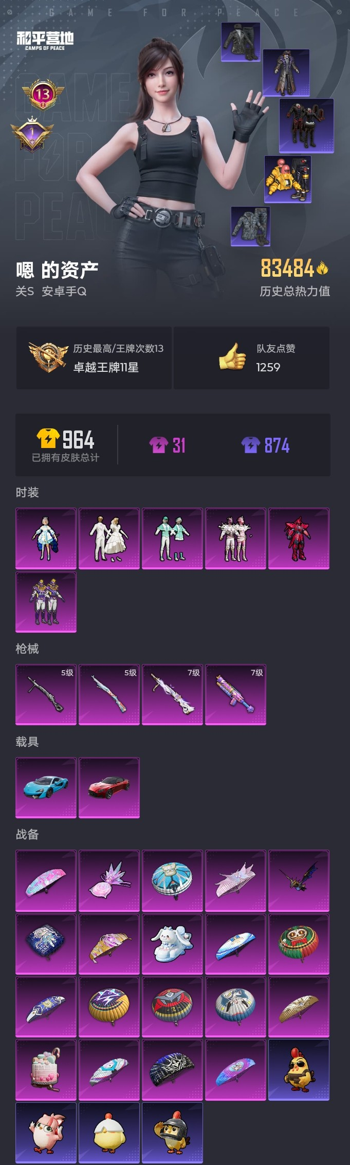 【和平精英】【lyhp19382】6粉装4特效呛2载具 洛天依 哥特 7级大盘鸡圣堂 7级野牛流星咚咚 6粉装,4特效呛,2载具,历史最高段位:卓越王牌11星 王牌印记13次 热力值:83484,207套装,260呛械,313装备,155战备;套装:套装-王牌四分卫,角色-洛天依,套装-炙焰赤龙,套装-海渊国主,套装-薄荷物语,套装-纯珍童话,套装-特训学院,套装-猎鹰,套装-青年教官,套装-橘黑制服,套装-红色运动,套装-黄色运动,套装-蓝色运动,套装-黄色伏地魔,套装-白色伏地魔,套装-黑色伏地魔,套装-骑行爱好者,套装-竞技名士,套装-深蓝色名流,套装-酒红色名流,套装-湖蓝色名流,套装-黄色名流,套装-猛禽,套装-长空猛禽,套装-竞技勇士朋克,套装-黎明保卫者,套装-灰色守护者,套装-海岛探路者,套装-雨林探路者,套装-旭日情侣,套装-冷焰舞者,套装-灼焰舞者,套装-刚毅裁决者,套装-特战装甲,套装-战地菁英,套装-战地督导,套装-黄色格斗者,套装-灰色格斗者,套装-甜蜜告白,套装-迎春赐吉,套装-燃烧卡路里,套装-滨海假日,套装-沙漠毒蛇,套装-完美偶像,套装-人气偶像,套装-幻影武者,套装-特战英豪,套装-街头潮人,套装-蓝彩潮人,套装-怒火燎原,套装-魅力单车,套装-绮丽涂鸦,套装-耀眼新星,套装-坚韧舞者,套装-竞技达人朋克,套装-破晓战魂,套装-都市魅力,套装-荣耀,套装-风行保卫者,套装-热血青春,套装-沙漠兵团,套装-丛林猎人,套装-雪山精英,套装-极地朋克,套装-幻世战舞者,套装-金耀舞者,套装-蓝调潮人,套装-暗影哥特,套装-甜蜜熊情侣,套装-青涩时光,套装-缤纷果语,套装-滨海厨神,套装-龙魂突击队,套装-冰川特警,套装-元素星魂,套装-极速红龙,套装-格斗先锋,套装-冷血极客,套装-海上生明月,套装-麻辣教官,套装-梦魇先生,套装-黑夜传说,套装-粉红小猪,套装-破蛋小黄鸡,套装-疯狂小兔子,套装-深蓝冒险家,套装-迷域探索者,套装-机械英豪,套装-机械征服者,套装-ss5特训,套装-红酒骑士,套装-北国孤狼,套装-ss6特训,套装-格斗专家,套装-淡雅花蕊,套装-ss7特训,套装-鹤鸣,套装-霓虹街区,套装-暴走罗小黑,套装-ss10特训,套装-ss8特训,套装-智慧之神,套装-萌黄之夏,套装-超能拳王,套装-人鱼之吻,套装-摇滚狂鲨,套装-夏日音浪,套装-ss9特训,套装-丝绸行者,套装-顽皮玉兔,套装-探宝勇士,套装-辉星之火,套装-牛气满满,套装-玫瑰恋情,套装-童话森林,套装-白糯汤圆,套装-ss11特训,套装-青春冒险家,套装-潮流游乐家,套装-玄武圣者,套装-白虎圣者,套装-原初圣火,套装-逆风勇士,套装-特种颜团子,套装-战术大师,套装-ss12特训,套装-牛气冲天,套装-ss18特训,套装-镭射皇者,套装-银白舞王,套装-耀粉歌者,套装-科技之星,套装-飞行日记,套装-ss13特训,套装-ss14特训,角色-欧布奥特曼,角色-捷德奥特曼,套装-吉莉礼服,套装-ss15特训,套装-ss16特训,套装-暴风机械师,套装-时空追击者,套装-暗夜傀儡,套装-ss17特训,套装-瑞龙福将,套装-团圆交子,套装-福星高照,套装-虎虎生威吉莉,套装-异彩先驱,套装-霓虹极客,套装-空投萌叽,套装-ss19特训,套装-炫蓝之夏,套装-ss20特训,套装-ss21特训,套装-萌趣咩咩,套装-娇憨猪猪,套装-玉兔迎春,套装-ss22特训,套装-和煦暖阳,套装-田园牧歌,套装-轻风白浪,套装-光之冒险,套装-绯格组合,套装-ss23特训,套装-莱茵河畔,套装-甜梦熊熊,套装-神气柴柴,套装-懵萌河马,套装-灵蜜圈圈,套装-妙红点点,套装-幻彩翩翩,套装-王牌教练,套装-柠萌假日,套装-ss24特训,套装-龟仙人,套装-涂山之恋,套装-ss25特训,套装-龙的传人,套装-ss26特训,套装-快闪甜心,套装-春光漫游,套装-空岛之星,套装-明鸳圣池,套装-云魄琉璃,套装-焰鹰斗篷,套装-幽夜迷踪,套装-幻羽潜行,套装-ss27特训,套装-老实芭蕉,套装-ss28特训,套装-海盐绵绵冰,套装-异域银装,套装-ss30特训,套装-ss31特训,角色-瑰梦爱神,套装-ss33特训,套装-ss32特训,套装-炫彩糖果,套装-元气之梦,套装-ss34特训,套装-薄荷星砂,套装-ss35特训,套装-粉黛兰香,套装-ss36特训,套装-雪国风尚,套装-萌鸡速递;呛皮:m762-奇异狩猎者,m762-牛气冲天,m762-镭射皇者,m762-瑞龙福将,m762-风花雪月,m762-天降萌叽,m762-乌木金纹,g36c-金风玉露,g36c-时空追击者,g36c-暗夜玫瑰,g36c-懵萌河马,g36c-乌木金纹,akm-灼热熔岩,akm-玉龙,akm-缤纷海域,akm-破晓战魂,akm-夜灯,akm-四圣焕新,akm-星之彼岸,akm-彩虹符号,akm-虎虎生威,akm-王牌投手,akm-霓彩脉冲,akm-乌木金纹,scar-l-生命誓言,scar-l-红色方程式,scar-l-玫瑰恋情,scar-l-炫彩节奏,scar-l-玉兔迎春,scar-l-海盐豹豹,groza-生命誓言,groza-治愈之星,groza-彩虹符号,groza-异彩先驱,groza-田园牧歌,groza-懵萌河马,groza-海盐豹豹,groza-乌木金纹,m416-夜灯,m416-蓝色火焰,m416-红色方程式,m416-神秘黑猫,m416-潮汐统领,m416-糯团青竹,m416-乌木金纹,q-神秘黑猫,q-原初圣火,q-彩虹符号,q-洛神天依,q-乌木金纹,蜜獾-娇憨猪猪,蜜獾-天降萌叽,蜜獾-乌木金纹,famas-霓彩脉冲,famas-乌木金纹,m16a4-蓝色火焰,m16a4-红色方程式,m16a4-机械英豪,m16a4-幻世战舞者,m16a4-乌木金纹,ac-val-乌木金纹,ac-val-天降萌叽,ac-val-快闪甜心,mk47-青春冒险家,mk47-乌木金纹,mk47-妙红点点,aug-耀粉歌者,aug-青春冒险家,aug-天降萌叽,aug-异域银装,aug-冰晶雪宝,aug-紫晶流影,aug-乌木金纹,m24-治愈之星,m24-乌木金纹,5级kar98k-巳巳如意,kar98k-红色方程式,kar98k-王子的夏天,kar98k-勇闯险境,kar98k-彩虹符号,kar98k-洛神天依,kar98k-顶峰精英,kar98k-乌木金纹,m200-乌木金纹,amr-妙红点点,