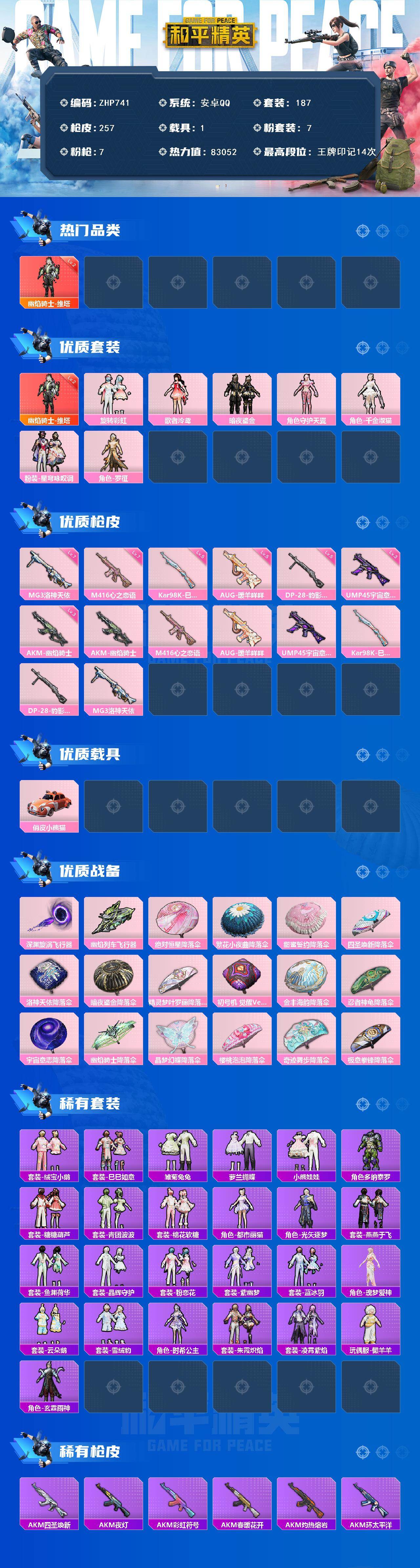 [15340560]安卓 手q-1神装-7粉装-7特效呛-1载具-4粉色飞行器-83052热力值-14王牌印记-187套装-257呛皮 【红色神装等级】:幽焰骑士-维塔二级 【红色角色神装】:幽焰骑士-维塔 【热门品类】:套装-龟仙人,角色-mark.06 【粉色套装】:粉装-旋转彩虹,角色-歌者泠鸢,粉装-暗夜鎏金,角色-守护天翼,角色-千金淑猫,粉装-星穹咏叹调,角色-罗征 【粉色呛皮等级】:akm-幽焰骑士三级,m416-心之恋语七级,aug-暖羊咩咩五级,ump45-宇宙意志三级,kar98k-巳巳如意五级,dp-28-豹影疾电五级,mg3-洛神天依七级 【粉色载具】:俏皮小熊猫 【粉色呛皮】:akm-幽焰骑士,m416-心之恋语,aug-暖羊咩咩,ump45-宇宙意志,kar98k-巳巳如意,dp-28-豹影疾电,mg3-洛神天依 【粉色飞行器】:深渊漩涡飞行器,幽焰列车飞行器 【粉色降落伞】:绝对恒星降落伞,繁花小夜曲降落伞,甜蜜誓约降落伞,四圣焕新降落伞,洛神天依降落伞,暗夜鎏金降落伞,精灵梦叶罗丽降落伞,初号机 觉醒ver.降落伞,金丰海韵降落伞,忍者神龟降落伞,宇宙意志降落伞,幽焰骑士降落伞,晶梦幻蝶降落伞,樱桃泡泡降落伞,奇迹舞步降落伞,极意拳锋降落伞,炫彩糖果降落伞 【稀有套装】:套装-龟仙人,套装-绒宝小鹅,套装-巳巳如意,套装-雪国风尚,套装-雏菊兔兔,套装-萝兰蝴蝶,套装-小熊娃娃,角色-多纳泰罗,套装-糖糖葫芦,套装-青团波波,套装-棉花软糖,角色-都市丽猫,角色-光矢逐梦,套装-燕燕于飞,套装-鱼渊荷华,套装-晶辉守护,套装-粉恋花,套装-紫幽梦,套装-蓝冰羽,角色-瑰梦爱神,套装-云朵鹅,套装-雪绒豹,角色-时希公主,套装-朱霞炽焰,套装-凌霄紫焰,玩偶服-懒羊羊,角色-玄霖雨神,套装-炫彩糖果 【稀有呛皮】:aug-冰晶雪宝,akm-四圣焕新,akm-夜灯,akm-彩虹符号,akm-春暖花开,akm-灼热熔岩,akm-环太平洋,akm-破晓战魂,akm-霓虹街区,akm-龙的传人,m16a4-幻世战舞者,m16a4-机械英豪,scar-l-玉兔迎春,scar-l-甜蜜誓约,scar-l-繁花小夜曲,scar-l-红色方程式,scar-l-银碳小老虎,m416-糯团青竹,m416-红色方程式,m416-蓝色火焰,gro