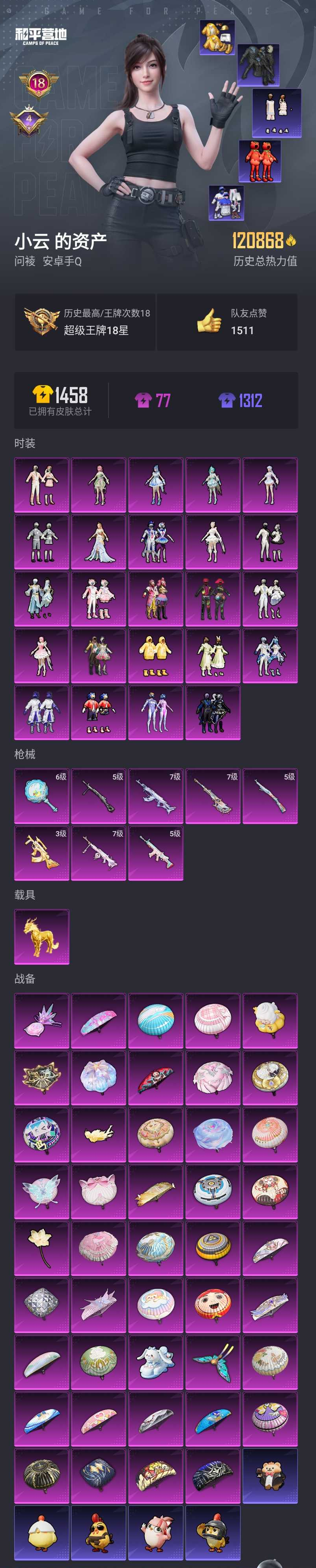 【和平精英】【lyhp19543】高印记 24粉装8特效呛1载具 甜梦小狐 梦幻火箭 缤纷油彩 放客神游 第五大道 千金淑猫 花灵 奇迹舞步 荧海星豚 红熊番茄 软软马卡龙 派对舞王 都市猎人 浪漫天命 满级akm幻海仙踪 满级amr 满级pkm 3级狗杂精灵之光 金麒麟 24粉装,8特效呛,1载具,历史最高段位:超级王牌18星 王牌印记18次 热力值:120924,270套装,358呛械,526装备,263战备;套装:套装-梦幻火箭,套装-蝶舞迷情,套装-缤纷油彩,套装-放客神游,套装-新星烈龙,套装-星空之魅,套装-暗夜玫瑰,套装-岚岚物语,套装-寒光使者,套装-甜梦小狐,套装-冰川幽秘,套装-音爆索尼克,套装-第五大道,套装-闲梦青缨,套装-未来歌姬,套装-傲傲奶龙,角色-美雪,套装-金丰海韵,角色-千金淑猫,角色-智耀战神,角色-荧海星豚,角色-花灵,角色-奇迹舞步 美琪,角色-奇迹舞步 雅雅,套装-特训学院,套装-猎鹰,套装-青年教官,套装-橘黑制服,套装-红色运动,套装-黄色运动,套装-蓝色运动,套装-白色伏地魔,套装-竞技名士,套装-湖蓝色名流,套装-猛禽,套装-长空猛禽,套装-漫步者,套装-竞技勇士朋克,套装-旭日情侣,套装-冷焰舞者,套装-灼焰舞者,套装-都市猎人,套装-浪漫天命,套装-特战装甲,套装-战地菁英,套装-特殊使命,套装-青春校园,套装-甜蜜告白,套装-春日漫步,套装-滨海假日,套装-鹰眼刺客,套装-冰冻风暴,套装-完美偶像,套装-蓝彩潮人,套装-千禧之恋,套装-魅力单车,套装-绮丽涂鸦,套装-坚韧舞者,套装-竞技达人朋克,套装-野性战心,套装-狂沙舞者,套装-森林游猎者,套装-荣耀,套装-沙漠兵团,套装-派对舞王,套装-丛林猎人,套装-雪山精英,套装-酷潮明星,套装-传奇侦探,套装-幻世战舞者,套装-甜蜜菠萝,套装-青涩时光,套装-缤纷果语,套装-龙魂突击队,套装-冰川特警,套装-元素星魂,套装-格斗先锋,套装-海上生明月,套装-麻辣教官,套装-小丑鱼,套装-破蛋小黄鸡,套装-疯狂小兔子,套装-ss5特训,套装-圣诞大吉,套装-浪漫波比,套装-金鼠迎春,套装-北国孤狼,套装-ss6特训,套装-淡雅花蕊,套装-玲珑飞花,套装-跃动心情,套装-ss7特训,套装-黑色刀锋,套装-核芯基因,套装-精神漫游,套装-鹤鸣,套装-霓虹街区,套装-激萌罗小黑,套装-ss10特训,套装-ss8特训,套装-萌黄之夏,套装-击剑大师,套装-夏日音浪,套装-ss9特训,套装-风华少年志,套装-薄荷蓝莓,套装-探宝勇士,套装-牛气满满,套装-白糯汤圆,套装-ss11特训,套装-朱雀圣者,套装-萌趣颜团子,套装-特种颜团子,套装-战术大师,套装-ss12特训,套装-牛气冲天,套装-ss18特训,套装-镭射皇者,套装-银白舞王,套装-耀粉歌者,套装-治愈之星,套装-科技之星,套装-萌主吾皇,套装-飞行日记,套装-ss13特训,套装-曼妙人鱼,套装-热情海星,套装-纯真浪花,套装-ss14特训,套装-吉莉礼服,套装-ss15特训,套装-ss17特训,套装-智慧隐士,套装-瑞龙福将,套装-团圆交子,套装-爆裂葡萄,套装-福星高照,套装-虎虎生威吉莉,套装-异彩先驱,套装-霓虹极客,套装-空投萌叽,套装-ss19特训,套装-飞驰魅影,套装-音速流光,套装-炫蓝之夏,套装-ss20特训,套装-奶芙汪汪,套装-甜心亚梦,套装-虚音幻奏,套装-ss21特训,套装-萌趣咩咩,套装-娇憨猪猪,套装-红熊茄茄,套装-灵幻魔术师,套装-暖心橘喵,套装-玉兔迎春,套装-ss22特训,套装-和煦暖阳,套装-田园牧歌,套装-轻风白浪,套装-琉璃情波,套装-绚烂繁星,套装-光之冒险,套装-绯格组合,套装-ss23特训,套装-摩登艾咪,套装-莱茵河畔,套装-香榭午后,套装-白兰地假日,套装-龙舌兰冰茶,套装-甜梦熊熊,套装-神气柴柴,套装-懵萌河马,套装-灵蜜圈圈,套装-妙红点点,套装-幻彩翩翩,套装-银杏天影,套装-王牌教练,套装-柠萌假日,套装-青玉碎影,套装-ss24特训,套装-荧惑魅影,套装-华灯初上,套装-软软马卡龙,套装-龟仙人,套装-涂山之恋,套装-ss25特训,套装-金戈铁马,套装-惊鸿侠骨,套装-锦衣飞扬,套装-云霞荷露,套装-绝对偶像,套装-香桃花海,套装-果汁能量,套装-龙的传人,套装-冰河战士,套装-ss26特训,套装-快闪甜心,套装-春光漫游,套装-漫游都市,套装-空岛之星,套装-童真绒兔,套装-贝斯之夜,套装-焰鹰斗篷,套装-幽夜迷踪,套装-幻羽潜行,套装-ss27特训,套装-恋语绒绒,套装-老实芭蕉,套装-ss28特训,角色-粉雾星云,角色-白光莹,角色-冰公主,角色-银尘,套装-白辉玉蕊,套装-街头风暴,套装-海盐绵绵冰,套装-航行童话,套装-蝶变,套装-湖畔霞光,套装-粉日山川,套装-小熊娃娃,套装-ss29特训,套装-雏菊兔兔,角色-狂花道·娜可露露,套装-萝兰蝴蝶,角色-紫俏灵猫,套装-火种守卫者,套装-异域银装,角色-摩登魅猫,角色-都市丽猫,套装-星途旅人,套装-ss30特训,套装-青团波波,套装-棉花软糖,套装-糖糖葫芦,套装-ss31特训,套装-鱼渊荷华,套装-燕燕于飞,套装-智谋强哥,套装-紫幽梦,套装-粉恋花,套装-ss33特训,套装-云朵鹅,套装-巳巳如意,套装-ss32特训,套装-彩虹兔,套装-蓝冰羽,套装-顶瓜瓜,套装-雪绒豹,套装-狂鲨锋刃,套装-大橘大利,套装-极速光影,角色-鲛海歌灵,套装-炫彩糖果,套装-星影赞美诗,角色-乐音,套装-蓝海鲸歌,玩偶服-喜羊羊,角色-黯羽织刑,套装-元气之梦,套装-ss34特训,套装-擎苍青焰,套装-朱霞炽焰,套装-游乐,套装-凌霄紫焰,套装-薄荷星砂,套装-ss35特训,套装-ss36特训,套装-雪国风尚;呛皮:aug-甜蜜菠萝,aug-耀粉歌者,aug-天降萌叽,aug-2p战斗服款,aug-辉耀战甲,aug-异域银装,aug-乌木金纹,蜜獾-娇憨猪猪,蜜獾-垂柳戏鸭,蜜獾-天降萌叽,