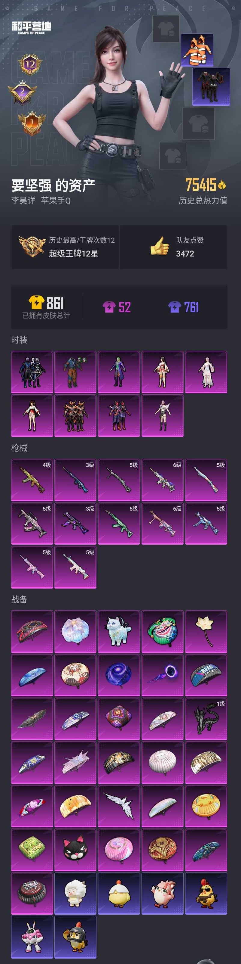 【和平精英】【lyhp19529】9粉装12特效呛 怪诞乔克 不知火舞 星之彼岸 小丑鱼 暗影哥特 6级m4灵猫魔法师 3级ump45宇宙意志 9粉装,12特效呛,0载具,历史最高段位:超级王牌12星 王牌印记12次 热力值:75415,166套装,236呛械,286装备,142战备;套装:套装-怪诞乔克,套装-星之彼岸,套装-暗夜玫瑰,套装-赤焰黑爵,角色-小可学妹,角色-茉莉星,角色-烟云彩露,角色-狂花道·不知火舞,角色-狂魇小丑,套装-特训学院,套装-猎鹰,套装-青年教官,套装-橘黑制服,套装-红色运动,套装-黄色运动,套装-蓝色运动,套装-黄色伏地魔,套装-白色伏地魔,套装-黑色伏地魔,套装-骑行爱好者,套装-竞技名士,套装-深蓝色名流,套装-酒红色名流,套装-湖蓝色名流,套装-黄色名流,套装-猛禽,套装-长空猛禽,套装-黎明保卫者,套装-蓝色守护者,套装-海岛探路者,套装-旭日情侣,套装-冷焰舞者,套装-灼焰舞者,套装-战地督导,套装-黄色格斗者,套装-活力之心,套装-甜蜜告白,套装-滨海假日,套装-完美偶像,套装-人气偶像,套装-幻影武者,套装-街头潮人,套装-蓝彩潮人,套装-魅力单车,套装-绮丽涂鸦,套装-竞技达人朋克,套装-野性战心,套装-破晓战魂,套装-都市魅力,套装-荣耀,套装-酷潮明星,套装-摩艾涂鸦,套装-幻世战舞者,套装-甜蜜菠萝,套装-暗影哥特,套装-青涩时光,套装-缤纷果语,套装-alan walker,套装-龙魂突击队,套装-风暴特警,套装-冰川特警,套装-元素星魂,套装-极速红龙,套装-格斗先锋,套装-小丑鱼,套装-梦魇先生,套装-破蛋小黄鸡,套装-疯狂小兔子,套装-北国孤狼,套装-鹤鸣,套装-速跑银狼,套装-神秘黑猫,套装-夏日音浪,套装-ss9特训,套装-4am战队服,套装-牛气满满,套装-梦之呓语,套装-战术大师,套装-牛气冲天,套装-ss18特训,套装-耀粉歌者,套装-曼妙人鱼,套装-热情海星,套装-纯真浪花,套装-暗夜魅影,套装-暗夜傀儡,套装-ss17特训,套装-瑞龙福将,套装-团圆交子,套装-虎虎生威吉莉,套装-缤纷焰火,套装-异彩先驱,套装-霓虹极客,套装-空投萌叽,套装-ss19特训,套装-飞驰魅影,套装-音速流光,套装-ss20特训,套装-ss21特训,套装-玉兔迎春,套装-ss22特训,套装-绯格组合,套装-ss23特训,套装-王牌教练,套装-柠萌假日,套装-青玉碎影,套装-ss24特训,套装-龟仙人,套装-ss25特训,套装-惊鸿侠骨,套装-锦衣飞扬,套装-晨曦薄雾,套装-香桃花海,套装-龙的传人,套装-冰河战士,套装-ss26特训,套装-快闪甜心,套装-春光漫游,套装-空岛之星,套装-贝斯之夜,玩偶服-超人强,套装-焰鹰斗篷,套装-幽夜迷踪,套装-幻羽潜行,套装-ss27特训,套装-老实芭蕉,套装-ss28特训,角色-蝶吟花词,套装暗影刺翼,玩偶服-卖崽青蛙,角色-粉雾星云,角色-情公主,角色-银尘,角色-8号机,角色-mark.06,套装-海盐绵绵冰,套装-蝶变,套装-粉日山川,套装-小熊娃娃,套装-ss29特训,套装-雏菊兔兔,套装-萝兰蝴蝶,套装-火种守卫者,套装-星途旅人,套装-ss30特训,套装-青团波波,套装-糖糖葫芦,套装-诡诞巡游,套装-ss31特训,套装-ss33特训,套装-云朵鹅,套装-彩虹兔,套装-雪绒豹,角色-灵公主,套装-蜜露汐语,套装-元气之梦,套装-ss34特训,套装-朱霞炽焰,套装-凌霄紫焰,套装-薄荷星砂,套装-ss35特训,套装-琴音绮想,套装-画境星梦,角色-玄霖雨神,套装-ss36特训,套装-雪国风尚;呛皮:5级scar-l-锦绣绵绵,scar-l-红色方程式,scar-l-炫彩节奏,scar-l-暗夜玫瑰,scar-l-彩虹符号,scar-l-玉兔迎春,scar-l-星途旅人,scar-l-海盐豹豹,scar-l-冷漠罗丽,scar-l-乌木金纹,aug-耀粉歌者,aug-天降萌叽,aug-闲梦青缨,aug-异域银装,aug-紫晶流影,arx-凌霄紫焰,5级m762-青锋波束,m762-甜心宝贝,m762-牛气冲天,m762-瑞龙福将,m762-天降萌叽,m762-雏菊兔兔,m762-云朵鹅,5级m416-电玩时刻,6级m416-灵猫魔法师,m416-蓝色火焰,m416-红色方程式,m416-糯团青竹,akm-缤纷海域,akm-破晓战魂,akm-夜灯,akm-涂鸦街区,akm-星之彼岸,akm-彩虹符号,akm-虎虎生威,akm-龙的传人,akm-灵猫魔法师,akm-乌木金纹,5级groza-镜光银凌,groza-异彩先驱,groza-恐龙拽拽,groza-海盐豹豹,groza-荧海星豚,ac-val-乌木金纹,ac-val-天降萌叽,ac-val-快闪甜心,ac-val-宇宙意志,famas-璀璨流光,famas-墨龙九天,famas-霓彩脉冲,famas-乌木金纹,m16a4-蓝色火焰,m16a4-生命誓言,m16a4-红色方程式,m16a4-冰河战士,蜜獾-天降萌叽,蜜獾-精灵梦叶罗丽,蜜獾-糖糖葫芦,q-神秘黑猫,q-洛神天依,q-飞驰魅影,q-纯真浪花,q-乌木金纹,ace32-画境星梦,mk47-林间仙鹿,mk47-乌木金纹,g36c-暗夜玫瑰,g36c-乌木金纹,win94-瑞龙福将,win94-拳皇·狂花道,m200-仲夏莫吉托,m200-惊鸿侠骨,m200-爆裂游戏,m200-乌木金纹,awm-恐龙拽拽,awm-天降萌叽,awm-焰鹰斗篷,awm-纯真浪花,svd-冷漠罗丽,svd-云朵鹅,5级kar98k-巳巳如意,kar98k-红色方程式,kar98k-彩虹符号,kar98k-炫彩节奏,kar98k-飞驰魅影,kar98k-顶峰精英,kar98k-最终圣卫者,莫辛纳甘-乌木金纹,莫辛纳甘-蜜语绒猫,m24-影袭,m24-乌木金纹,amr-墨龙九天,amr-喜羊羊与灰太狼,amr-乌木金纹,mini14-金鼠迎春,mini14-耀粉歌者,mini14-阿狸红,mini14-林间仙鹿,mini14-异彩先驱,mini14-香桃花海,mini14-雏菊兔兔,mk20-h-快闪甜心,mk20-h-星梦奇缘,mk20-h-竞速先锋,mk20-h-星途旅人,mk20-h-糖糖葫芦,mk20-h-狂鲨锋刃,mk20-h-乌木金纹,sks-乌木金纹,vss-星之彼岸,vss-香桃花海,m417-惊鸿侠骨,m417-玩趣呆呆,m417-猪猪侠,mk14-乌木金纹,mk14-冰河战士,mk14-薄荷星砂,m1加兰德-画境星梦,3级slr-暗夜玫瑰,slr-守护天翼,slr-璀璨流光,slr-极冰使者,mk12-乌木金纹,uzi-生命誓言,uzi-红色方程式,uzi-幻影战神,uzi-炫彩节奏,uzi-