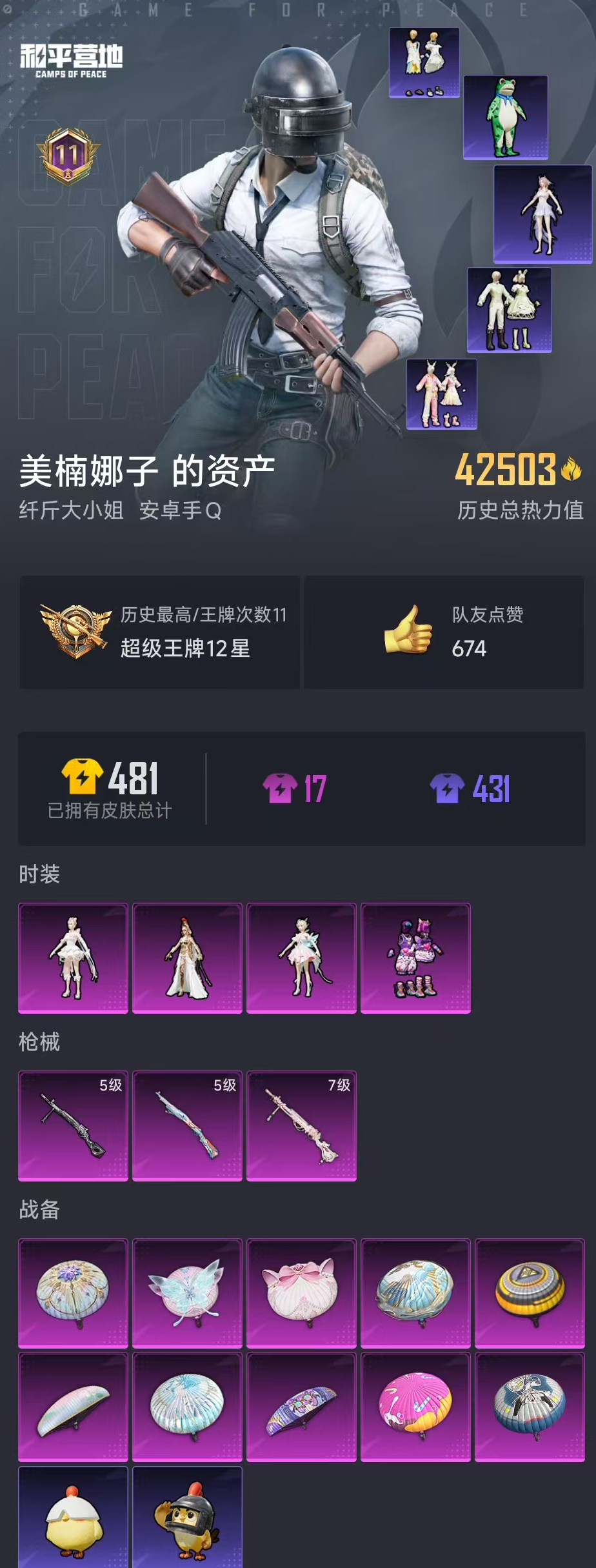 【和平精英】【lyhp19565】4.2w热力值 4粉装3特效呛 千金淑猫 满级大盘鸡 4粉装,3特效呛,0载具,历史最高段位:超级王牌12星 王牌印记11次 热力值:42503,110套装,124呛械,150装备,80战备;套装:套装-蓝莓炮弹,角色-千金淑猫,角色-萨利娅,角色-晶梦幻蝶,套装-特训学院,套装-青年教官,套装-蓝色运动,套装-白色伏地魔,套装-黑色伏地魔,套装-竞技名士,套装-深蓝色名流,套装-长空猛禽,套装-漫步者,套装-黎明保卫者,套装-贵族骑装,套装-春日漫步,套装-完美偶像,套装-人气偶像,套装-街头潮人,套装-蓝彩潮人,套装-千禧之恋,套装-魅力单车,套装-绮丽涂鸦,套装-竞技达人朋克,套装-夜莺强袭者,套装-破晓战魂,套装-都市魅力,套装-荣耀,套装-热血青春,套装-甜蜜菠萝,套装-甜蜜熊情侣,套装-缤纷果语,套装-龙魂突击队,套装-元素星魂,套装-极速红龙,套装-格斗先锋,套装-海上生明月,套装-粉红小猪,套装-破蛋小黄鸡,套装-疯狂小兔子,套装-北国孤狼,套装-鹤鸣,套装-霓虹街区,套装-牛气满满,套装-白糯汤圆,套装-诡面顽熊,套装-青春冒险家,套装-潮流游乐家,套装-萌趣颜团子,套装-特种颜团子,套装-战术大师,套装-ss18特训,套装-耀粉歌者,套装-ss14特训,套装-ss15特训,套装-ss16特训,套装-ss17特训,套装-团圆交子,套装-爆裂葡萄,套装-福星高照,套装-虎虎生威吉莉,套装-异彩先驱,套装-霓虹极客,套装-空投萌叽,套装-ss19特训,套装-炫蓝之夏,套装-ss21特训,套装-ss23特训,套装-神气柴柴,套装-柠萌假日,套装-青玉碎影,套装-ss24特训,套装-龟仙人,套装-ss25特训,套装-ss26特训,套装-空岛之星,套装-云魄琉璃,套装-ss27特训,套装-恋语绒绒,玩偶服-卖崽青蛙,套装-街头风暴,套装-海盐绵绵冰,套装-蝶变,套装-创世·追猎,套装-ss29特训,套装-雏菊兔兔,套装-萝兰蝴蝶,套装-异域银装,角色-摩登魅猫,套装-星途旅人,套装-ss31特训,套装-鱼渊荷华,套装-燕燕于飞,套装-智谋强哥,套装-紫幽梦,套装-晶辉守护,套装-ss33特训,角色-猎影月神,套装-云朵鹅,套装-巳巳如意,套装-ss32特训,套装-彩虹兔,套装-蓝冰羽,套装-雪绒豹,套装-极速光影,角色-鲛海歌灵,套装-蜜露汐语,套装-ss34特训,套装-朱霞炽焰,套装-薄荷星砂;呛皮:m416-蓝色火焰,m416-红色方程式,m416-糯团青竹,ac-val-乌木金纹,aug-耀粉歌者,aug-青春冒险家,aug-天降萌叽,aug-异域银装,m16a4-红色方程式,m16a4-冰河战士,m16a4-千金淑猫,mk47-青春冒险家,mk47-洛神天依,scar-l-红色方程式,scar-l-炫彩节奏,scar-l-暗夜玫瑰,scar-l-海盐豹豹,g36c-青丘仙客,g36c-星穹咏叹调,g36c-乌木金纹,m762-牛气冲天,m762-天降萌叽,m762-雏菊兔兔,m762-云朵鹅,akm-彩虹符号,akm-萌趣颜团子,akm-虎虎生威,groza-异彩先驱,groza-晶梦幻蝶,groza-荧海星豚,famas-乌木金纹,蜜獾-乌木金纹,arx-凌霄紫焰,q-神秘黑猫,q-潮汐统领,5级kar98k-巳巳如意,kar98k-彩虹符号,kar98k-顶峰精英,kar98k-乌木金纹,svd-云朵鹅,m24-奇异狩猎者,m24-乌木金纹,amr-鬼刀,amr-乌木金纹,win94-晶梦幻蝶,awm-天降萌叽,莫辛纳甘-乌木金纹,m200-乌木金纹,vss-碧影闪光,vss-彩虹符号,vss-香桃花海,mini14-异彩先驱,mini14-香桃花海,mini14-雏菊兔兔,mk14-乌木金纹,mk14-冰河战士,mk14-紫幽梦,mk14-薄荷星砂,qbu-青春冒险家,sks-糯团青竹,mk20-h-乌木金纹,野牛-青春冒险家,野牛-雏菊兔兔,野牛-燕燕于飞,野牛-魔童闹海 敖闰,野牛-乌木金纹,ump45-生命誓言,ump45-绒宝小鹅,mp5k-异彩先驱,mp5k-乌木金纹,aks-74u-鸡智如我,aks-74u-乌木金纹,汤姆逊-异彩先驱,p90-筑梦精灵,p90-玩趣呆呆,p90-巳巳如意,p90-乌木金纹,uzi-影袭,uzi-冰河战士,uzi-啾咪啾咪,vect-创世·救赎,vect-燕燕于飞,js9-凌霄紫焰,s1897-神秘黑猫,s1897-紫幽梦,s1897-荧海星豚,s1897-乌木金纹,dbs-乌木金纹,spas-12-燕燕于飞,spas-12-云朵鹅,spas-12-乌木金纹,s12k-玩趣呆呆,s686-葫芦兄弟,s686-千金淑猫,s686-巳巳如意,mg-36-凌霄紫焰,m249-彩虹符号,m249-乌木金纹,7级dp-28-千金淑猫,5级dp-28-豹影疾电,pkm-啾咪啾咪,pkm-紫幽梦,蝎式手呛-千金淑猫,蝎式手呛-燕燕于飞,r1895-雏菊兔兔,p92-紫幽梦,p92-凌霄紫焰,短管霰弹-星穹咏叹调,沙墨之鹦-云朵鹅,平底锅-青春冒险家,平底锅-异彩先驱,平底锅-空岛之星,平底锅-雏菊兔兔,平底锅-紫幽梦,平底锅-宁雨蝶,平底锅-凌霄紫焰,大砍刀-云朵鹅,燃点复合弓-幻海仙踪,破片手留单-萌趣颜团子,破片手留单-呆爆全场,破片手留单-海盐豹豹,破片手留单-巳巳如意,十子怒-燕燕于飞,盐雾蛋-冰氧夏日;降落伞:顶峰精英尾迹; 详情看图