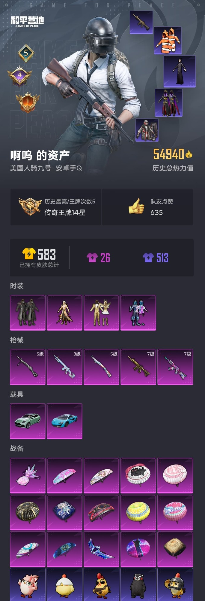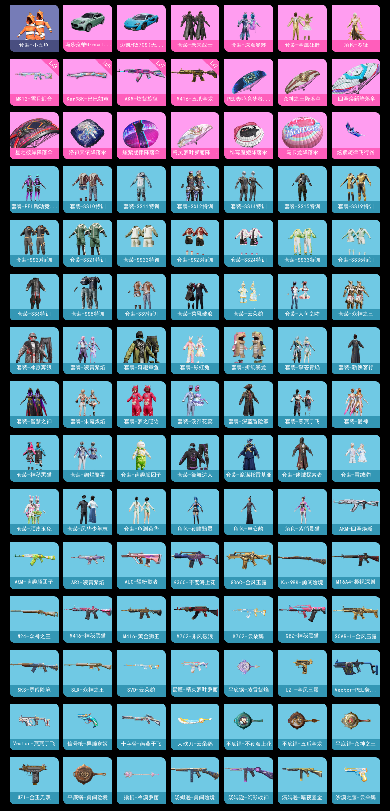 【和平精英】【lyhp19520】4粉装5特效呛2载具 小丑鱼 申公豹 未来战士 7级m4五爪金龙 7级ak炫紫旋律 4粉装,5特效呛,2载具,历史最高段位:传奇王牌14星 王牌印记5次 热力值:54940,126套装,156呛械,186装备,94战备;套装:套装-未来战士,套装-深海曼妙,套装-金属狂野,角色-罗征,套装-黄色运动,套装-骑行爱好者,套装-竞技名士,套装-酒红色名流,套装-湖蓝色名流,套装-黄色名流,套装-长空猛禽,套装-竞技勇士朋克,套装-蓝色守护者,套装-海岛探路者,套装-旭日情侣,套装-冷焰舞者,套装-特战装甲,套装-战地菁英,套装-特殊使命,套装-街舞达人,套装-灰色格斗者,套装-甜蜜告白,套装-春日漫步,套装-完美偶像,套装-海滨突袭者,套装-耀眼新星,套装-雪山征服者,套装-朋克治安官,套装-都市漫游者,套装-超能勇士,套装-破晓战魂,套装-幻世保卫者,套装-热血青春,套装-沙漠兵团,套装-雪山精英,套装-酷潮明星,套装-传奇侦探,套装-奇趣章鱼,套装-冰原奔狼,套装-半糖蓝莓,套装-缤纷果语,套装-滨海厨神,套装-耀动青春,套装-格斗先锋,套装-小丑鱼,套装-破蛋小黄鸡,套装-疯狂小兔子,套装-深蓝冒险家,套装-迷域探索者,套装-ss5特训,套装-圣诞大吉,套装-熔岩使者,套装-凛冬战士,套装-折纸暴龙,套装-金鼠迎春,套装-北国孤狼,套装-ss6特训,套装-淡雅花蕊,套装-新侠客行,套装-鹤鸣,套装-ss10特训,套装-ss8特训,套装-众神之王,套装-爱神,套装-智慧之神,套装-神秘黑猫,套装-白熊同盟,套装-萌黄之夏,套装-pel躁动竞梦者,套装-人鱼之吻,套装-夏日音浪,套装-ss9特训,套装-风华少年志,套装-顽皮玉兔,套装-探宝勇士,套装-乘风破浪,套装-牛气满满,套装-梦之呓语,套装-ss11特训,套装-诡谋托雷基亚,套装-萌趣颜团子,套装-战术大师,套装-ss12特训,套装-牛气冲天,套装-ss14特训,套装-ss15特训,套装-ss19特训,套装-ss20特训,套装-ss21特训,套装-玉兔迎春,套装-ss22特训,套装-绚烂繁星,套装-ss23特训,套装-王牌教练,套装-柠萌假日,套装-青玉碎影,套装-ss24特训,套装-漫游都市,套装-云魄琉璃,套装-恋语绒绒,角色-紫俏灵猫,套装-异域银装,角色-夜瞳黯灵,套装-ss31特训,套装-鱼渊荷华,套装-燕燕于飞,套装-ss33特训,套装-云朵鹅,套装-ss32特训,套装-彩虹兔,套装-顶瓜瓜,套装-雪绒豹,套装-狂鲨锋刃,套装-大橘大利,套装-炫彩糖果,套装-元气之梦,套装-ss34特训,套装-擎苍青焰,套装-朱霞炽焰,角色-申公豹,套装-游乐,套装-凌霄紫焰,套装-薄荷星砂,套装-ss35特训,套装-粉黛兰香,套装-萌鸡速递;呛皮:q-神秘黑猫,q-彩虹符号,q-乌木金纹,蜜獾-天降萌叽,蜜獾-精灵梦叶罗丽,蜜獾-鸡智如我,蜜獾-乌木金纹,groza-彩虹符号,groza-无面战甲,groza-乌木金纹,scar-l-金风玉露,scar-l-夜灯,scar-l-彩虹符号,scar-l-玉兔迎春,scar-l-乌木金纹,7级akm-炫紫旋律,akm-灼热熔岩,akm-破晓战魂,akm-四圣焕新,akm-涂鸦街区,akm-萌趣颜团子,akm-霓彩脉冲,akm-乌木金纹,akm-绿洲时空,arx-凌霄紫焰,g36c-金风玉露,g36c-不夜海上花,famas-霓彩脉冲,famas-乌木金纹,7级m416-五爪金龙,m416-夜灯,m416-黄金狮王,m416-神秘黑猫,m416-糯团青竹,m416-乌木金纹,aug-耀粉歌者,aug-异域银装,aug-紫晶流影,aug-乌木金纹,m762-乘风破浪,m762-牛气冲天,m762-天降萌叽,m762-云朵鹅,m762-乌木金纹,m16a4-凝视深渊,m16a4-幻世战舞者,mk47-乌木金纹,5级kar98k-巳巳如意,kar98k-狮舞迎春,kar98k-勇闯险境,kar98k-乌木金纹,amr-鸡智如我,awm-天降萌叽,awm-绿洲时空,m200-乌木金纹,svd-云朵鹅,svd-霓彩脉冲,m24-冰封烈焰,m24-众神之王,m24-炫彩节奏,m24-快狙起手快手,m24-乌木金纹,莫辛纳甘-乌木金纹,win94-乌木金纹,sks-勇闯险境,slr-众神之王,slr-彩虹符号,slr-霓彩脉冲,3级mk12-雪月幻音,mk14-乌木金纹,mk14-薄荷星砂,mk14-紫晶流影,m417-玩趣呆呆,mini14-金鼠迎春,mini14-炫彩节奏,mini14-绯穹魔姬,mini14-鸡智如我,qbu-不夜海上花,vss-乌木金纹,uzi-红色方程式,uzi-金玉无双,uzi-金风玉露,uzi-众神之王,uzi-炫彩糖果,ump45-夜灯,ump45-天启纪元,ump45-海盐豹豹,ump45-乌木金纹,ump45-绿洲时空,汤姆逊-幻影战神,汤姆逊-勇闯险境,汤姆逊-暗夜鎏金,汤姆逊-乌木金纹,js9-凌霄紫焰,野牛-燕燕于飞,野牛-乌木金纹,vect-生命誓言,vect-pel轰鸣竞梦者,vect-彩虹符号,vect-燕燕于飞,aks-74u-鬼刀,aks-74u-鸡智如我,aks-74u-乌木金纹,p90-飞驰魅影,mp5k-众神之王,mp5k-乌木金纹,s1897-勇闯险境,s1897-神秘黑猫,s1897-糯团青竹,s1897-乌木金纹,s686-生命誓言,s686-冰封烈焰,s686-深海曼妙,s686-不夜海上花,s12k-破晓战魂,s12k-夜灯,s12k-pel轰鸣竞梦者,s12k-玩趣呆呆,s12k-霓彩脉冲,dbs-彩虹符号,spas-12-燕燕于飞,spas-12-狂鲨锋刃,spas-12-云朵鹅,pkm-啾咪啾咪,m249-彩虹符号,m249-无面战甲,m249-绯穹魔姬,m249-乌木金纹,mg3-幻世战舞者,mg3-乌木金纹,mg3-霓彩脉冲,mg-36-凌霄紫焰,5级dp-28-豹影疾电,dp-28-乌木金纹,p92-凌霄紫焰,p1911-冰封烈焰,p1911-无面战甲,信号呛-异瞳寒姬,蝎式手呛-燕燕于飞,沙墨之鹦-云朵鹅,平底锅-冰封烈焰,平底锅-五爪金龙,平底锅-勇闯险境,平底锅-众神之王,平底锅-不夜海上花,平底锅-属我最6,平底锅-凌霄紫焰,撬棍-传奇侦探,撬棍-冷漠罗丽,大砍刀-云朵鹅,十子怒-燕燕于飞,十子怒-异域银装,盐雾蛋-冰氧夏日,破片手留单-海盐豹豹,破片手留单-拽到爆炸,铝热弹-炫彩糖果;载具:玛莎拉蒂grecale薄荷绿,迈凯伦570s天际蓝;降落伞:炫紫旋律飞行器,炫彩糖果飞行器,粉色滑翔尾迹,红色滑翔尾迹,异域银装飞行器,破刃行动尾迹,鸡智如我飞行器; 详情看图