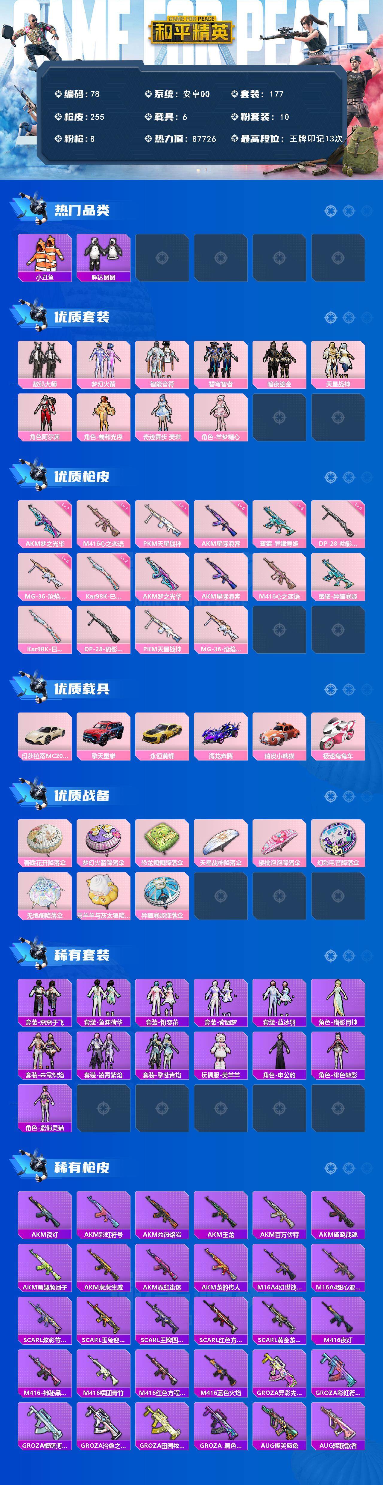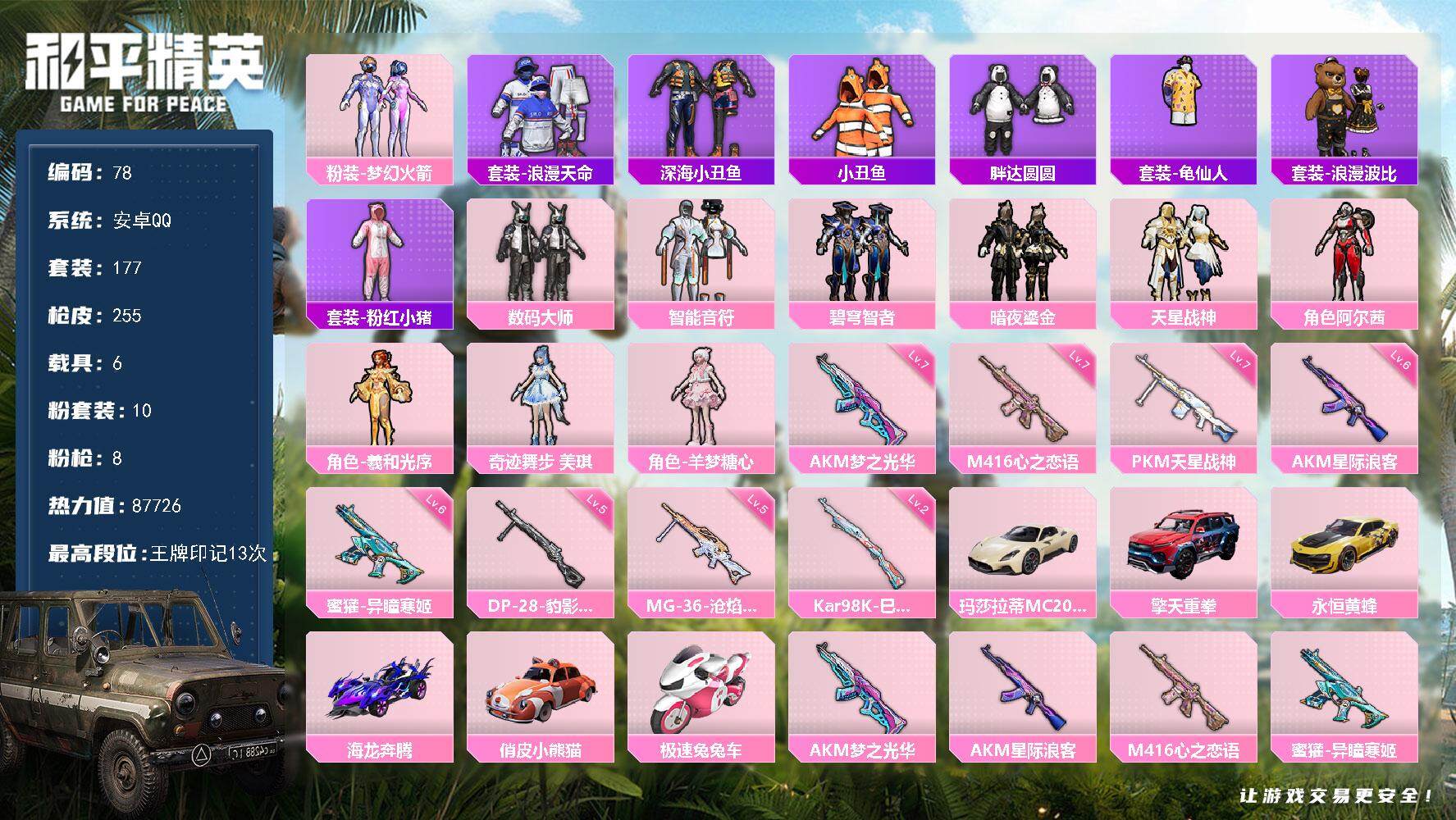 6载具-177套装-255呛皮-【6载具10粉装8特效】安卓q-2稀有6载具10粉装8特效呛21热门177套装255呛皮 87726热力值 13印记 历史超级王牌17星 【2稀有】 akm-百万伏特 浪漫天命 【6载具】 玛莎拉蒂m白色 擎天重拳 永恒黄蜂 海龙奔腾 俏皮小熊猫 极速兔兔车 【10粉装】 梦幻火箭 奇迹舞步美琪 阿尔茜 天星战神 羊梦糖心 羲和光序 智能音符 碧穹智者 数码大师 暗夜鎏金 【8