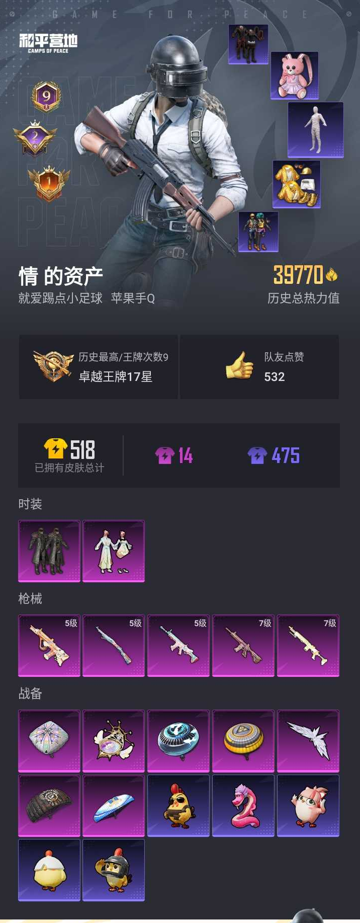 【和平精英】【lyhp19611】3w9热力值精品追猎号 2粉装5满级特效呛 冥河战士 未来战士 派对舞王 暗影哥特 小丑鱼 粉熊背包 满级恋语m4 满级妹控 满级aug 2粉装,5特效呛,0载具,历史最高段位:卓越王牌17星 王牌印记9次 热力值:39770,94套装,119呛械,187装备,99战备;套装:套装-未来战士,套装-莲影清波,套装-黑色伏地魔,套装-竞技名士,套装-长空猛禽,套装-漫步者,套装-海岛探路者,套装-旭日情侣,套装-浪漫天命,套装-浪漫假日,套装-特殊使命,套装-活力之心,套装-鹰眼刺客,套装-冰冻风暴,套装-摇滚战魂,套装-蓝彩潮人,套装-千禧之恋,套装-魅力单车,套装-绮丽涂鸦,套装-耀眼新星,套装-坚韧舞者,套装-都市漫游者,套装-野性战心,套装-狂沙舞者,套装-派对舞王,套装-极地朋克,套装-暗影哥特,套装-深海小丑鱼,套装-青涩时光,套装-缤纷果语,套装-alan walker,套装-龙魂突击队,套装-沙暴袭击者,套装-小丑鱼,套装-冥河战士,套装-万圣娃娃,套装-霓虹街区,套装-战术大师,套装-曼妙人鱼,套装-热情海星,套装-纯真浪花,套装-吉莉礼服,套装-绯格组合,套装-ss23特训,套装-柠萌假日,套装-ss24特训,套装-龟仙人,套装-涂山之恋,套装-ss25特训,套装-惊鸿侠骨,套装-锦衣飞扬,套装-元气发射,套装-香桃花海,套装-沙丘之歌,套装-龙的传人,套装-冰河战士,套装-ss26特训,套装-快闪甜心,套装-春光漫游,套装-空岛之星,套装-贝斯之夜,玩偶服-菲菲,套装-焰鹰斗篷,套装-幽夜迷踪,套装-幻羽潜行,套装-ss27特训,套装-恋语绒绒,套装-老实芭蕉,套装-ss28特训,角色-蝶吟花词,角色-银尘,角色-mark.06,套装-海盐绵绵冰,套装-蝶变,套装-湖畔霞光,套装-小熊娃娃,套装-ss29特训,套装-雏菊兔兔,套装-萝兰蝴蝶,套装-鹿角斗士,套装-星途旅人,角色-临安公主,套装-ss30特训,套装-绒宝小鹅,套装-ss31特训,套装-鱼渊荷华,套装-燕燕于飞,角色-瑰梦爱神,套装-晶辉守护,套装-ss33特训,套装-巳巳如意,套装-ss32特训,套装-ss34特训,套装-ss35特训;呛皮:5级scar-l-锦绣绵绵,scar-l-红色方程式,scar-l-银河战甲,scar-l-甜蜜旋律,scar-l-星途旅人,scar-l-海盐豹豹,scar-l-小狗蛇点点,akm-破晓战魂,akm-霓虹街区,akm-龙的传人,m762-天降萌叽,m762-雏菊兔兔,7级m416-心之恋语,m416-绯红前夜,m416-糯团青竹,m16a4-冥河战士,m16a4-冰河战士,famas-璀璨流光,famas-突变脉冲,famas-乌木金纹,ac-val-乌木金纹,ac-val-快闪甜心,蜜獾-天降萌叽,蜜獾-乌木金纹,5级aug-暖羊咩咩,aug-甜蜜菠萝,aug-耀粉歌者,q-纯真浪花,groza-影袭,groza-海盐豹豹,awm-焰鹰斗篷,awm-纯真浪花,5级kar98k-巳巳如意,kar98k-红色方程式,kar98k-彩虹符号,kar98k-2b战斗服款,m200-惊鸿侠骨,m200-六号稻草人,m200-乌木金纹,m24-影袭,m24-仲夏莫吉托,amr-乌木金纹,莫辛纳甘-乌木金纹,mk20-h-快闪甜心,mk20-h-竞速先锋,mk20-h-星途旅人,mk20-h-乌木金纹,mini14-涂山之恋,mini14-香桃花海,mini14-雏菊兔兔,7级mk14-闲梦青缨,mk14-冰河战士,mk14-电光马卡龙,sks-金玉无双,sks-迅猛狂鲨,m417-惊鸿侠骨,vss-香桃花海,uzi-影袭,uzi-天降萌叽,uzi-冰河战士,uzi-啾咪啾咪,uzi-霓彩节奏,uzi-幻影飞狐,vect-夜灯,vect-焰鹰斗篷,vect-突变脉冲,vect-燕燕于飞,p90-倾城蜜语,p90-快闪甜心,p90-玩趣呆呆,p90-巳巳如意,p90-乌木金纹,ump45-生命誓言,ump45-金玉无双,ump45-荒野猎神,ump45-繁龙极客,mp5k-彩虹嘻嘻猴,mp5k-乌木金纹,野牛-雏菊兔兔,野牛-燕燕于飞,汤姆逊-炫彩节奏,汤姆逊-天降萌叽,汤姆逊-纯真浪花,aks-74u-乌木金纹,dbs-第五大道,dbs-圣堂之誓,dbs-焰鹰斗篷,dbs-乌木金纹,spas-12-燕燕于飞,spas-12-乌木金纹,s686-彩虹符号,s686-巳巳如意,s12k-玩趣呆呆,aa12-g-纯真浪花,s1897-精灵梦叶罗丽,pkm-啾咪啾咪,mg3-惊鸿侠骨,m249-彩虹符号,m249-糯团青竹,dp-28-焰鹰斗篷,r1895-雏菊兔兔,tmp-9-江南烟雨,沙墨之鹦-快闪甜心,短管霰弹-竹节火铳,蝎式手呛-燕燕于飞,平底锅-惊鸿侠骨,平底锅-快闪甜心,平底锅-空岛之星,平底锅-焰鹰斗篷,平底锅-纯真浪花,平底锅-雏菊兔兔,平底锅-属我最6,撬棍-冥河战士,破片手留单-呆爆全场,破片手留单-星途旅人,破片手留单-巳巳如意,十子怒-燕燕于飞,盐雾蛋-鸢尾晶梦,爆炸猎弓-惊鸿侠骨;降落伞:镜光幻境飞行翼,彩虹独角兽飞行器,空岛之星尾迹,顶峰精英尾迹,破刃行动尾迹; 详情看图