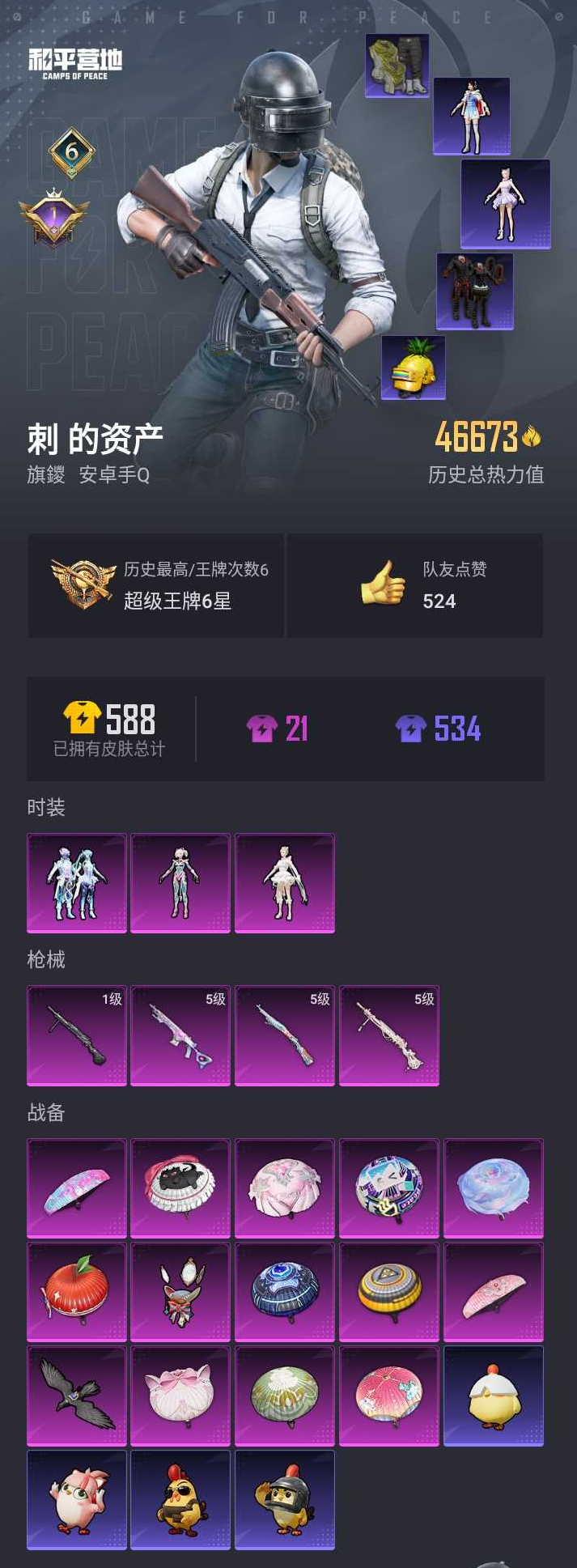 【和平精英】【lyhp19597】3粉装4特效呛 千金淑猫 赵灵儿 暗影哥特 狂沙舞者 5级dp-28千金淑猫 3粉装,4特效呛,0载具,历史最高段位:超级王牌6星 王牌印记6次 热力值:46673,132套装,164呛械,180装备,92战备;套装:角色-千金淑猫,角色-幻星舰长,套装-幻彩电音,套装-特训学院,套装-猎鹰,套装-青年教官,套装-橘黑制服,套装-红色运动,套装-黄色运动,套装-蓝色运动,套装-黄色伏地魔,套装-白色伏地魔,套装-黑色伏地魔,套装-竞技名士,套装-深蓝色名流,套装-酒红色名流,套装-湖蓝色名流,套装-黄色名流,套装-猛禽,套装-长空猛禽,套装-漫步者,套装-蓝色守护者,套装-海岛探路者,套装-冷焰舞者,套装-灼焰舞者,套装-特战装甲,套装-特殊使命,套装-甜蜜告白,套装-沙漠毒蛇,套装-完美偶像,套装-人气偶像,套装-幻影武者,套装-怒火燎原,套装-魅力单车,套装-绮丽涂鸦,套装-耀眼新星,套装-坚韧舞者,套装-竞技达人朋克,套装-狂沙舞者,套装-破晓战魂,套装-都市魅力,套装-荣耀,套装-热血青春,套装-沙漠兵团,套装-幻世战舞者,套装-暗影哥特,套装-缤纷果语,套装-alan walker,套装-龙魂突击队,套装-冰川特警,套装-元素星魂,套装-极速红龙,套装-麻辣教官,套装-万圣娃娃,套装-鹤鸣,套装-霓虹街区,套装-探宝勇士,套装-牛气满满,套装-战术大师,套装-牛气冲天,套装-ss18特训,套装-耀粉歌者,套装-竞技角斗士,套装-ss17特训,套装-虎虎生威吉莉,套装-ss19特训,套装-炫蓝之夏,套装-ss20特训,套装-猎梦纪元,套装-甜心亚梦,套装-虚音幻奏,套装-ss21特训,套装-萌趣咩咩,套装-娇憨猪猪,套装-暖心橘喵,角色-林月如,角色-赵灵儿,套装-玉兔迎春,套装-ss22特训,套装-田园牧歌,套装-轻风白浪,套装-光之冒险,套装-绯格组合,套装-ss23特训,套装-青玉碎影,套装-ss24特训,套装-龟仙人,套装-ss25特训,套装-龙的传人,套装-冰河战士,套装-ss26特训,套装-漫游都市,套装-空岛之星,套装-无暇誓言,套装-明鸳圣池,套装-焰鹰斗篷,套装-幻羽潜行,套装-ss27特训,套装-恋语绒绒,套装-老实芭蕉,套装-ss28特训,套装-街头风暴,套装-海盐绵绵冰,套装-ss29特训,角色-摩登魅猫,角色-都市丽猫,套装-星途旅人,角色-怀庆长公主,套装-ss30特训,套装-青团波波,套装-暗夜风云,套装-糖糖葫芦,套装-萌萌史莱姆,套装-墨青刃影,套装-ss31特训,套装-鱼渊荷华,套装-燕燕于飞,套装-紫幽梦,套装-粉恋花,套装-ss33特训,套装-ss32特训,套装-蓝冰羽,套装-雪绒豹,套装-大橘大利,角色-灵公主,角色-鲛海歌灵,套装-星渊小夜曲,套装-蜜露汐语,玩偶服-美羊羊,套装-ss34特训,套装-薄荷星砂,套装-ss35特训;呛皮:ac-val-甜心亚梦,ac-val-乌木金纹,ac-val-彩虹甜喵,ac-val-天降萌叽,scar-l-红色方程式,scar-l-黄金龙骨,scar-l-玉兔迎春,scar-l-星途旅人,scar-l-海盐豹豹,q-彩虹符号,m16a4-蓝色火焰,m16a4-甜心亚梦,m16a4-幻世战舞者,m16a4-冰河战士,m16a4-千金淑猫,groza-彩虹符号,groza-田园牧歌,groza-海盐豹豹,groza-荧海星豚,蜜獾-娇憨猪猪,蜜獾-天降萌叽,蜜獾-糖糖葫芦,蜜獾-乌木金纹,akm-破晓战魂,akm-霓虹街区,akm-虎虎生威,m762-奇异狩猎者,m762-彩虹符号,m762-彩虹甜喵,m762-天降萌叽,m762-云朵鹅,aug-甜蜜菠萝,aug-耀粉歌者,aug-天降萌叽,m416-蓝色火焰,m416-红色方程式,m416-糯团青竹,ace32-蓝晶绮麟,famas-乌木金纹,g36c-乌木金纹,mk47-乌木金纹,m200-乌木金纹,amr-乌木金纹,5级kar98k-巳巳如意,kar98k-红色方程式,kar98k-王子的夏天,kar98k-彩虹符号,m24-蓝晶绮麟,m24-乌木金纹,win94-星兔领航员,win94-乌木金纹,svd-冷漠罗丽,svd-云朵鹅,awm-焰鹰斗篷,莫辛纳甘-乌木金纹,vss-田园牧歌,vss-彩虹符号,vss-香桃花海,mk20-h-星途旅人,mk20-h-糖糖葫芦,mk20-h-乌木金纹,5级mk14-甜梦熊击,mk14-乌木金纹,mk14-冰河战士,mk14-紫幽梦,mini14-耀粉歌者,mini14-千面幻镜,mini14-绯穹魔姬,slr-娇憨猪猪,slr-彩虹符号,m417-蓝晶绮麟,sks-炫彩节奏,ump45-蓝色火焰,ump45-生命誓言,ump45-海盐豹豹,ump45-糖糖葫芦,ump45-绒宝小鹅,ump45-圣穹绘梦,uzi-红色方程式,uzi-娇憨猪猪,uzi-墨染幽兰,uzi-冰河战士,uzi-啾咪啾咪,mp5k-乌木金纹,vect-田园牧歌,vect-焰鹰斗篷,vect-燕燕于飞,野牛-燕燕于飞,野牛-乌木金纹,p90-巳巳如意,p90-乌木金纹,汤姆逊-耀粉歌者,汤姆逊-环太平洋,汤姆逊-天降萌叽,汤姆逊-智耀战神,aks-74u-鬼刀,dbs-甜心亚梦,dbs-彩虹甜喵,dbs-第五大道,dbs-焰鹰斗篷,dbs-乌木金纹,s12k-破晓战魂,s12k-娇憨猪猪,s12k-幻世战舞者,s12k-蓝晶绮麟,s12k-智耀战神,spas-12-田园牧歌,spas-12-燕燕于飞,spas-12-云朵鹅,spas-12-乌木金纹,s1897-炫彩节奏,s1897-紫幽梦,s1897-糯团青竹,aa12-g-萌物绒绒,s686-红色方程式,s686-千金淑猫,mg3-幻世战舞者,mg3-乌木金纹,mg3-智耀战神,mg3-霓彩脉冲,m249-破晓战魂,m249-彩虹符号,m249-无面战甲,m249-绯穹魔姬,m249-萌萌史莱姆,5级dp-28-千金淑猫,1级dp-28-豹影疾电,dp-28-彩虹符号,dp-28-甜心亚梦,dp-28-焰鹰斗篷,pkm-紫幽梦,短管霰弹-竹节火铳,短管霰弹-星穹咏叹调,沙墨之鹦-圣穹绘梦,沙墨之鹦-云朵鹅,蝎式手呛-千金淑猫,蝎式手呛-燕燕于飞,tmp-9-萌萌史莱姆,p92-紫幽梦,p18c-糖糖葫芦,平底锅-飞行日记,平底锅-甜心亚梦,平底锅-娇憨猪猪,平底锅-翩跹演武,平底锅-田园牧歌,平底锅-光之冒险,平底锅-空岛之星,平底锅-焰鹰斗篷,平底锅-精灵梦叶罗丽,平底锅-糖糖葫芦,平底锅-许七安,平底锅-紫幽梦,平底锅-属我最6,撬棍-幻世战舞者,撬棍-冷漠罗丽,大砍刀-黑金刀,大砍刀-云朵鹅,破片手留单-太空嘟嘟,破片手留单-呆爆全场,破