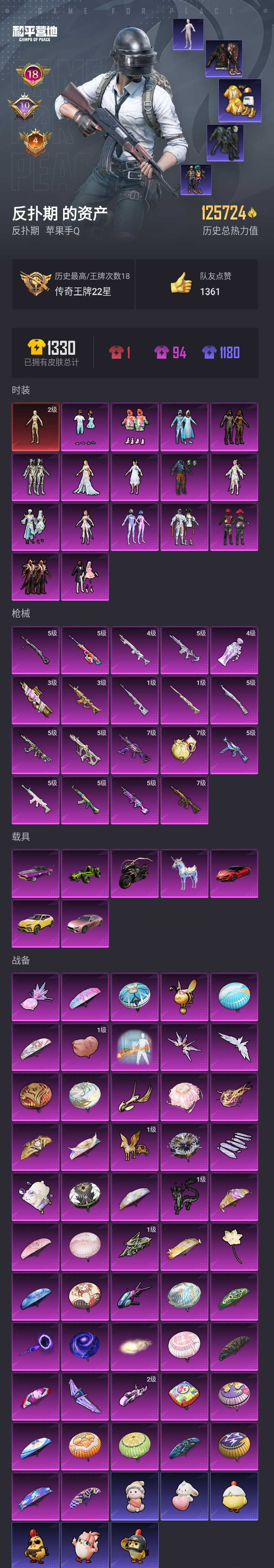 【和平精英】【lyhp19593】1红装16粉装19特效呛7载具 2级图卡盟 怪诞乔克 雪国幻梦 赵灵儿 梦幻火箭 放客神游 智能音符 绚金战神 (白木乃伊 都市猎人 赤蝎幽灵 派对舞王 深海小丑鱼 狂沙舞者)7级ump45宇宙意志 满级m4心之恋语 满级手蕾 5级aug许七安 3级死噶金蛇镇世 3级p90沙丘之主 玛莎拉蒂 星空马 仰望 合金龙骨 16粉装,19特效呛,7载具,历史最高段位:传奇王牌22星 王牌印记18次 热力值:125724,228套装,331呛械,502装备,229战备;套装:沙丘之主-图卡盟,套装-怪诞乔克,套装-雪国幻梦,套装-梦幻火箭,套装-智能音符,套装-放客神游,套装-绚金战神,套装-蜜桃特工,套装-炙焰牛王,女娲后裔-赵灵儿,套装-仲夏莫吉托,套装-炫光之旅,角色-圣堂之誓,套装-繁龙极客,套装-金丰海韵,角色-月影灵韵,角色-智耀战神,套装-黄色运动,套装-蓝色运动,套装-白色伏地魔,套装-骑行爱好者,套装-冰川格斗者,套装-竞技名士,套装-酒红色名流,套装-湖蓝色名流,套装-黄色名流,套装-猛禽,套装-长空猛禽,套装-漫步者,套装-竞技勇士朋克,套装-黎明保卫者,套装-蓝色守护者,套装-海岛探路者,套装-旭日情侣,套装-赤蝎幽灵,套装-都市猎人,套装-浪漫天命,套装-特战装甲,套装-特殊使命,套装-迎春赐吉,套装-春日漫步,套装-滨海假日,套装-沙漠毒蛇,套装-鹰眼刺客,套装-冰冻风暴,套装-红潮炫舞,套装-怒火燎原,套装-绮丽涂鸦,套装-耀眼新星,套装-坚韧舞者,套装-超能勇士,套装-狂沙舞者,套装-森林游猎者,套装-荣耀,套装-沙漠兵团,套装-派对舞王,套装-酷潮明星,套装-极地朋克,套装-幻世战舞者,套装-血色贵族,套装-呆萌铁蟹,套装-深海小丑鱼,套装-甜蜜熊情侣,套装-青涩时光,套装-缤纷果语,套装-滨海厨神,套装-alan walker,套装-龙魂突击队,套装-冰川特警,套装-元素星魂,套装-极速红龙,套装-冷血极客,套装-沙暴袭击者,套装-冥河战士,套装-爆竹金鼠,套装-北国孤狼,套装-ss6特训,套装-跃动心情,套装-ss7特训,套装-霓虹街区,套装-ss8特训,套装-萌黄之夏,套装-夏日音浪,套装-ss9特训,套装-探宝勇士,套装-牛气满满,套装-萌趣颜团子,套装-战术大师,套装-ss12特训,套装-牛气冲天,套装-ss18特训,套装-ss13特训,套装-曼妙人鱼,套装-热情海星,套装-纯真浪花,套装-ss14特训,套装-吉莉礼服,套装-ss15特训,套装-ss16特训,套装-暴风机械师,套装-时空追击者,套装-星辰守护者,角色-英勇保护者,套装-ss17特训,套装-瑞龙福将,套装-团圆交子,套装-福星高照,角色-军刀雅典娜,套装-异彩先驱,套装-霓虹极客,套装-空投萌叽,套装-ss19特训,套装-极速竞梦,套装-飞驰魅影,套装-音速流光,套装-炫蓝之夏,套装-ss20特训,套装-猎梦纪元,套装-甜心亚梦,套装-虚音幻奏,套装-ss21特训,套装-萌趣咩咩,套装-娇憨猪猪,角色-李,角色-赵灵儿,套装-玉兔迎春,套装-绯格组合,套装-白兰地假日,套装-龙舌兰冰茶,套装-神气柴柴,套装-懵萌河马,套装-王牌教练,套装-柠萌假日,套装-青玉碎影,套装-ss24特训,套装-华灯初上,套装-龟仙人,套装-涂山之恋,套装-ss25特训,套装-惊鸿侠骨,套装-锦衣飞扬,套装-云霞荷露,套装-元气发射,套装-香桃花海,套装-沙丘之歌,套装-深海梦境,套装-果汁能量,套装-龙的传人,套装-冰河战士,套装-ss26特训,套装-快闪甜心,套装-春光漫游,套装-空岛之星,套装-无暇誓言,套装-贝斯之夜,套装-焰鹰斗篷,套装-幽夜迷踪,套装-幻羽潜行,套装-ss27特训,套装-恋语绒绒,套装-老实芭蕉,套装-ss28特训,角色-湖雨初晴,玩偶服-卖崽青蛙,角色-米开朗基罗,角色-粉雾星云,角色-白光莹,角色-情公主,角色-冰公主,角色-银尘,套装-街头风暴,套装-海盐绵绵冰,套装-蝶变,套装-创世·幻影,套装-小熊娃娃,套装-ss29特训,套装-虚空漩涡,套装-雏菊兔兔,角色-狂花道·娜可露露,套装-萝兰蝴蝶,角色-绯色魅影,角色-紫俏灵猫,角色-无面战甲,套装-异域银装,套装-星途旅人,角色-许七安,角色-俏兔智灵,角色-怀庆长公主,角色-临安公主,套装-ss30特训,套装-青团波波,套装-棉花软糖,套装-糖糖葫芦,套装-黑曜寓言,套装-绒宝小鹅,套装-ss31特训,套装-鱼渊荷华,套装-燕燕于飞,套装-智谋强哥,套装-紫幽梦,套装-粉恋花,套装-ss33特训,角色-猎影月神,套装-云朵鹅,套装-巳巳如意,套装-ss32特训,套装-彩虹兔,套装-蓝冰羽,套装-顶瓜瓜,套装-雪绒豹,套装-混沌火种,套装-z.i.b特工,套装-大橘大利,套装-炫彩糖果,套装-元气之梦,套装-ss34特训,套装-擎苍青焰,套装-朱霞炽焰,套装-凌霄紫焰,套装-薄荷星砂,套装-ss35特训,套装-午间小调,套装-风迹短诗,套装-琴音绮想,套装-画境星梦,套装-ss36特训,套装-雪国风尚,套装-萌鸡速递;呛皮:蜜獾-娇憨猪猪,蜜獾-千面幻镜,蜜獾-天降萌叽,蜜獾-精灵梦叶罗丽,蜜獾-糖糖葫芦,蜜獾-御兔特攻,蜜獾-风迹短诗,蜜獾-乌木金纹,m16a4-冥河战士,m16a4-凝视深渊,m16a4-甜心亚梦,m16a4-幻世战舞者,m16a4-冰河战士,m16a4-天使羽翼,m16a4-信仰神谕,5级aug-许七安,aug-甜蜜菠萝,aug-凝视深渊,aug-耀粉歌者,aug-异域银装,aug-月影灵韵,ac-val-甜心亚梦,ac-val-乌木金纹,ac-val-闲梦青缨,ac-val-快闪甜心,ac-val-梦海之灵,ac-val-宇宙意志,q-彩虹符号,q-飞驰魅影,q-萌萌彩虹球,q-纯真浪花,groza-影袭,groza-马卡龙,groza-异彩先驱,groza-懵萌河马,groza-海盐豹豹,groza-无面战甲,groza-乌木金纹,5级akm-绿萝繁花,akm-影袭,akm-破晓战魂,akm-霓虹街区,akm-夜灯,akm-彩虹符号,akm-萌趣颜团子,akm-虎虎生威,akm-2p战斗服款,akm-龙的传人,akm-荧星灵猫,akm-砺