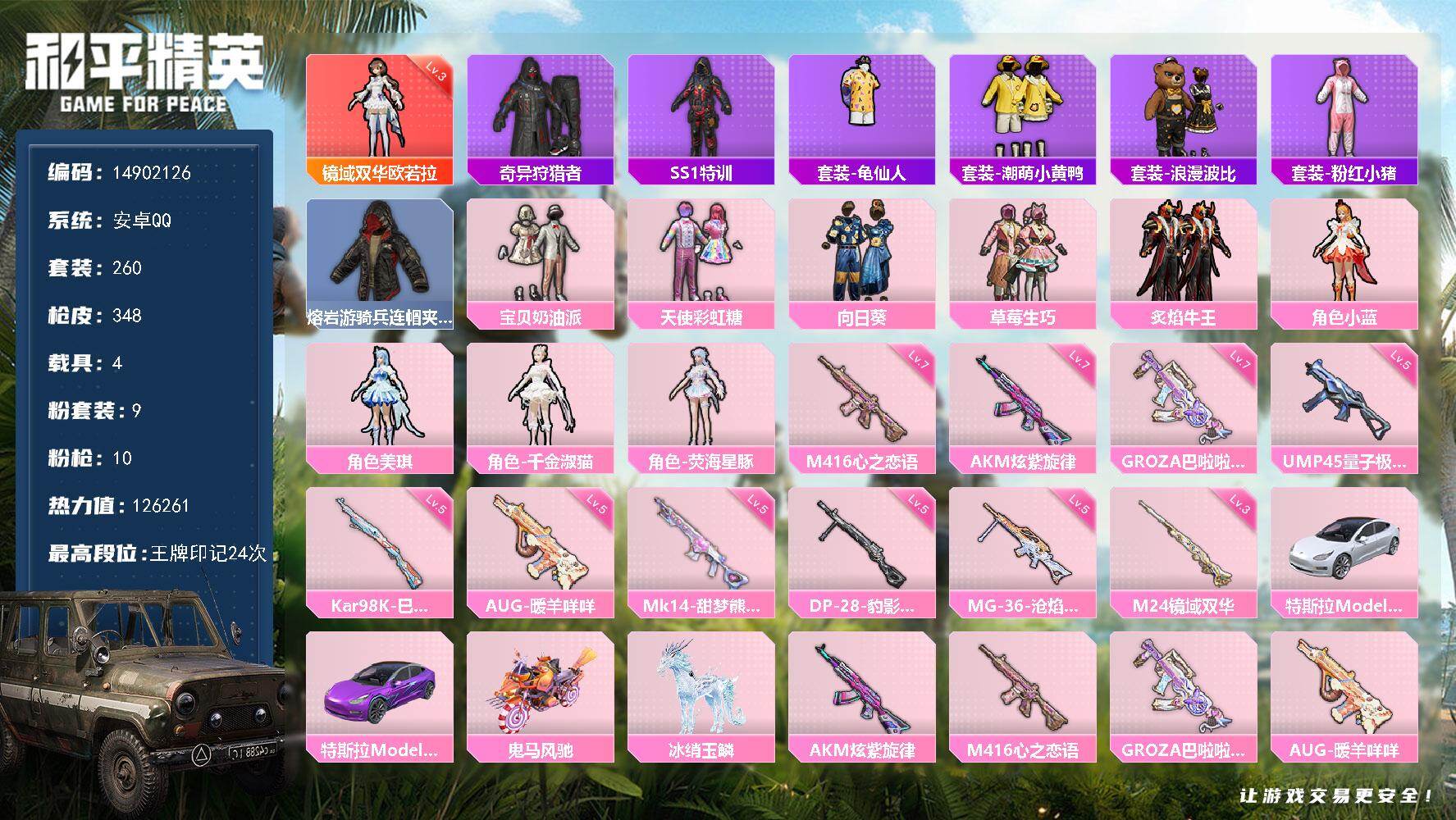 [15391675]das9032 可二次 安卓q-1红装2稀有4载具9粉装10特效呛32热门260套装348呛皮 126261热力值 24印记 历史传奇王牌16星 镜域双华-欧若拉 3级 奇异狩猎者 s1赛事外套 宝贝奶油派 天使彩虹糖 ss1特训 m24-镜域双华 3级 【1红装】 镜域双华-欧若拉 3级 【2稀有】 奇异狩猎者 s1赛事外套 【4载具】 特斯拉3紫色 冰绡玉鳞 特斯拉3白色 鬼马风驰 【9粉装】 小蓝 美琪 宝贝奶油派 天使彩虹糖 千金淑猫 荧海星豚 向日葵 草莓生巧 炙焰牛王 【10特效呛】 m416-心之恋语 7级 akm-炫紫旋律 7级 kar98k-巳巳如意 5级 mg-36-沧焰双生 5级 dp-28-豹影疾电 5级 aug-暖羊咩咩 5级 ump45-量子极限 5级 mk14-甜梦熊击 5级 m24-镜域双华 3级 groza-巴啦啦小魔仙 7级 【32热门】 龟仙人 雪山精英 潮萌小黄鸭 绯红秘境 蔷薇魔法师 兔兔白日梦 大橘为重 浪漫波比 神秘黑猫 暗夜契约 ss1特训 醒狮腾龙 团圆交子 瑞龙福将 纯白誓言 粉红小猪 梦之呓语 薄荷蓝莓 抹茶蜜豆 玄武圣者 娴静芝兰 机械英豪 破蛋小黄鸡 风华少年志 白月香洋装 黑色刀锋 m416-快乐主宰 m762-奇异狩猎者 m762-瑞龙福将 m24-奇异狩猎者 m249-古堡领主 s686-奇异狩猎者 【4飞行器】 夏日绵绵冰飞行器 齐天大圣飞行器 繁龙极客飞行器 pel轰鸣竞梦者飞行器 【6头盔】 九霄头盔 精灵迷巫头盔 甜心宝贝头盔 百万伏特头盔 金风玉露头盔 夏日绵绵冰头盔 【10背包】 九霄背包 梦幻火箭背包 甜心宝贝背包 百万伏特背包 深海曼妙背包 神秘黑猫背包 古堡领主背包 心之恋语背包 马卡龙背包 夏日绵绵冰背包