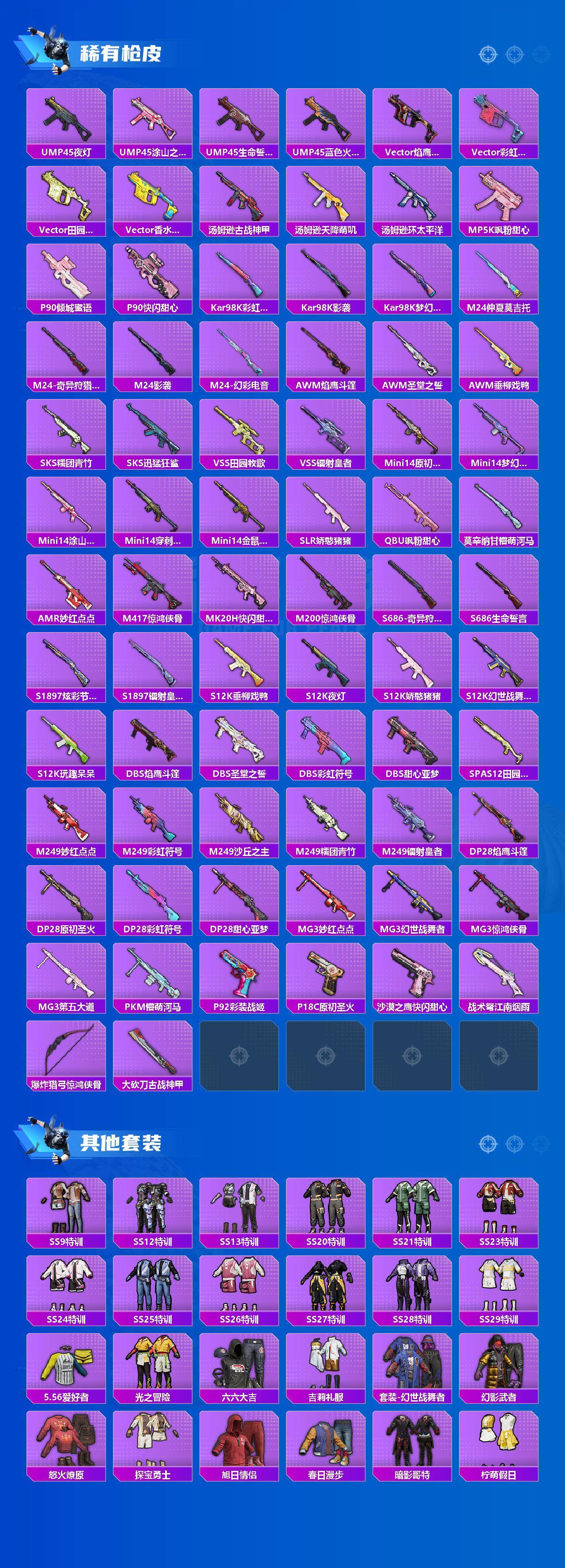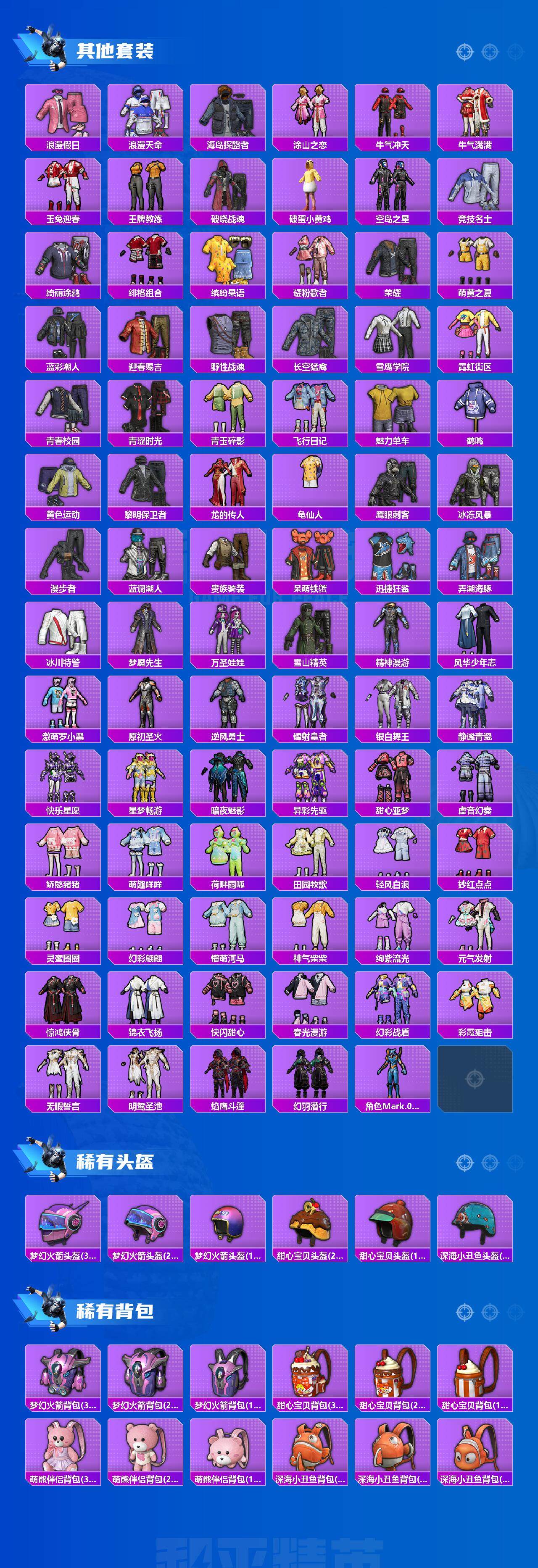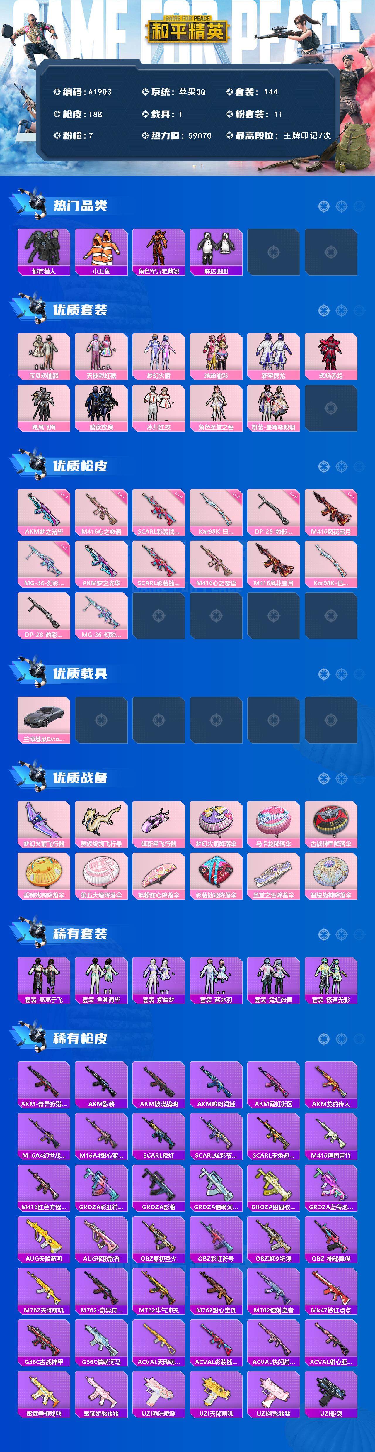[15391825]苹果【小号/梦幻火箭/缤纷油彩/都市猎人/暗影哥特/蓝螳螂/萌熊伴侣背包】 手q-11粉装-7特效呛-1载具-4粉色飞行器-59070热力值-7王牌印记-144套装-188呛皮 【热门品类】:粉装-梦幻火箭,粉装-缤纷油彩,套装-浪漫天命,套装-都市猎人,套装-小丑鱼,角色-军刀雅典娜,套装-胖达圆圆,套装-龟仙人,套装-暗影哥特,角色-mark.06 【粉色套装】:粉装-宝贝奶油派,粉装-天使彩虹糖,粉装-梦幻火箭,粉装-缤纷油彩,粉装-新星烈龙,粉装-炙焰赤龙,粉装-飓风飞鹰,粉装-暗夜玫瑰,粉装-冰川红玫,角色-圣堂之誓,粉装-星穹咏叹调 【粉色呛皮等级】:akm-梦之光华七级,scar-l-彩装战姬六级,m416-心之恋语七级,m416-风花雪月一级,kar98k-巳巳如意五级,dp-28-豹影疾电五级,mg-36-幻彩电音一级 【粉色载具】:兰博基尼estoque(银翼灰) 【粉色呛皮】:akm-梦之光华,scar-l-彩装战姬,m416-心之恋语,m416-风花雪月,kar98k-巳巳如意,dp-28-豹影疾电,mg-36-幻彩电音 【粉色飞行器】:梦幻火箭飞行器,黄族统领飞行器,超新星飞行器 【粉色降落伞】:梦幻火箭降落伞,马卡龙降落伞,古战神甲降落伞,垂柳戏鸭降落伞,第五大道降落伞,飒粉甜心降落伞,彩装战姬降落伞,圣堂之誓降落伞,智耀战神降落伞 【稀有套装】:套装-龟仙人,套装-雪国风尚,套装-燕燕于飞,套装-鱼渊荷华,套装-紫幽梦,套装-蓝冰羽,套装-霓虹热舞,套装-极速光影,套装-炫彩糖果 【稀有呛皮】:akm-奇异狩猎者,akm-影袭,akm-破晓战魂,akm-缤纷海域,akm-霓虹街区,akm-龙的传人,m16a4-幻世战舞者,m16a4-甜心亚梦,scar-l-夜灯,scar-l-炫彩节奏,scar-l-玉兔迎春,m416-糯团青竹,m416-红色方程式,groza-彩虹符号,groza-影袭,groza-懵萌河马,groza-田园牧歌,groza-蓝莓炮弹,aug-天降萌叽,aug-耀粉歌者,q-原初圣火,q-彩虹符号,q-潮汐统领,q-神秘黑猫,m762-天降萌叽,m762-奇异狩猎者,m762-牛气冲天,m762-甜心宝贝,m762-镭射皇者,mk47-妙红点点,g36c-古战神甲,g36