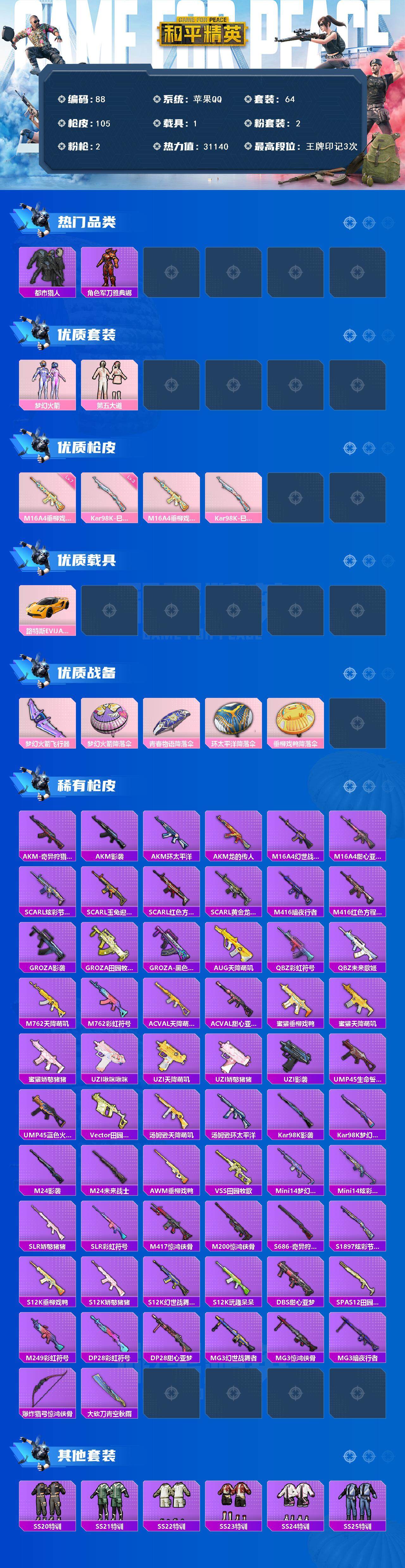 【1载具2粉装2特效 梦幻火箭 都市猎人】苹果q-1稀有1载具2粉装2特效呛9热门64套装105呛皮 31140热力值 3印记 历史超级王牌8星 【1稀有】 都市猎人 【1载具】 路特斯ev黄色 【2粉装】 梦幻火箭 第五大道 【2特效呛】 kar98k-巳巳如意 3级 m16a4-垂柳戏鸭 7级 【9热门】 mark.06 龟仙人 萌神柯基 鹰眼刺客 漫步者 军刀雅