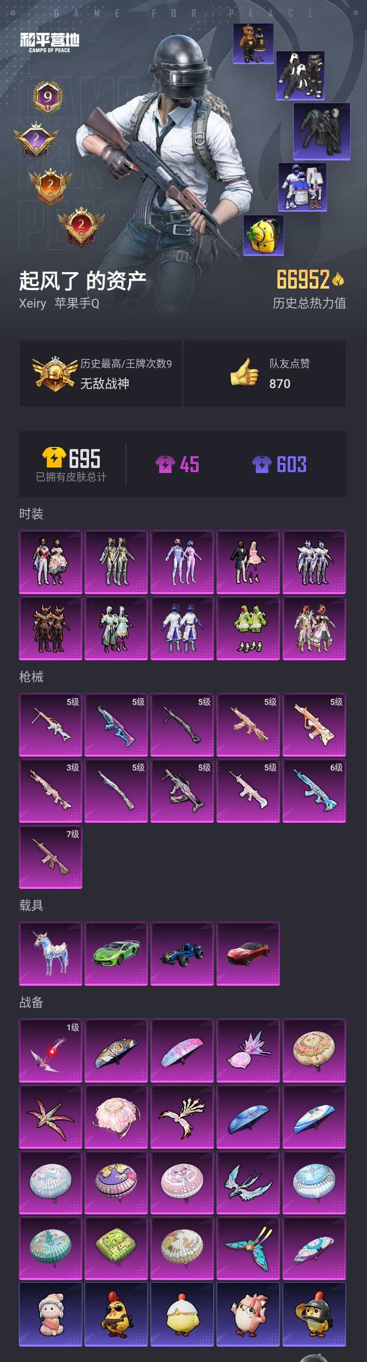 【和平精英】【lyhp19598】ss35无敌战神 6w6热力值2绝世【780璀璨碎片】10粉装11特效呛4载具 梦幻火箭 都市猎人 小白龙 绚金战神 浪漫天命 胖达 浪漫波比 满级恋语m4 满级aug 星空马 兰博基尼 10粉装,11特效呛,4载具,历史最高段位:无敌战神 王牌印记9次 热力值:66952,140套装,187呛械,231装备,106战备;套装:套装-梦幻火箭,套装-新星烈龙,套装-心之恋语,套装-绚金战神,套装-绮梦青鸾,套装-蜜桃特工,套装-恐龙拽拽,套装-赤焰黑爵,套装-紫电风暴,套装-星穹咏叹调,套装-特训学院,套装-黑色伏地魔,套装-骑行爱好者,套装-竞技名士,套装-湖蓝色名流,套装-猛禽,套装-长空猛禽,套装-漫步者,套装-旭日情侣,套装-都市猎人,套装-浪漫天命,套装-特殊使命,套装-甜蜜告白,套装-春日漫步,套装-燃烧卡路里,套装-鹰眼刺客,套装-冰冻风暴,套装-酷萌兔限定,套装-怒火燎原,套装-决胜时刻,套装-魅力单车,套装-s6赛事,套装-竞技达人朋克,套装-都市漫游者,套装-荣耀,套装-沙漠兵团,套装-雪山精英,套装-金耀舞者,套装-暗影哥特,套装-夏日倾情,套装-甜蜜熊情侣,套装-缤纷果语,套装-冰川特警,套装-胖达团团,套装-格斗先锋,套装-海上生明月,套装-麻辣教官,套装-黑夜传说,套装-粉红小猪,套装-疯狂小兔子,套装-ss5特训,套装-浪漫波比,套装-军械专家,套装-ss6特训,套装-淡雅花蕊,套装-玲珑飞花,套装-ss10特训,套装-软萌银虎,套装-海洋之心,套装-夏日音浪,套装-风华少年志,套装-顽皮玉兔,套装-驯鹿叮当,套装-牛气满满,套装-ss11特训,套装-玄武圣者,套装-原初圣火,套装-逆风勇士,套装-战术大师,套装-ss12特训,套装-牛气冲天,套装-ss18特训,套装-镭射皇者,套装-银白舞王,套装-飞行日记,套装-ss13特训,套装-梦起落英,套装-星河入梦,套装-ss14特训,套装-水晶王族,套装-爆裂葡萄,套装-福星高照,套装-异彩先驱,套装-霓虹极客,套装-ss19特训,套装-极速竞梦,套装-飞驰魅影,套装-音速流光,套装-炫蓝之夏,套装-ss20特训,套装-奶芙汪汪,套装-恶魔喵喵,套装-甜心亚梦,套装-虚音幻奏,套装-ss21特训,套装-萌趣咩咩,套装-娇憨猪猪,套装-玉兔迎春,套装-ss22特训,套装-ss23特训,套装-神气柴柴,套装-懵萌河马,套装-柠萌假日,套装-ss24特训,套装-涂山之恋,套装-ss25特训,套装-香桃花海,套装-ss26特训,套装-ss28特训,角色-极地流光,角色-粉雾星云,套装-街头风暴,套装-异域银装,套装-ss30特训,套装-青团波波,套装-棉花软糖,套装-糖糖葫芦,套装-纯白跃动,套装-绒宝小鹅,套装-ss31特训,套装-鱼渊荷华,套装-燕燕于飞,套装-智谋强哥,套装-ss33特训,套装-巳巳如意,套装-ss32特训,套装-顶瓜瓜,套装-大橘大利,套装-星渊小夜曲,套装-星影赞美诗,套装-元气之梦,套装-ss34特训,套装-擎苍青焰,套装-朱霞炽焰,套装-凌霄紫焰,套装-薄荷星砂,套装-ss35特训,套装-粉黛兰香,套装-ss36特训,套装-萌鸡速递;呛皮:5级akm-梦之光华,akm-灼热熔岩,akm-影袭,akm-春暖花开,akm-霓虹街区,akm-夜灯,akm-涂鸦街区,akm-彩虹符号,akm-霓彩脉冲,g36c-不夜海上花,g36c-绮梦青鸾,g36c-冷魅冰骑,g36c-懵萌河马,g36c-星穹咏叹调,蜜獾-娇憨猪猪,蜜獾-糖糖葫芦,蜜獾-乌木金纹,5级scar-l-甜梦小狐,scar-l-炫彩节奏,scar-l-彩虹符号,scar-l-玉兔迎春,scar-l-乌木金纹,ac-val-甜心亚梦,ac-val-乌木金纹,ac-val-天降萌叽,6级m762-冷魅冰骑,m762-绯红前夜,m762-牛气冲天,m762-镭射皇者,m762-橘柚倾心,m762-天降萌叽,m762-乌木金纹,7级m416-心之恋语,m416-仓鼠灰灰,m416-糯团青竹,m416-乌木金纹,m16a4-生命誓言,m16a4-夜灯,m16a4-甜心亚梦,famas-霓彩脉冲,famas-乌木金纹,q-原初圣火,q-飞驰魅影,5级aug-暖羊咩咩,aug-怪笑疯兔,aug-异域银装,aug-紫晶流影,5级groza-镜光银凌,groza-影袭,groza-春暖花开,groza-异彩先驱,groza-懵萌河马,groza-暮色玫影,arx-凌霄紫焰,mk47-乌木金纹,莫辛纳甘-乌木金纹,莫辛纳甘-懵萌河马,5级kar98k-巳巳如意,kar98k-红色方程式,kar98k-影袭,kar98k-梦幻火箭,kar98k-炫彩节奏,kar98k-飞驰魅影,kar98k-顶峰精英,kar98k-星穹咏叹调,m24-影袭,m24-炫彩节奏,m24-乌木金纹,awm-盛世惊鸿,awm-乌木金纹,win94-萝萝小趴兔,win94-乌木金纹,amr-乌木金纹,svd-霓彩脉冲,m200-乌木金纹,vss-镭射皇者,vss-香桃花海,vss-乌木金纹,sks-金玉无双,sks-炫彩节奏,sks-乌木金纹,3级mk14-盛世惊鸿,mk14-乌木金纹,mk14-薄荷星砂,mini14-金鼠迎春,mini14-春暖花开,mini14-原初圣火,mini14-炫彩节奏,mini14-绮梦青鸾,mini14-异彩先驱,mini14-筑梦精灵,mini14-涂山之恋,mini14-香桃花海,mini14-乌木金纹,m417-玩趣呆呆,slr-娇憨猪猪,slr-霓彩脉冲,mk20-h-星梦奇缘,mk20-h-星途旅人,mk20-h-糖糖葫芦,mk20-h-狂鲨锋刃,mk12-乌木金纹,qbu-不夜海上花,汤姆逊-耀粉歌者,汤姆逊-异彩先驱,汤姆逊-甜梦小狐,汤姆逊-星梦奇缘,汤姆逊-乌木金纹,p90-飞驰魅影,p90-巳巳如意,p90-乌木金纹,mp5k-异彩先驱,uzi-生命誓言,uzi-红色方程式,uzi-影袭,uzi-娇憨猪猪,uzi-盛世惊鸿,uzi-炫彩糖果,js9-凌霄紫焰,vect-彩虹符号,vect-燕燕于飞,ump45-春暖花开,ump45-海盐豹豹,ump45-糖糖葫芦,ump45-绒宝小鹅,5级aks-74u-星穹咏叹调,aks-74u-乌木金纹,野牛-燕燕于飞,野牛-乌木金纹,s686-生命誓言,s686-不夜海上花,s686-巳巳如意,spas-12-燕燕于飞,spas-12-狂鲨锋刃,spas-12-乌木金纹,s1897-百万伏特,s1897-春暖花开,s1897-镭射皇者,s1897-绮梦青鸾,s1897-飞驰魅影,s12k-夜灯,s12k-娇憨猪猪,s12k-霓彩脉冲,dbs-甜心亚梦,5级mg-36-沧焰双生,mg-36-凌霄紫焰,mg3-甜梦小狐,mg3-幻世战舞者,mg3-乌木金纹,m249-镭射皇者,m249-冷