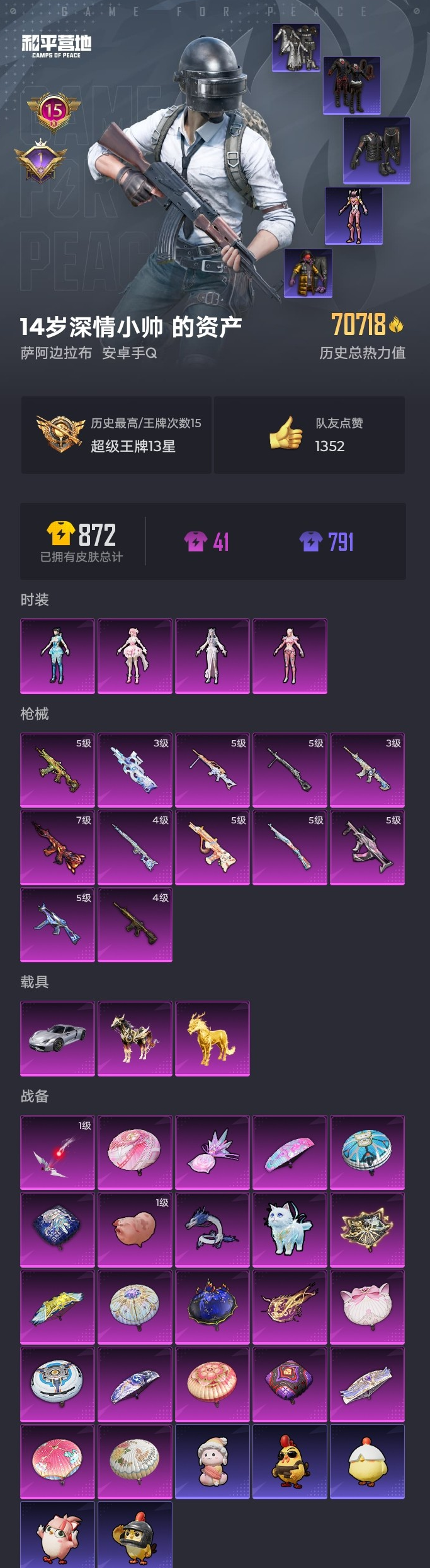 【和平精英】【lyhp19590】15印记4粉装12特效呛3载具 哥特 粉螳螂 3级m4灵猫 7级m4风花雪月 金马 4粉装,12特效呛,3载具,历史最高段位:超级王牌13星 王牌印记15次 热力值:70718,128套装,252呛械,320装备,144战备;套装:角色-守护天翼,角色-异瞳寒姬,角色-冷漠罗丽,角色-奇迹舞步 美雪,套装-黄色运动,套装-黄色伏地魔,套装-竞技名士,套装-湖蓝色名流,套装-黄色名流,套装-猛禽,套装-长空猛禽,套装-冷焰舞者,套装-灼焰舞者,套装-特战装甲,套装-龙腾端午,套装-幻影武者,套装-街头潮人,套装-蓝彩潮人,套装-魅力单车,套装-绮丽涂鸦,套装-耀眼新星,套装-坚韧舞者,套装-破晓战魂,套装-荣耀,套装-热血青春,套装-幻世战舞者,套装-暗影哥特,套装-迅捷狂鲨,套装-缤纷果语,套装-滨海厨神,套装-格斗先锋,套装-麻辣教官,套装-粉红小猪,套装-破蛋小黄鸡,套装-鹤鸣,套装-众神之王,套装-战术大师,套装-牛气冲天,套装-ss18特训,套装-热情海星,套装-纯真浪花,套装-吉莉礼服,套装-福星高照,套装-ss19特训,套装-ss20特训,套装-ss21特训,套装-萌趣咩咩,套装-娇憨猪猪,套装-玉兔迎春,套装-ss22特训,套装-和煦暖阳,套装-田园牧歌,套装-轻风白浪,套装-光之冒险,套装-ss23特训,套装-摩登艾咪,套装-神气柴柴,套装-懵萌河马,套装-灵蜜圈圈,套装-妙红点点,套装-幻彩翩翩,套装-王牌教练,套装-柠萌假日,套装-青玉碎影,套装-ss24特训,套装-荧惑魅影,套装-龟仙人,套装-涂山之恋,套装-ss25特训,套装-惊鸿侠骨,套装-锦衣飞扬,套装-香桃花海,套装-龙的传人,套装-ss26特训,套装-空岛之星,套装-ss28特训,套装暗影刺翼,角色-8号机,角色-mark.06,套装-街头风暴,套装-蝶变,套装-湖畔霞光,套装-ss29特训,套装-雏菊兔兔,套装-萝兰蝴蝶,套装-异域银装,套装-星途旅人,角色-俏兔智灵,套装-ss30特训,套装-青团波波,套装-棉花软糖,角色-夜瞳黯灵,套装-糖糖葫芦,角色-馥郁金蕊,套装-ss31特训,套装-鱼渊荷华,套装-燕燕于飞,套装-紫幽梦,套装-ss33特训,套装-云朵鹅,套装-巳巳如意,套装-ss32特训,套装-彩虹兔,套装-蓝冰羽,套装-雪绒豹,套装-狂鲨锋刃,套装-炫彩糖果,角色-乐音,玩偶服-懒羊羊,套装-元气之梦,套装-ss34特训,套装-擎苍青焰,套装-极光猎影,套装-朱霞炽焰,套装-游乐,套装-凌霄紫焰,套装-薄荷星砂,套装-ss35特训,套装-午间小调,套装-秘语星愿,套装-风迹短诗,套装-琴音绮想,套装-粉黛兰香,套装-画境星梦,套装-阳光菠萝,套装-ss36特训,套装-雪国风尚,套装-萌鸡速递;呛皮:4级m416-五爪金龙,7级m416-风花雪月,3级m416-灵猫魔法师,m416-蓝色火焰,m416-红色方程式,akm-破晓战魂,akm-霓虹街区,akm-夜灯,akm-涂鸦街区,akm-彩虹符号,akm-极光猎影,akm-灵猫魔法师,akm-霓彩脉冲,mk47-乌木金纹,mk47-妙红点点,mk47-极冰使者,mk47-风迹短诗,ac-val-乌木金纹,ac-val-天降萌叽,ac-val-闲梦青缨,5级aug-暖羊咩咩,aug-耀粉歌者,aug-天降萌叽,aug-异域银装,aug-焰舞炽心,aug-金蛇镇世,aug-冰晶雪宝,aug-紫晶流影,q-银碳小老虎,q-萌萌彩虹球,q-纯真浪花,5级groza-镜光银凌,groza-黑色刀锋,groza-田园牧歌,groza-懵萌河马,groza-海盐豹豹,groza-荧海星豚,groza-暮色玫影,m762-彩虹符号,m762-天降萌叽,m762-雏菊兔兔,m762-云朵鹅,scar-l-红色方程式,scar-l-夜灯,scar-l-炫彩节奏,scar-l-银碳小老虎,scar-l-玉兔迎春,scar-l-星途旅人,scar-l-海盐豹豹,scar-l-冷漠罗丽,g36c-懵萌河马,g36c-霁蓝缠春,famas-突变脉冲,famas-霓彩脉冲,famas-乌木金纹,蜜獾-娇憨猪猪,蜜獾-天降萌叽,蜜獾-糖糖葫芦,蜜獾-绯穹魔姬,蜜獾-青瓷战姬,蜜獾-风迹短诗,蜜獾-冰澜龙吟,蜜獾-乌木金纹,ace32-画境星梦,m16a4-蓝色火焰,m16a4-红色方程式,m16a4-冰河战士,arx-凌霄紫焰,5级kar98k-巳巳如意,kar98k-红色方程式,kar98k-影袭,kar98k-彩虹符号,kar98k-炫彩节奏,kar98k-顶峰精英,m24-炫彩节奏,m24-乌木金纹,4级svd-月影灵韵,svd-冷漠罗丽,svd-云朵鹅,m200-仲夏莫吉托,m200-惊鸿侠骨,m200-乌木金纹,莫辛纳甘-乌木金纹,莫辛纳甘-银碳小老虎,莫辛纳甘-懵萌河马,莫辛纳甘-风迹短诗,awm-纯真浪花,amr-妙红点点,amr-鸡智如我,amr-乌木金纹,win94-乌木金纹,slr-娇憨猪猪,slr-墨龙九天,slr-极冰使者,slr-霓彩脉冲,m1加兰德-画境星梦,mini14-穿刺龙虾,mini14-耀粉歌者,mini14-旋转彩虹,mini14-香桃花海,mini14-雏菊兔兔,mini14-绯穹魔姬,mk20-h-星途旅人,mk20-h-糖糖葫芦,mk20-h-圣域龙灵,mk20-h-狂鲨锋刃,mk20-h-乌木金纹,mk14-治愈之星,mk14-乌木金纹,mk14-冰河战士,mk14-紫幽梦,mk14-薄荷星砂,mk14-阳光菠萝,qbu-飒粉甜心,vss-田园牧歌,vss-彩虹符号,vss-香桃花海,mk12-金蛇镇世,mk12-风迹短诗,mk12-乌木金纹,sks-未来歌姬,m417-惊鸿侠骨,uzi-红色方程式,uzi-娇憨猪猪,uzi-冰河战士,uzi-啾咪啾咪,uzi-月影灵韵,uzi-炫彩糖果,5级aks-74u-森灵之息,aks-74u-极光猎影,aks-74u-粉粉喵呜,aks-74u-鸡智如我,aks-74u-乌木金纹,3级p90-魔童闹海 敖丙,p90-玩趣呆呆,p90-巳巳如意,p90-金蛇镇世,p90-乌木金纹,vect-生命誓言,vect-黑色刀锋,vect-田园牧歌,vect-燕燕于飞,5级ump45-量子极限,ump45-夜灯,ump45-蓝色火焰,ump45-仲夏莫吉托,ump45-海盐豹豹,ump45-糖糖葫芦,ump45-绒宝小鹅,ump45-夜幕侵蚀,ump45-极意拳锋,js9-凌霄紫焰,mp5k-彩虹嘻嘻猴,mp5k-画境星梦,mp5k-乌木金纹,野牛-雏菊兔兔,野牛-燕燕于飞,野牛-乌木金纹,汤姆逊-耀粉歌者,汤姆逊-炫彩节奏,汤姆逊-纯真浪花,汤姆逊-灵猫魔法师,s1897-炫彩节奏,s1897-紫幽梦,s1897-糯团青竹,dbs-第五大道,dbs-彩虹符号,dbs-风迹短诗,dbs-乌木金纹,s12k-夜灯,s12k-娇憨猪猪