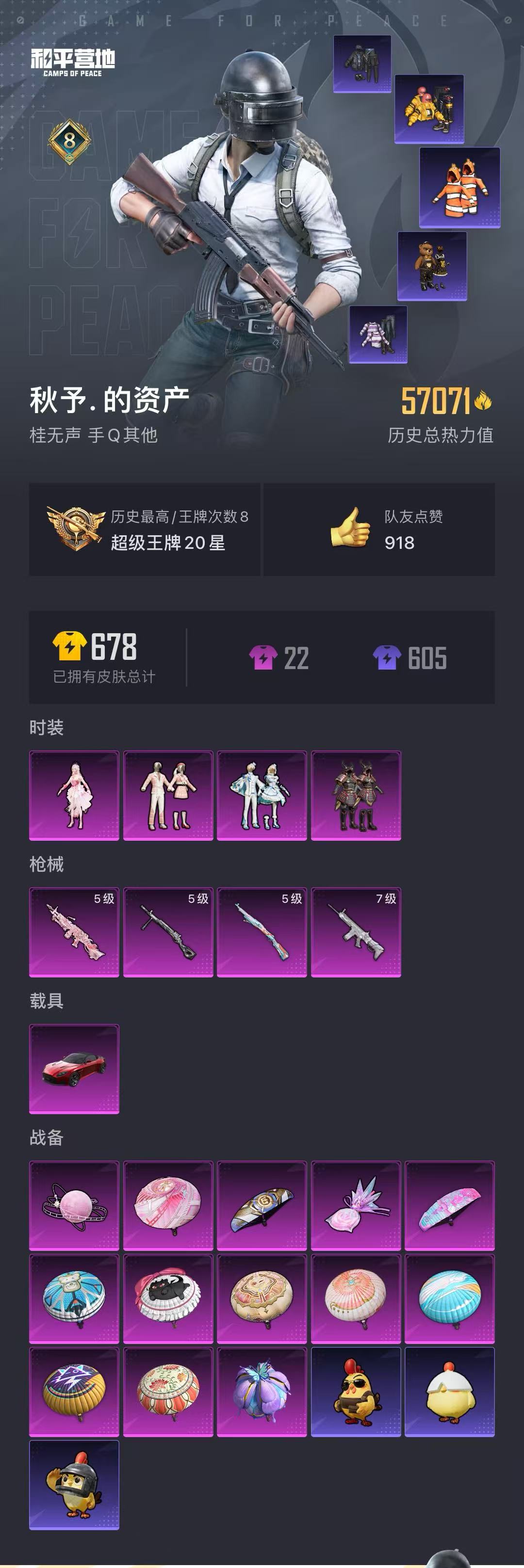 【和平精英】【lyhp19588】4粉装4特效呛1载具 小丑鱼 浪漫波比 第五大道 7级嘶噶 4粉装,4特效呛,1载具,历史最高段位:超级王牌20星 王牌印记8次 热力值:57071,148套装,186呛械,213装备,101战备;套装:套装-铁甲悍将,套装-第五大道,套装-雪月幻音,角色-绝对恒星,套装-特训学院,套装-猎鹰,套装-青年教官,套装-黄色运动,套装-蓝色运动,套装-黄色伏地魔,套装-白色伏地魔,套装-黑色伏地魔,套装-竞技名士,套装-深蓝色名流,套装-湖蓝色名流,套装-猛禽,套装-长空猛禽,套装-竞技勇士朋克,套装-黎明保卫者,套装-雪鹰学院,套装-海岛探路者,套装-旭日情侣,套装-冷焰舞者,套装-灼焰舞者,套装-浪漫天命,套装-战地菁英,套装-贵族骑装,套装-战地督导,套装-突袭者,套装-甜蜜告白,套装-春日漫步,套装-沙漠毒蛇,套装-完美偶像,套装-人气偶像,套装-幻影武者,套装-街头潮人,套装-蓝彩潮人,套装-魅力单车,套装-绮丽涂鸦,套装-耀眼新星,套装-雪山征服者,套装-坚韧舞者,套装-竞技达人朋克,套装-夜莺强袭者,套装-都市漫游者,套装-破晓战魂,套装-雪山精英,套装-幻世战舞者,套装-金耀舞者,套装-蓝调潮人,套装-青涩时光,套装-缤纷果语,套装-冰川特警,套装-元素星魂,套装-极速红龙,套装-海上生明月,套装-小丑鱼,套装-破蛋小黄鸡,套装-疯狂小兔子,套装-机械英豪,套装-机械征服者,套装-ss5特训,套装-浪漫波比,套装-金鼠迎春,套装-北国孤狼,套装-ss6特训,套装-跃动心情,套装-ss7特训,套装-精神漫游,套装-鹤鸣,套装-霓虹街区,套装-海洋之心,套装-ss9特训,套装-顽皮玉兔,套装-薄荷蓝莓,套装-安第斯皇冠,套装-牛气满满,套装-童话森林,套装-梦之呓语,套装-ss11特训,套装-原初圣火,套装-逆风勇士,套装-ss12特训,套装-牛气冲天,套装-ss18特训,套装-镭射皇者,套装-银白舞王,套装-耀粉歌者,套装-科技之星,套装-飞行日记,套装-ss13特训,套装-ss14特训,套装-ss16特训,套装-ss17特训,套装-瑞龙福将,套装-团圆交子,套装-福星高照,套装-遗落祭司,套装-霓虹极客,套装-空投萌叽,套装-ss19特训,套装-ss20特训,套装-ss21特训,套装-玉兔迎春,套装-ss22特训,套装-光之冒险,套装-绯格组合,套装-ss23特训,套装-白兰地假日,套装-柠萌假日,套装-青玉碎影,套装-恋语绒绒,套装-白辉玉蕊,套装-街头风暴,套装-异域银装,角色-蜜桃派对,角色-糖霜甜心,角色-夜瞳黯灵,套装-ss31特训,套装-鱼渊荷华,套装-燕燕于飞,套装-紫幽梦,套装-粉恋花,套装-ss33特训,套装-ss32特训,套装-蓝冰羽,套装-狂鲨锋刃,套装-大橘大利,角色-时希公主,套装-炫彩糖果,套装-星影赞美诗,套装-元气之梦,套装-ss34特训,套装-擎苍青焰,套装-朱霞炽焰,套装-凌霄紫焰,套装-薄荷星砂,套装-ss35特训,套装-午间小调,套装-秘语星愿,套装-风迹短诗,套装-粉黛兰香,角色-超感刻度,角色-甜心蒙太奇,套装-ss36特训,套装-雪国风尚,套装-超能元气,套装-萌鸡速递;呛皮:m16a4-生命誓言,m16a4-红色方程式,m16a4-机械英豪,m16a4-幻世战舞者,mk47-洛神天依,mk47-乌木金纹,mk47-风迹短诗,groza-黑色刀锋,groza-治愈之星,groza-异彩先驱,groza-荧海星豚,akm-灼热熔岩,akm-奇异狩猎者,akm-破晓战魂,akm-霓虹街区,akm-涂鸦街区,akm-霓彩脉冲,q-原初圣火,q-乌木金纹,aug-耀粉歌者,aug-异域银装,aug-绝对恒星,aug-冰晶雪宝,aug-紫晶流影,aug-乌木金纹,m762-奇异狩猎者,m762-牛气冲天,m762-镭射皇者,m762-瑞龙福将,m762-彩虹符号,m762-第五大道,m762-天降萌叽,m762-乌木金纹,m416-夜灯,m416-蓝色火焰,m416-暗夜行者,m416-糯团青竹,g36c-星穹咏叹调,g36c-乌木金纹,7级scar-l-纯梦嫁纱,scar-l-夜灯,scar-l-炫彩节奏,scar-l-彩虹符号,scar-l-玉兔迎春,scar-l-乌木金纹,蜜獾-天降萌叽,蜜獾-风迹短诗,蜜獾-乌木金纹,famas-霓彩脉冲,famas-乌木金纹,arx-凌霄紫焰,ac-val-天降萌叽,win94-夏日绵绵冰,win94-机械英豪,win94-瑞龙福将,win94-乌木金纹,5级kar98k-巳巳如意,kar98k-红色方程式,kar98k-乌木金纹,m24-奇异狩猎者,m24-治愈之星,m24-天降萌叽,m24-乌木金纹,awm-乌木金纹,m200-乌木金纹,莫辛纳甘-乌木金纹,莫辛纳甘-风迹短诗,amr-鸡智如我,mini14-春暖花开,mini14-原初圣火,mini14-耀粉歌者,mini14-异彩先驱,mini14-绯穹魔姬,mini14-乌木金纹,sks-夜灯,sks-心之恋语,sks-炫彩节奏,sks-乌木金纹,mk12-风迹短诗,mk12-乌木金纹,vss-镭射皇者,vss-乌木金纹,mk14-治愈之星,mk14-乌木金纹,mk14-紫幽梦,mk14-薄荷星砂,slr-四圣焕新,slr-霓彩脉冲,mk20-h-狂鲨锋刃,js9-凌霄紫焰,uzi-生命誓言,uzi-红色方程式,uzi-逆行者qq,uzi-匠心至美oppo,uzi-炫彩节奏,uzi-天降萌叽,uzi-啾咪啾咪,uzi-炫彩糖果,mp5k-异彩先驱,ump45-夜灯,ump45-蓝色火焰,ump45-海盐豹豹,aks-74u-粉粉喵呜,aks-74u-鸡智如我,aks-74u-乌木金纹,vect-生命誓言,vect-彩虹符号,vect-治愈之星,vect-燕燕于飞,vect-乌木金纹,野牛-机械英豪,野牛-夜灯,野牛-燕燕于飞,野牛-乌木金纹,汤姆逊-奇异狩猎者,汤姆逊-耀粉歌者,汤姆逊-异彩先驱,汤姆逊-樱桃泡泡,汤姆逊-乌木金纹,s1897-春暖花开,s1897-潮汐统领,s1897-镭射皇者,s1897-紫幽梦,s1897-糯团青竹,spas-12-燕燕于飞,spas-12-狂鲨锋刃,s12k-破晓战魂,s12k-机械英豪,s12k-瑞龙福将,s12k-玩趣呆呆,s12k-智耀战神,s12k-霓彩脉冲,s686-红色方程式,s686-生命誓言,s686-浪客战士,s686-彩虹符号,dbs-风迹短诗,mg-36-凌霄紫焰,mg3-瑞龙福将,mg3-幻世战舞者,mg3-乌木金纹,mg3-第五大道,mg3-霓彩脉冲,5级m249-绝对恒星,m249-破晓战魂,m249-四圣焕新,m249-镭射皇者,m249-彩虹符号,m249-无面战甲,m249-乌木金纹,5