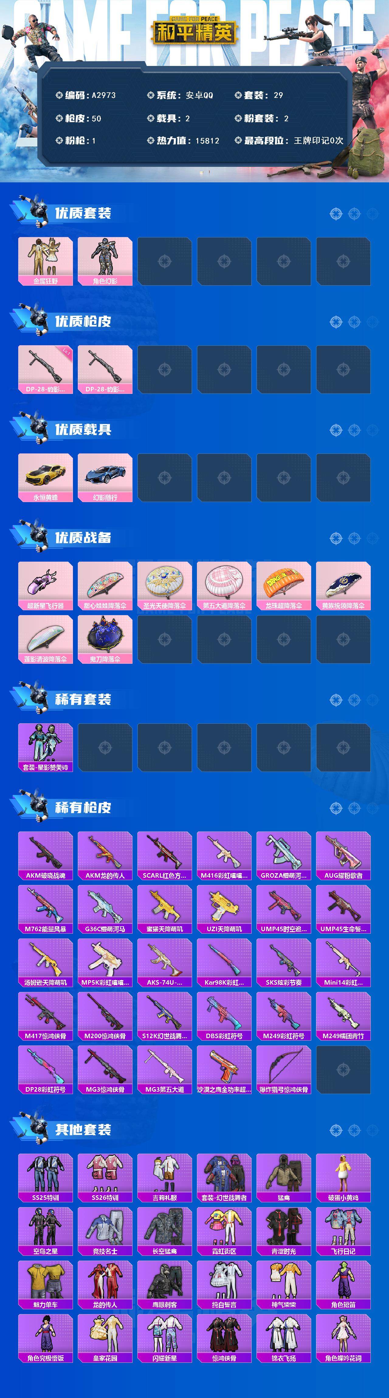 [15410745]安卓【小号】 手q-2粉装-1特效呛-2载具-1粉色飞行器-15812热力值-1王牌印记-29套装-50呛皮 【粉色套装】:粉装-金属狂野,角色-幻影 【粉色呛皮等级】:dp-28-豹影疾电一级 【粉色载具】:永恒黄蜂,幻影随行 【粉色呛皮】:dp-28-豹影疾电 【粉色飞行器】:超新星飞行器 【粉色降落伞】:甜心娃娃降落伞,圣光天使降落伞,第五大道降落伞,龙珠超降落伞,黄族统领降落伞,莲影清波降落伞,鬼刀降落伞 【稀有套装】:套装-星影赞美诗 【稀有呛皮】:akm-破晓战魂,akm-龙的传人,scar-l-红色方程式,m416-彩虹嘻嘻猴,groza-懵萌河马,aug-耀粉歌者,m762-能量风暴,g36c-懵萌河马,蜜獾-天降萌叽,uzi-天降萌叽,ump45-时空追击者,ump45-生命誓言,汤姆逊-天降萌叽,mp5k-彩虹嘻嘻猴,aks-74u-鬼刀,kar98k-彩虹符号,sks-炫彩节奏,mini14-彩虹嘻嘻猴,m417-惊鸿侠骨,m200-惊鸿侠骨,s12k-幻世战舞者,dbs-彩虹符号,m249-彩虹符号,m249-糯团青竹,dp-28-彩虹符号,mg3-惊鸿侠骨,mg3-第五大道,沙墨之鹦-全功率超战,爆炸猎弓-惊鸿侠骨 【其他套装】:套装-ss25特训,套装-ss26特训,套装-吉莉礼服,套装-幻世战舞者,套装-猛禽,套装-破蛋小黄鸡,套装-空岛之星,套装-竞技名士,套装-长空猛禽,套装-霓虹街区,套装-青涩时光,套装-飞行日记,套装-魅力单车,套装-龙的传人,套装-鹰眼刺客,套装-纯白誓言,套装-神气柴柴,角色-短笛,角色-究极悟饭,套装-皇家花园,套装-闪耀新星,套装-惊鸿侠骨,套装-锦衣飞扬,角色-蝶吟花词 【营地id】:949109362