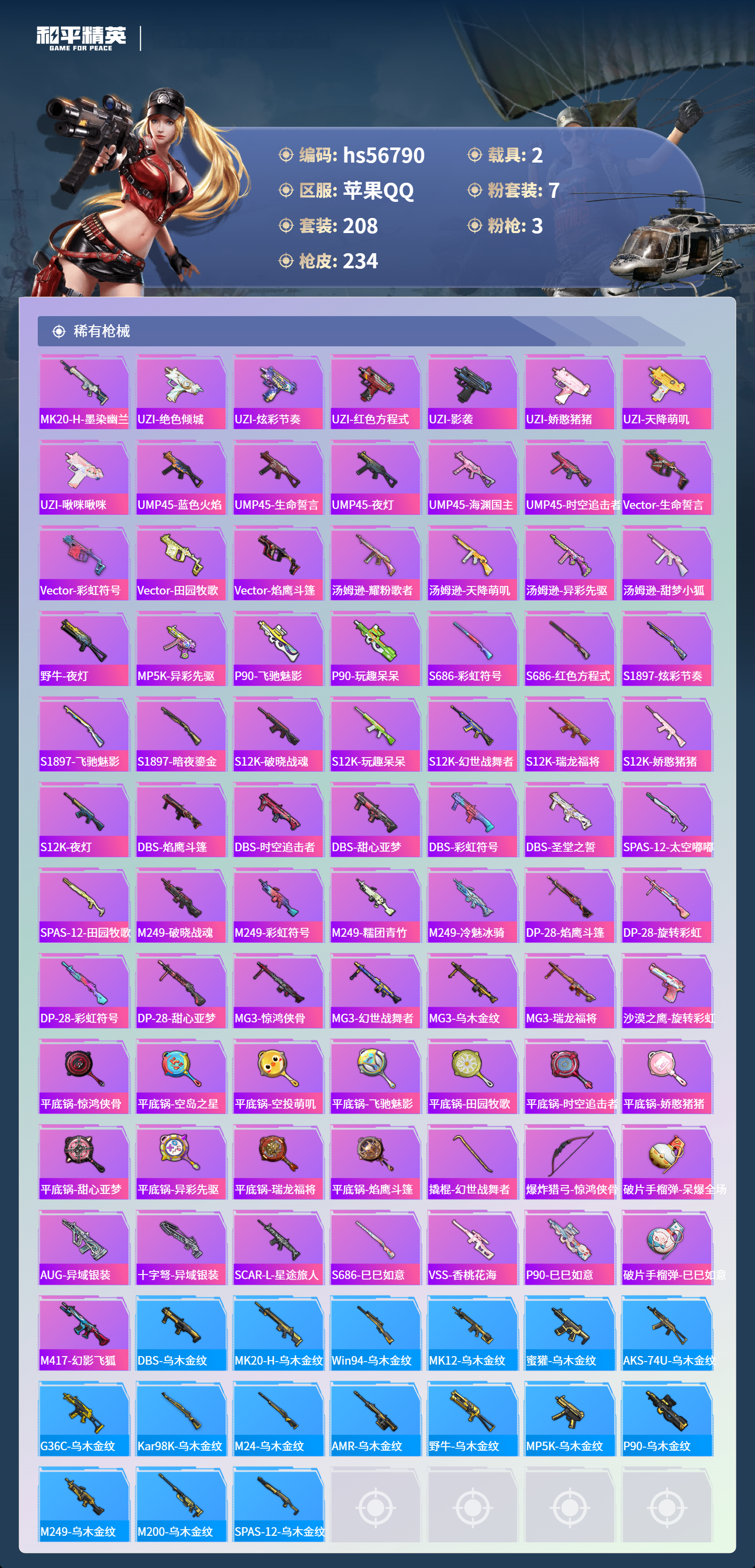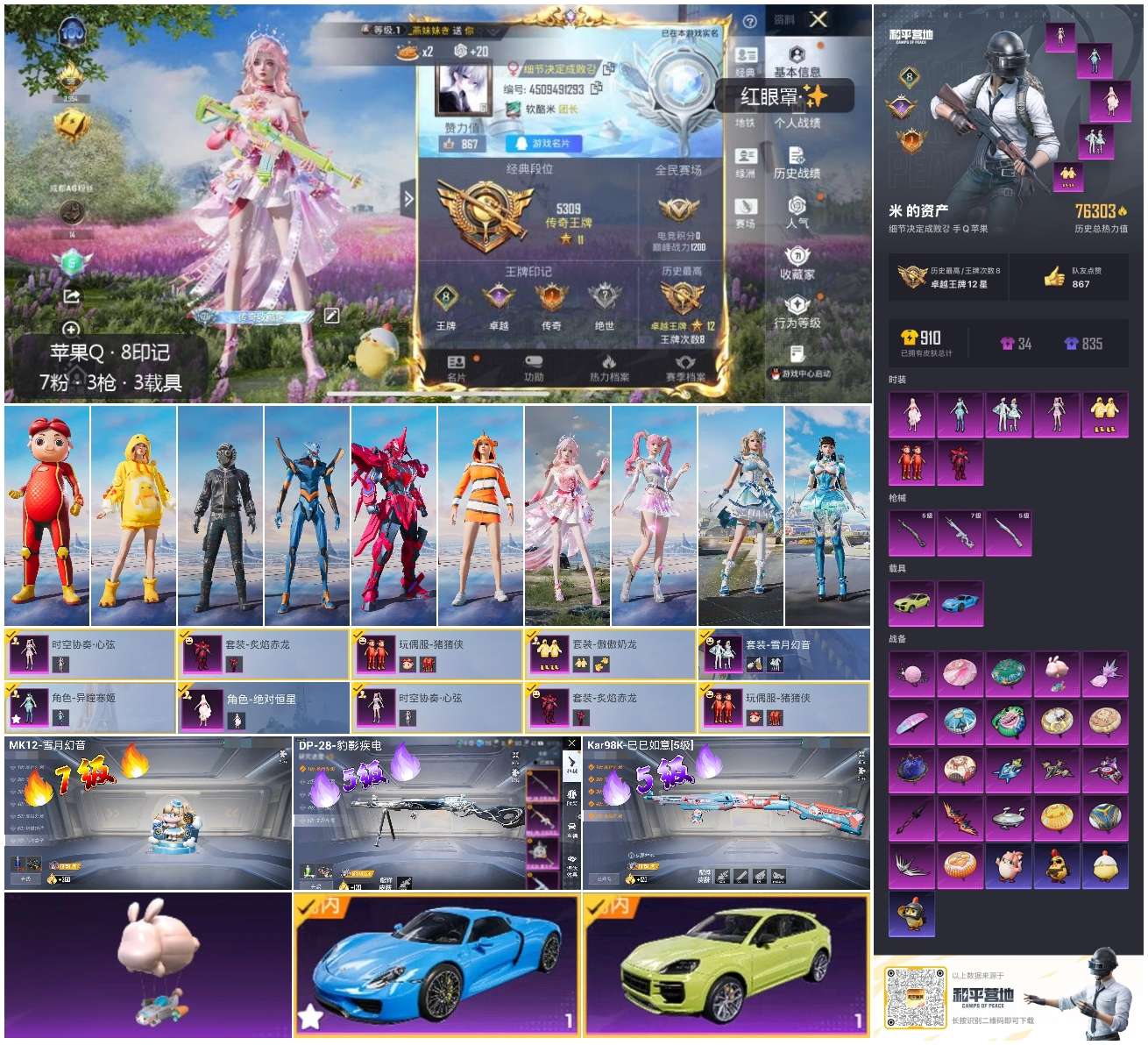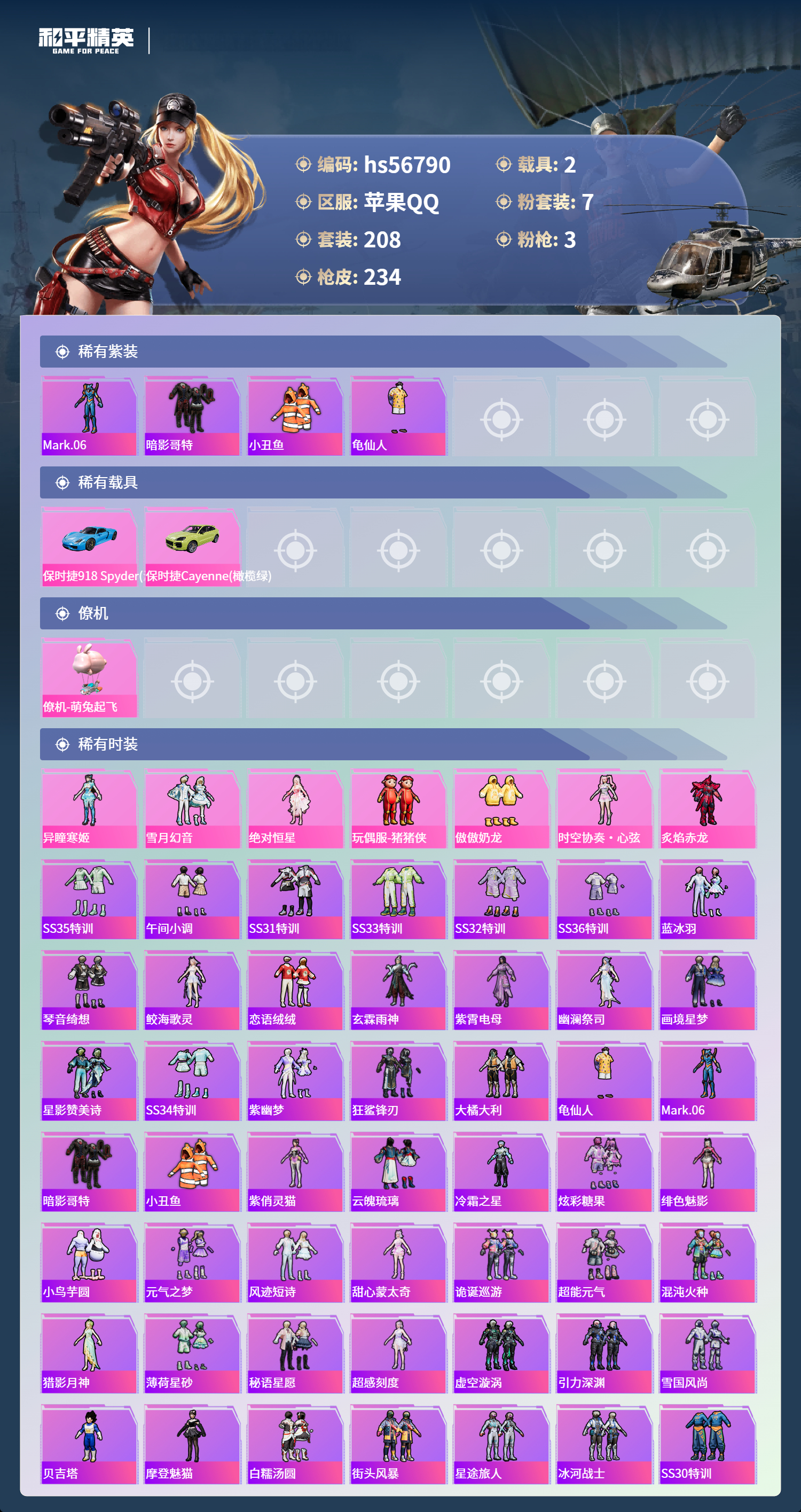 hs56790 苹果手q-8王牌印记-7粉装-3特效呛-2载具-76303热力值-208套装-234呛皮-2卓越印记-1传奇印记【7粉装】角色-异瞳寒姬角色-绝对恒星玩偶服-猪猪侠套装-傲傲奶龙套装-炙焰赤龙套装-雪月幻音时空协奏·心弦【3特效呛】mk12-雪月幻音/7级kar98k-巳巳如意/5级dp-28-豹影疾电/5级【4稀有紫装】mark.06暗影哥特小丑鱼龟仙