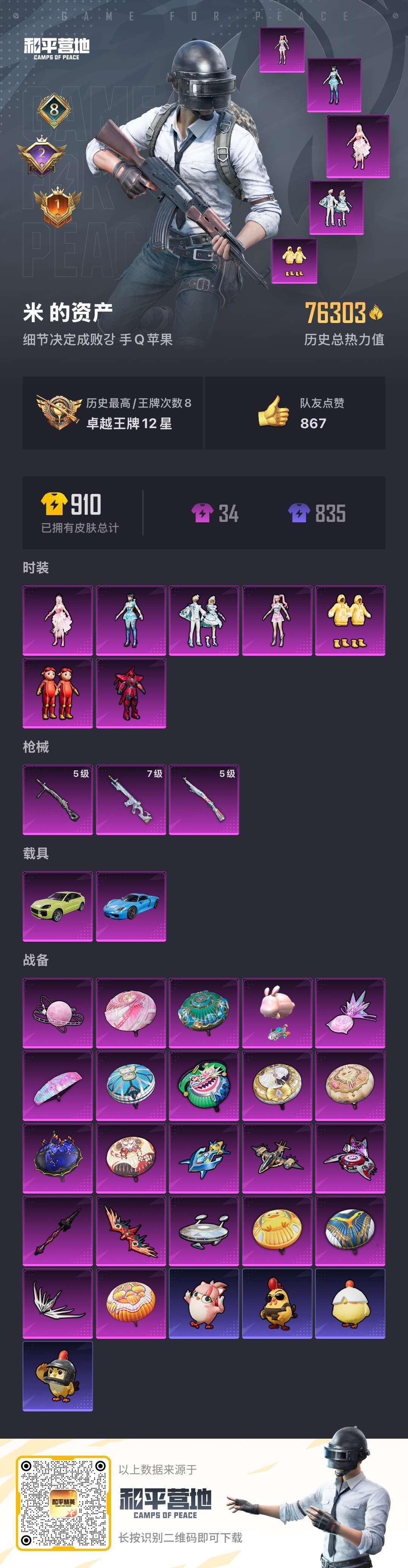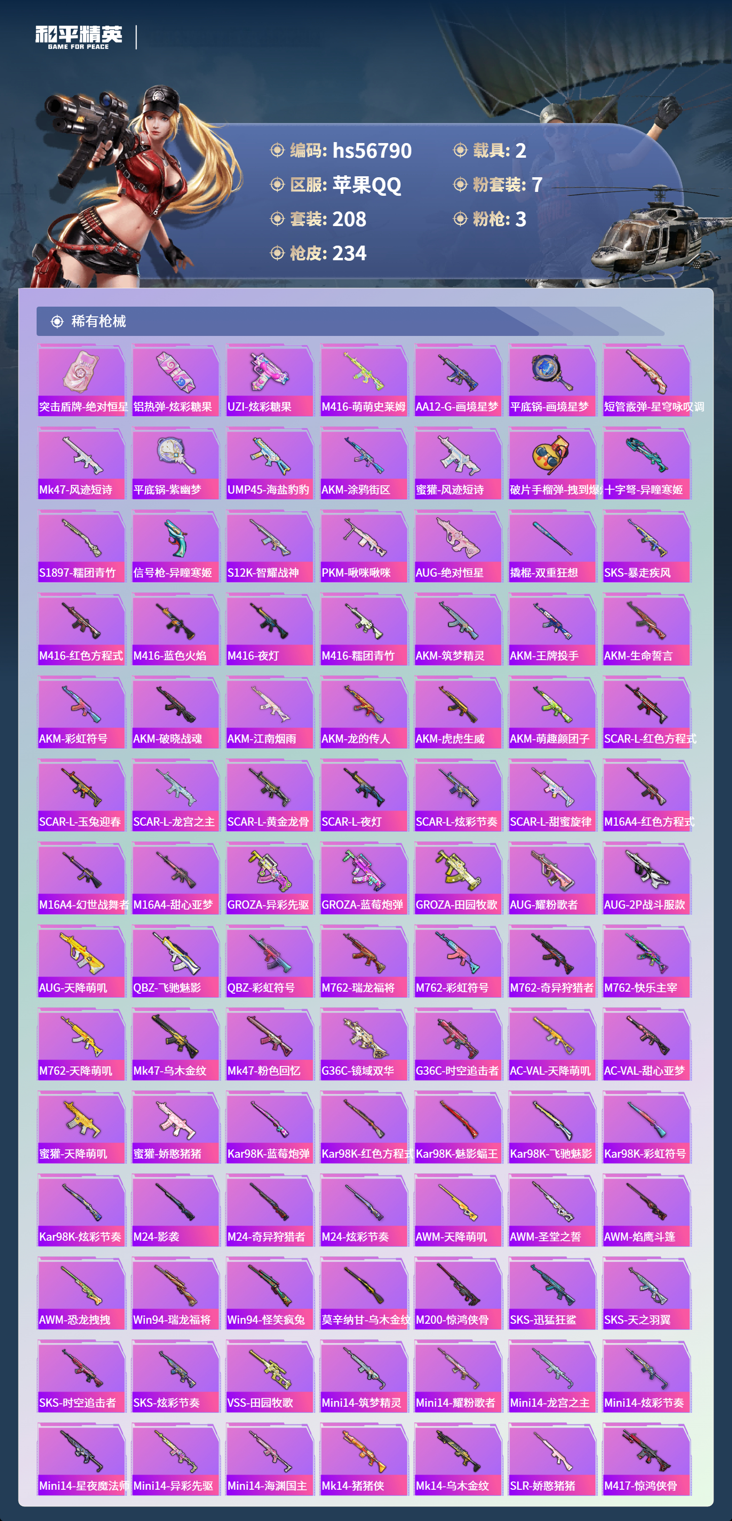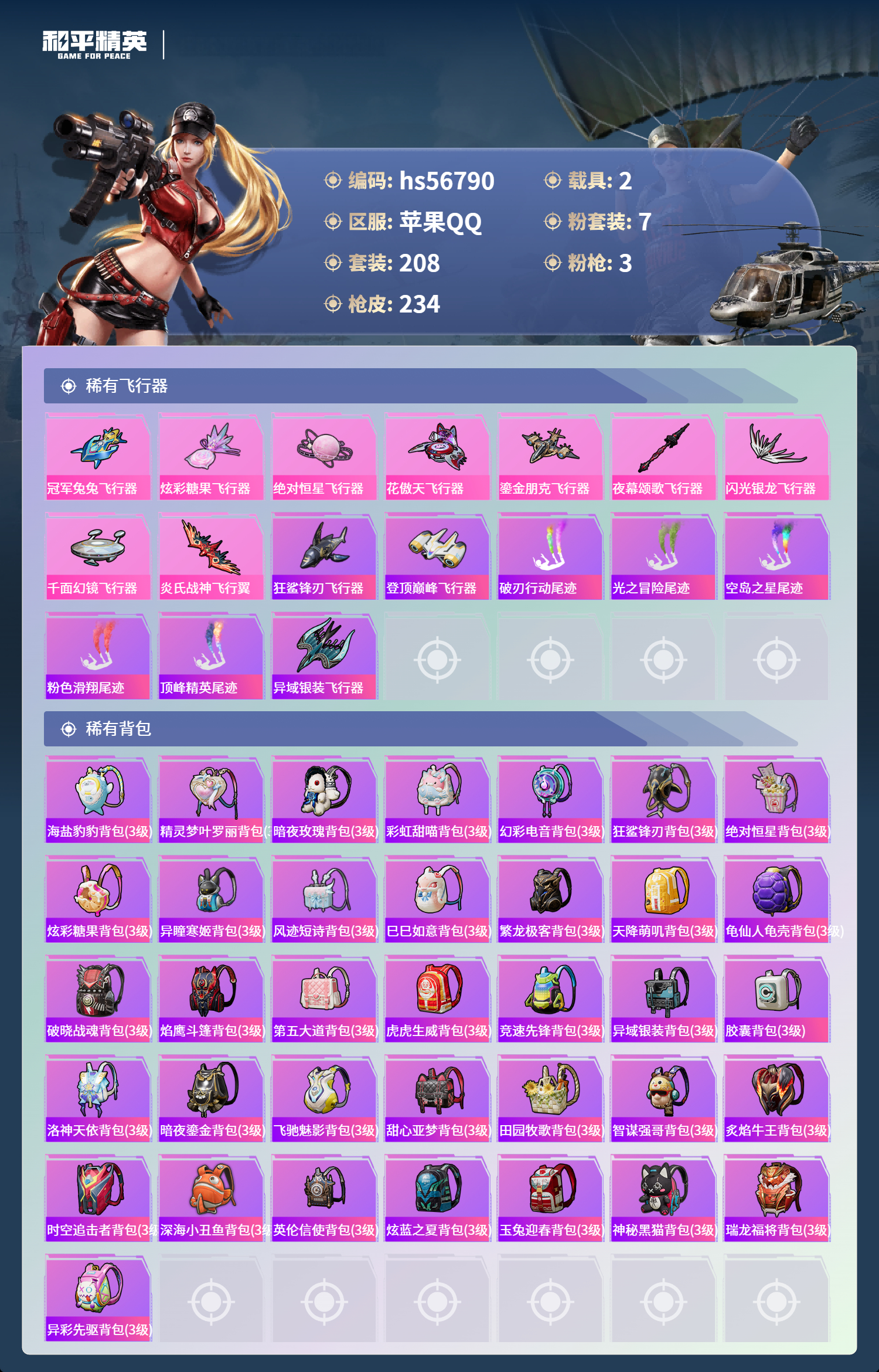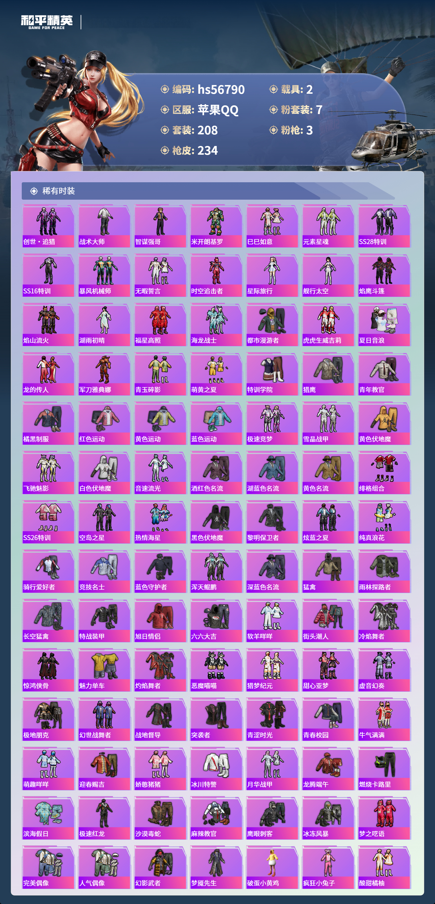 hs56790 苹果手q-8王牌印记-7粉装-3特效呛-2载具-76303热力值-208套装-234呛皮-2卓越印记-1传奇印记【7粉装】角色-异瞳寒姬角色-绝对恒星玩偶服-猪猪侠套装-傲傲奶龙套装-炙焰赤龙套装-雪月幻音时空协奏·心弦【3特效呛】mk12-雪月幻音/7级kar98k-巳巳如意/5级dp-28-豹影疾电/5级【4稀有紫装】mark.06暗影哥特小丑鱼龟仙