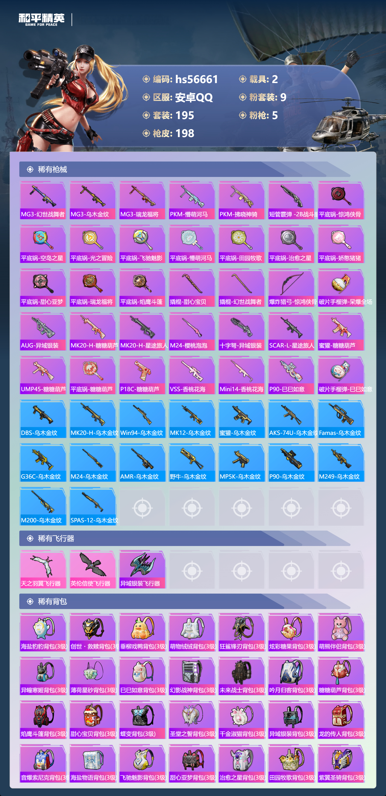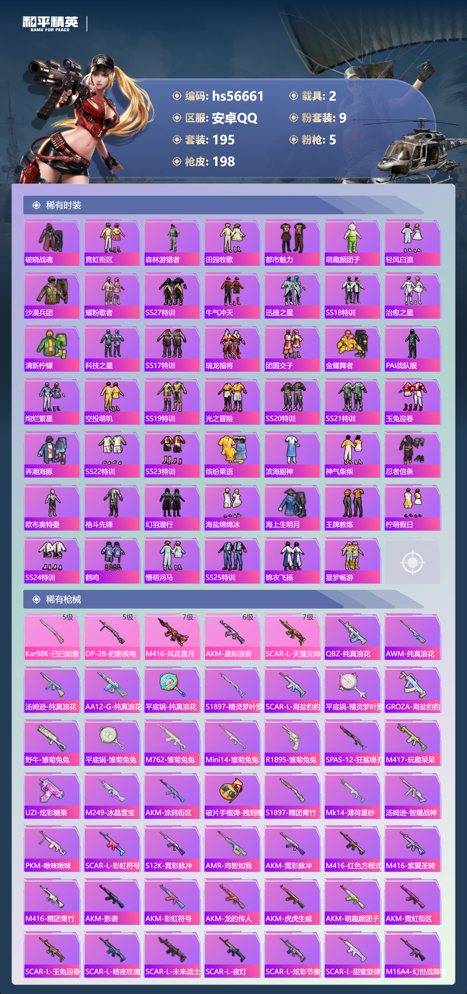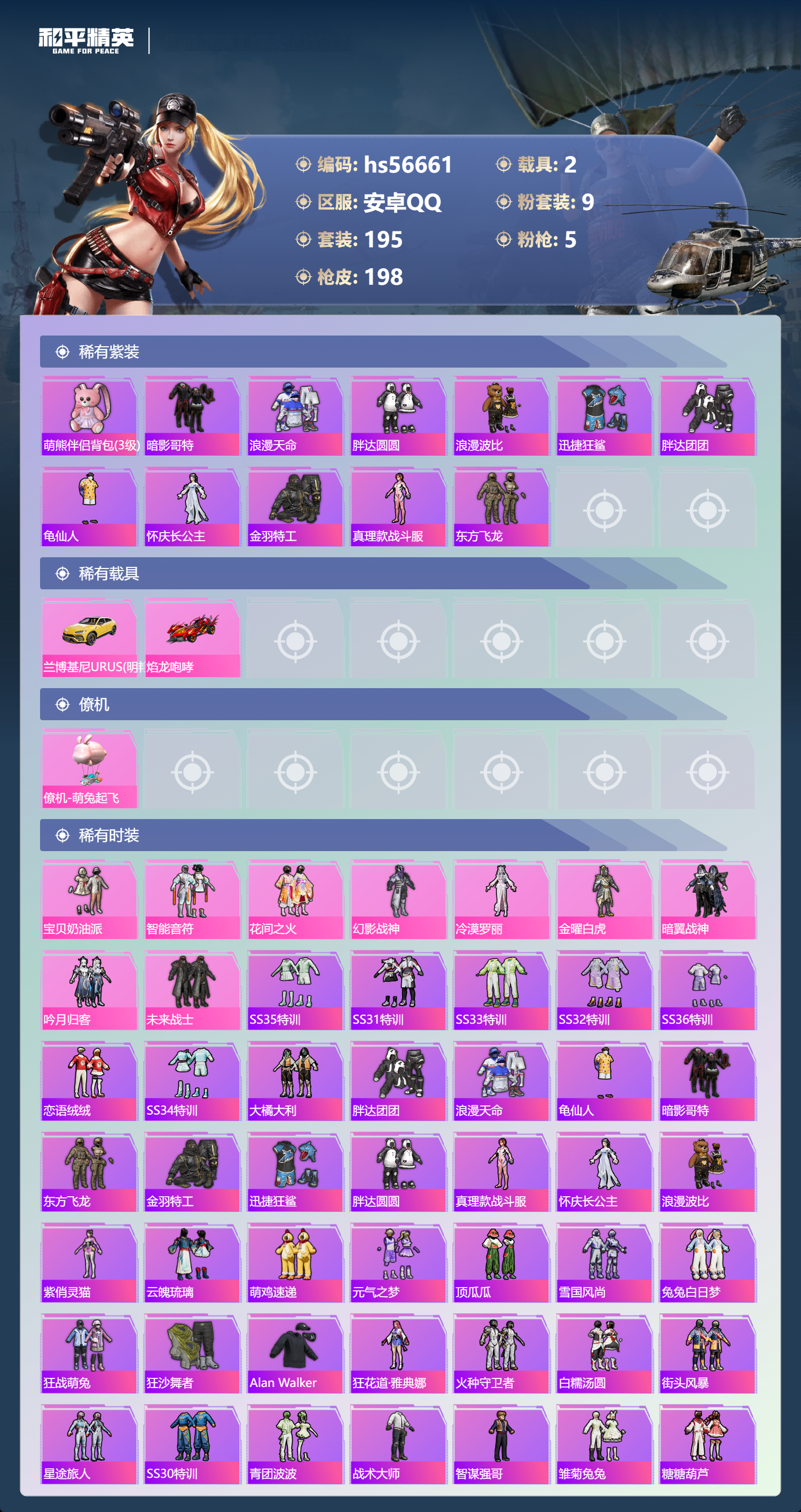 2377730安卓手q-10王牌印记-9粉装-5特效呛-2载具-72761热力值-195套装-198呛皮 【9粉装】套装-未来战士套装-幻影战神套装-花间之火套装-宝贝奶油派套装-吟月归客角色-冷漠罗丽套装-智能音符套装-暗翼战神套装-金曜白虎 【5特效呛】dp-28-豹影疾电/5级kar98k-巳巳如意/5级m416-风花雪月/7级scar-l-天蓬元帅/7级a