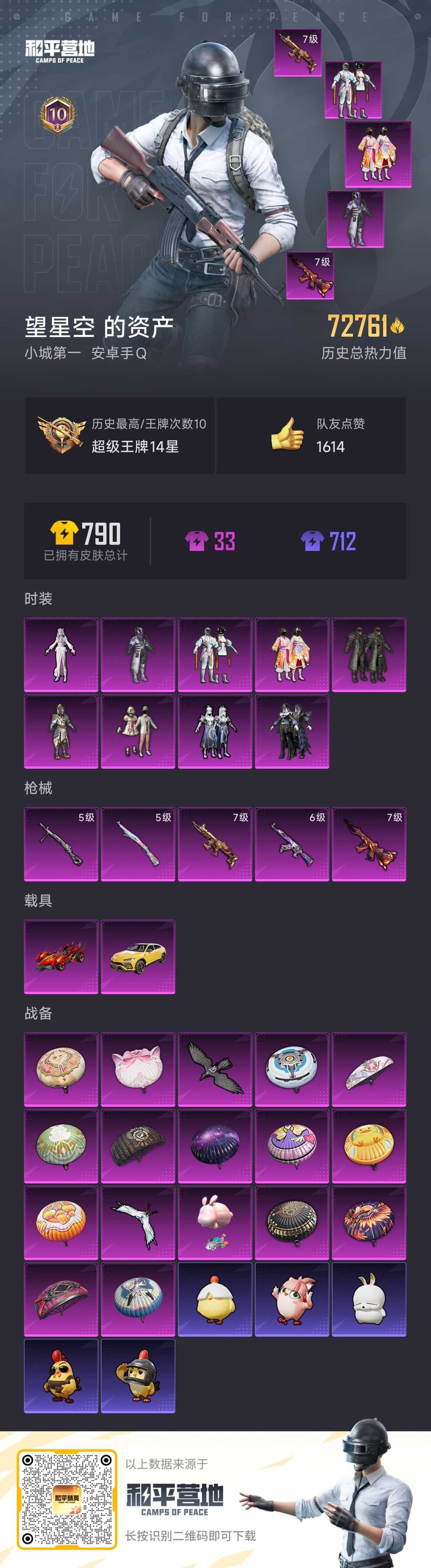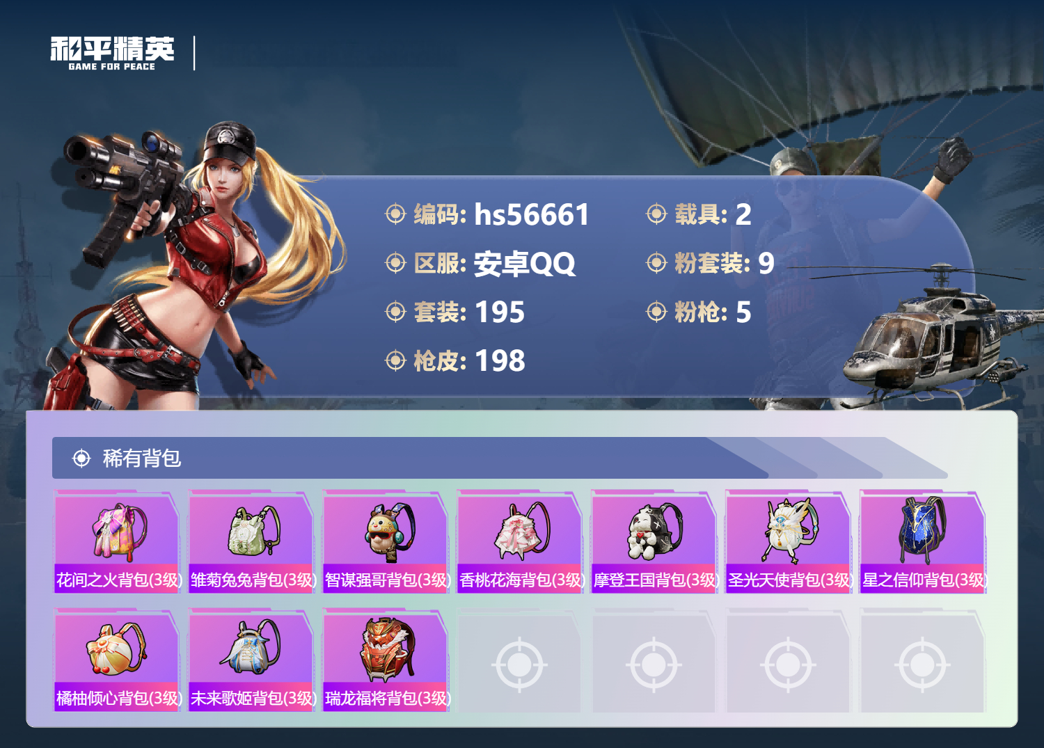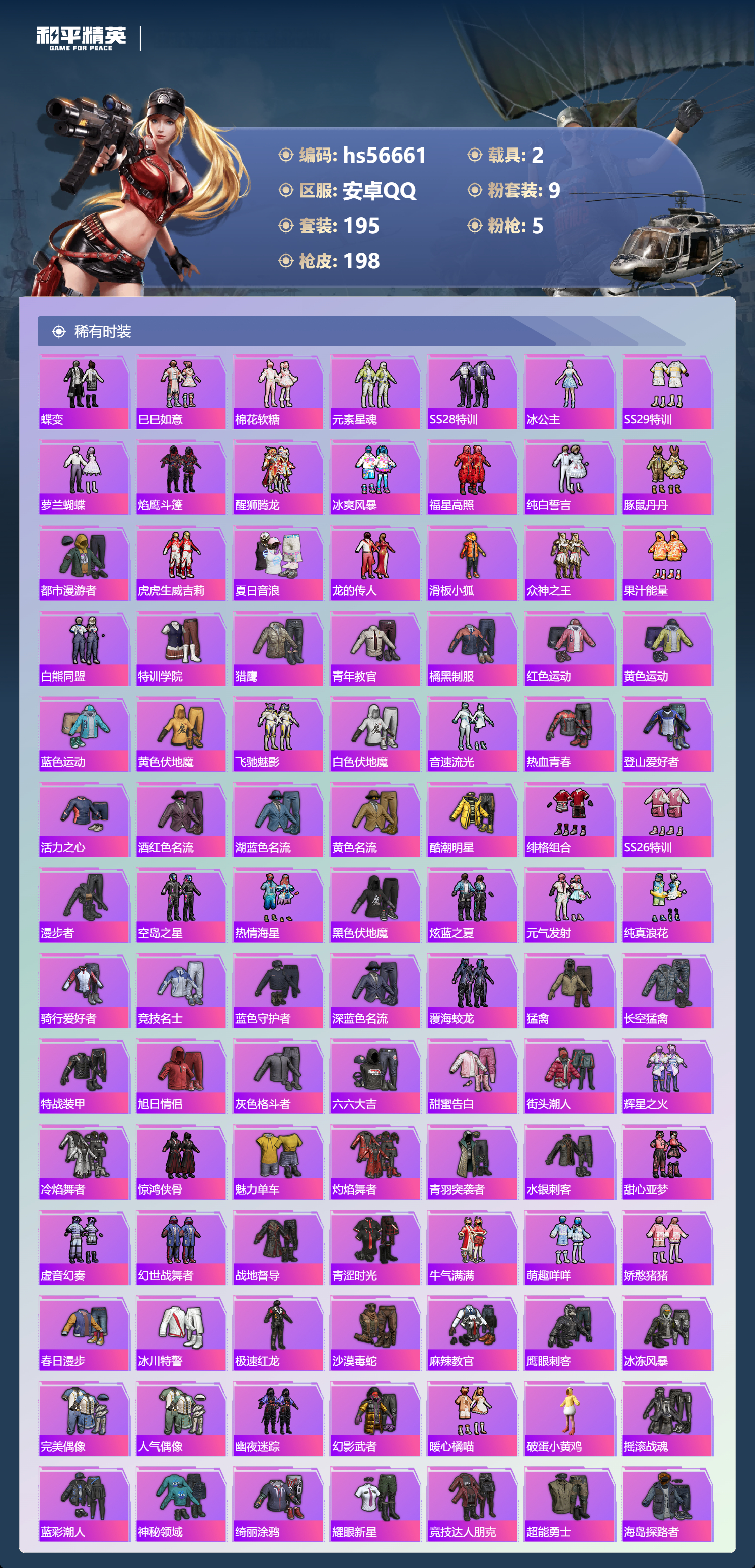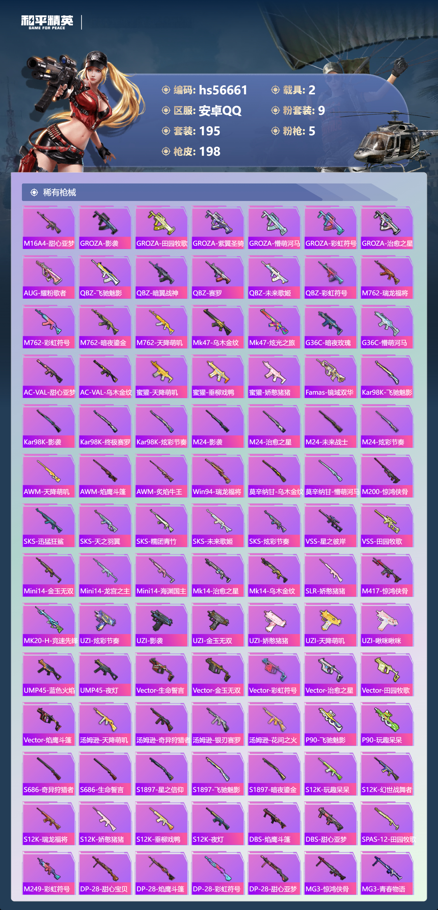 2377730安卓手q-10王牌印记-9粉装-5特效呛-2载具-72761热力值-195套装-198呛皮 【9粉装】套装-未来战士套装-幻影战神套装-花间之火套装-宝贝奶油派套装-吟月归客角色-冷漠罗丽套装-智能音符套装-暗翼战神套装-金曜白虎 【5特效呛】dp-28-豹影疾电/5级kar98k-巳巳如意/5级m416-风花雪月/7级scar-l-天蓬元帅/7级a