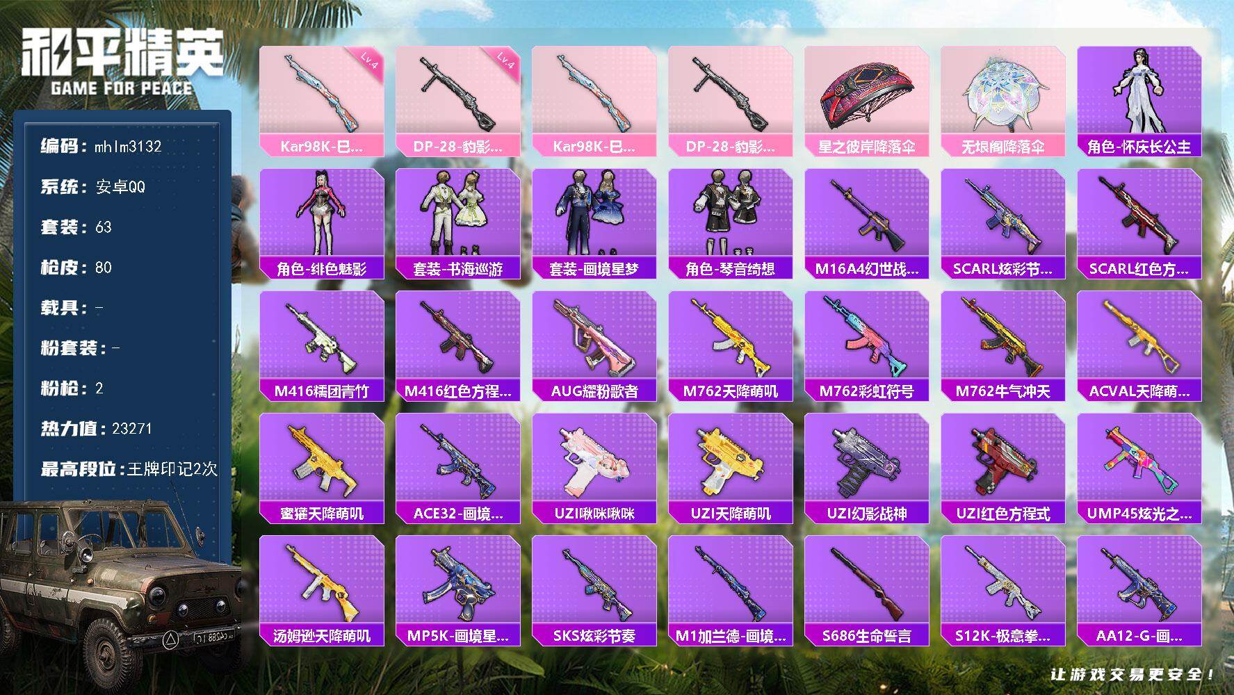 [15414088]【mhlm3132】安卓 手q-0粉装-2特效呛-0载具-1粉色飞行器-23271热力值-2王牌印记-63套装-80呛皮 【粉色呛皮等级】:kar98k-巳巳如意四级,dp-28-豹影疾电四级 【粉色呛皮】:kar98k-巳巳如意,dp-28-豹影疾电 【粉色降落伞】:星之彼岸降落伞,无垠阁降落伞,炫彩糖果降落伞 【稀有套装】:套装-雪国风尚,角色-怀庆长公主,角色-绯色魅影,套装-书海巡游,套装-画境星梦,套装-琴音绮想 【稀有呛皮】:aug-冰晶雪宝,m16a4-幻世战舞者,scar-l-炫彩节奏,scar-l-红色方程式,m416-糯团青竹,m416-红色方程式,aug-耀粉歌者,m762-天降萌叽,m762-彩虹符号,m762-牛气冲天,ac-val-天降萌叽,蜜獾-天降萌叽,ace32-画境星梦,uzi-啾咪啾咪,uzi-天降萌叽,uzi-幻影战神,uzi-红色方程式,ump45-炫光之旅,汤姆逊-天降萌叽,mp5k-画境星梦,sks-炫彩节奏,m1加兰德-画境星梦,s686-生命誓言,s12k-极意拳锋,aa12-g-画境星梦,m249-星之彼岸,dp-28-彩虹符号,mg3-幻世战舞者,平底锅-画境星梦 【其他套装】:套装-ss14特训,套装-ss19特训,套装-ss27特训,套装-ss28特训,套装-ss29特训,套装-人气偶像,套装-冷焰舞者,套装-完美偶像,套装-幻世保卫者,套装-怒火燎原,套装-柠萌假日,套装-森林游猎者,套装-深蓝色名流,套装-湖蓝色名流,套装-灼焰舞者,套装-特战装甲,套装-特训学院,套装-王牌教练,套装-疯狂小兔子,套装-白色伏地魔,套装-破蛋小黄鸡,套装-福星高照,套装-竞技名士,套装-红色运动,套装-绮丽涂鸦,套装-绯格组合,套装-缤纷果语,套装-耀眼新星,套装-蓝色运动,套装-街头潮人,套装-酒红色名流,套装-长空猛禽,套装-青玉碎影,套装-魅力单车,套装-鹤鸣,套装-黄色名流,套装-黄色运动,套装-黑色伏地魔,套装-龙的传人,套装-快乐星愿,角色-银尘,套装-纯真浪花,套装-热情海星,套装-曼妙人鱼 【稀有头盔】:深海小丑鱼头盔1级 【稀有背包】:深海小丑鱼背包3级 【营地id】:712542478